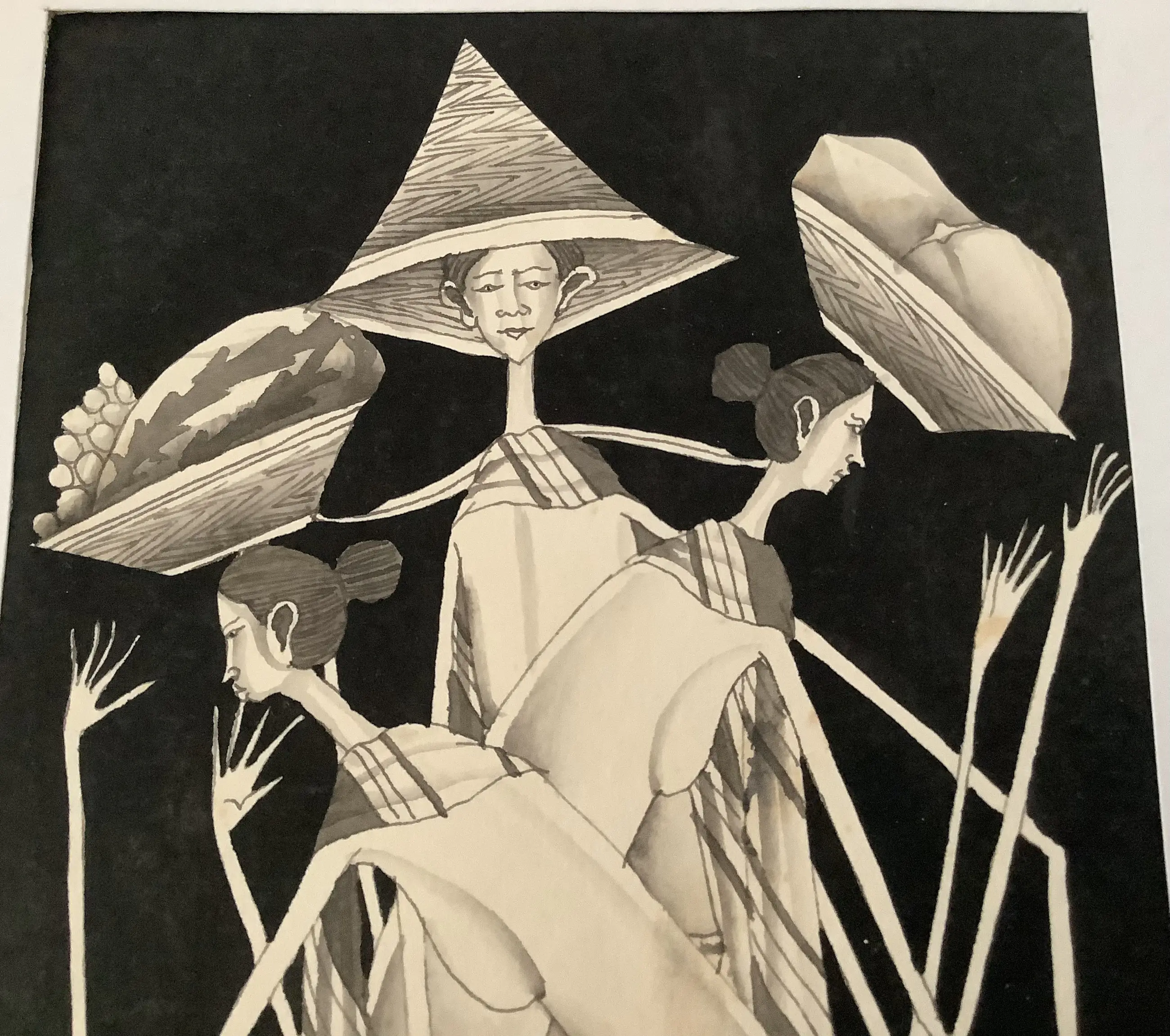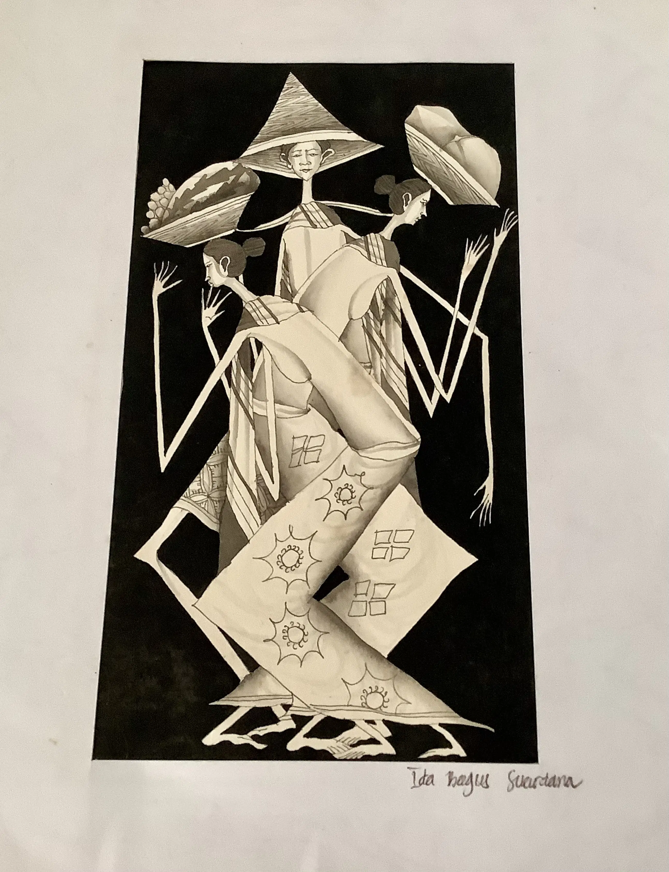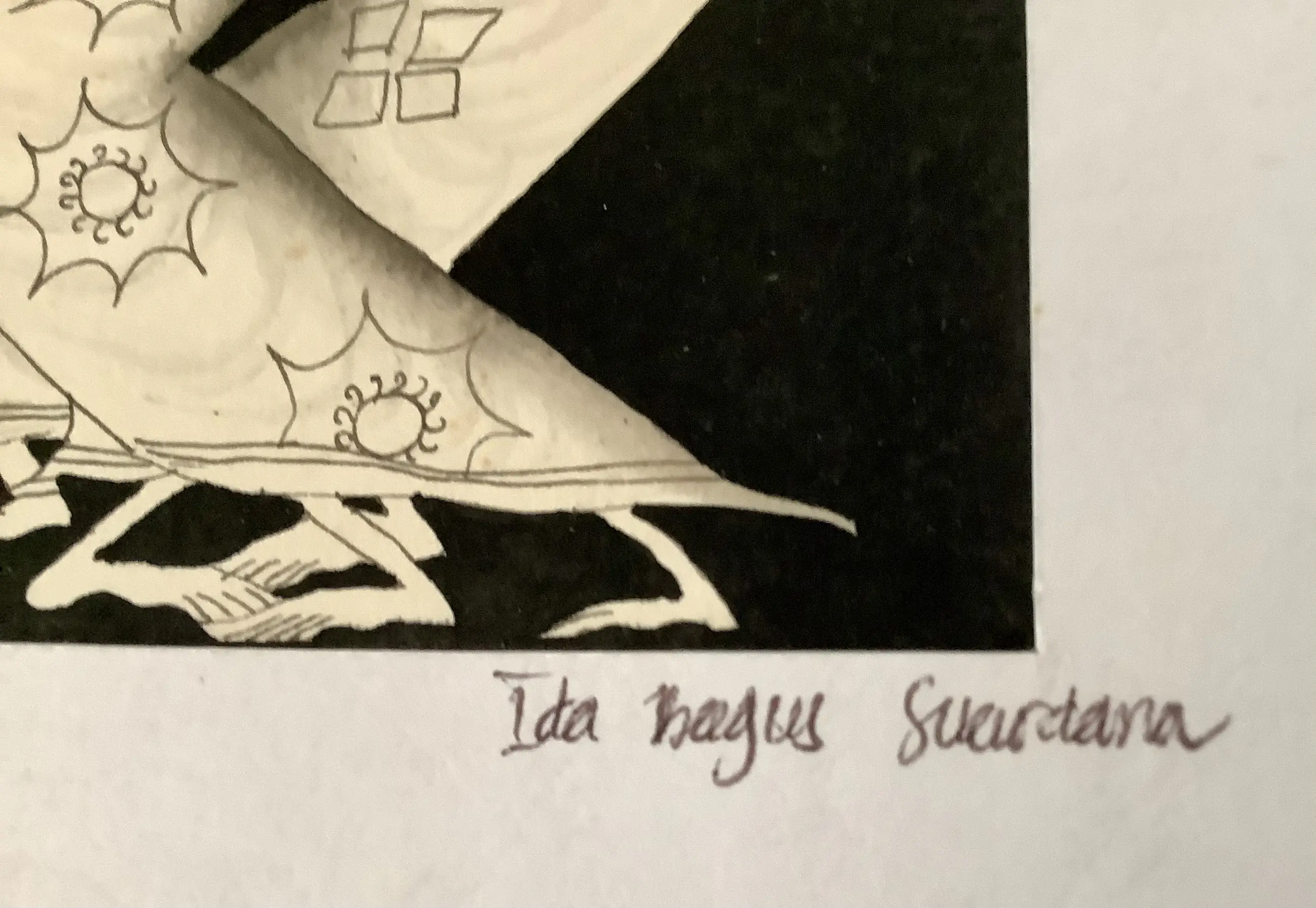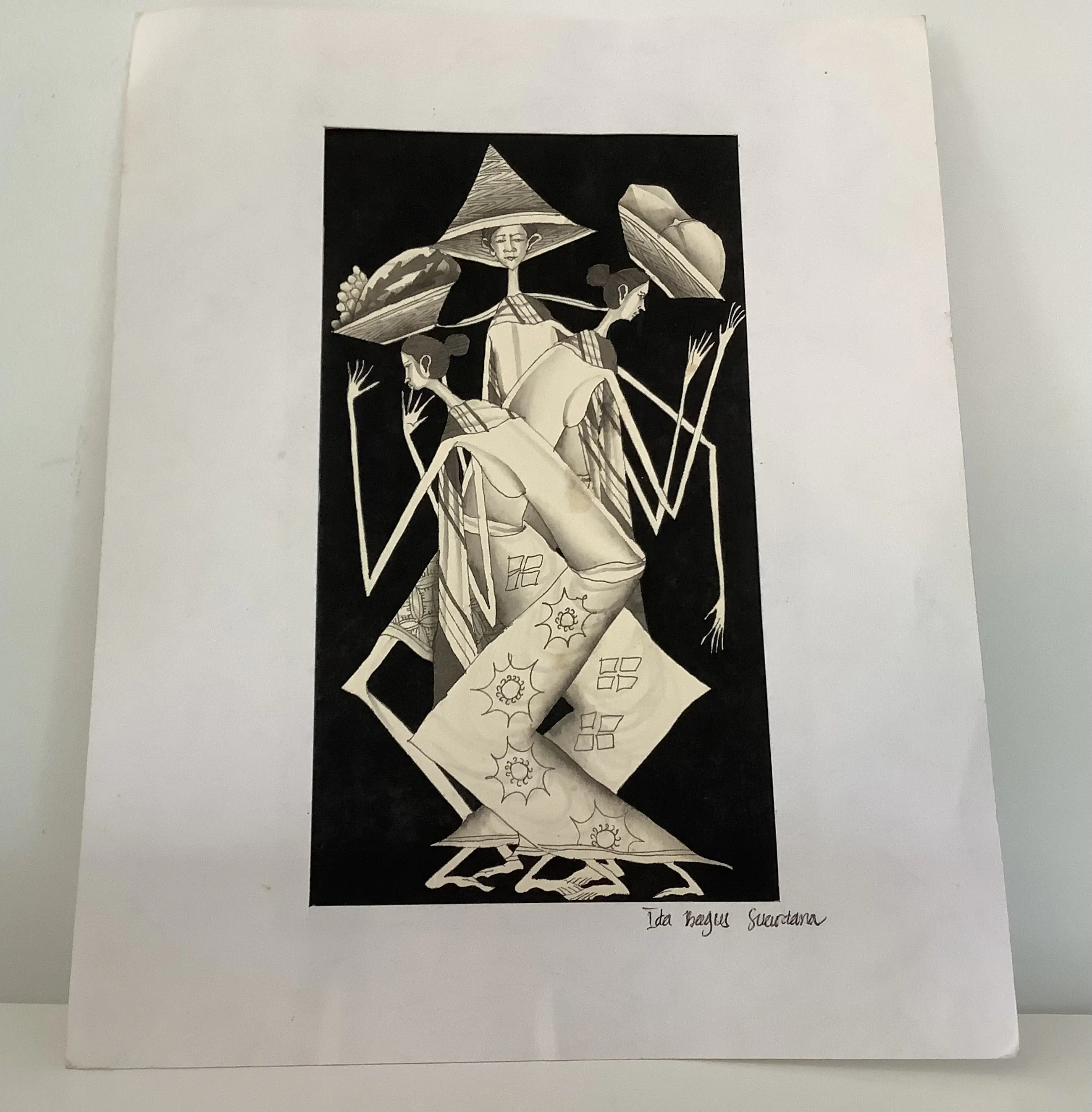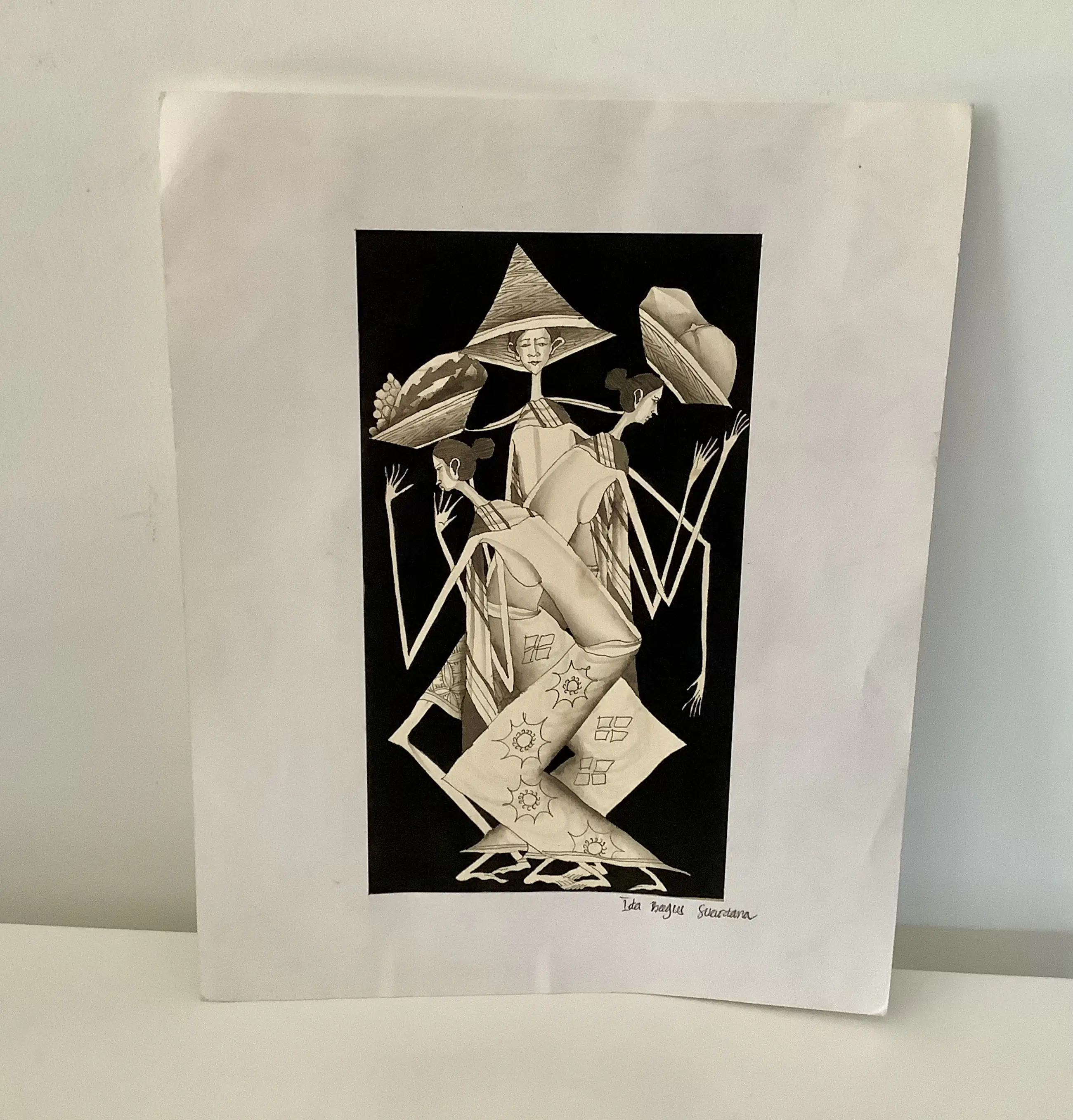 Fraaie grafische zwart wit pen tekening. In eenvoudige papieren passe-partout.