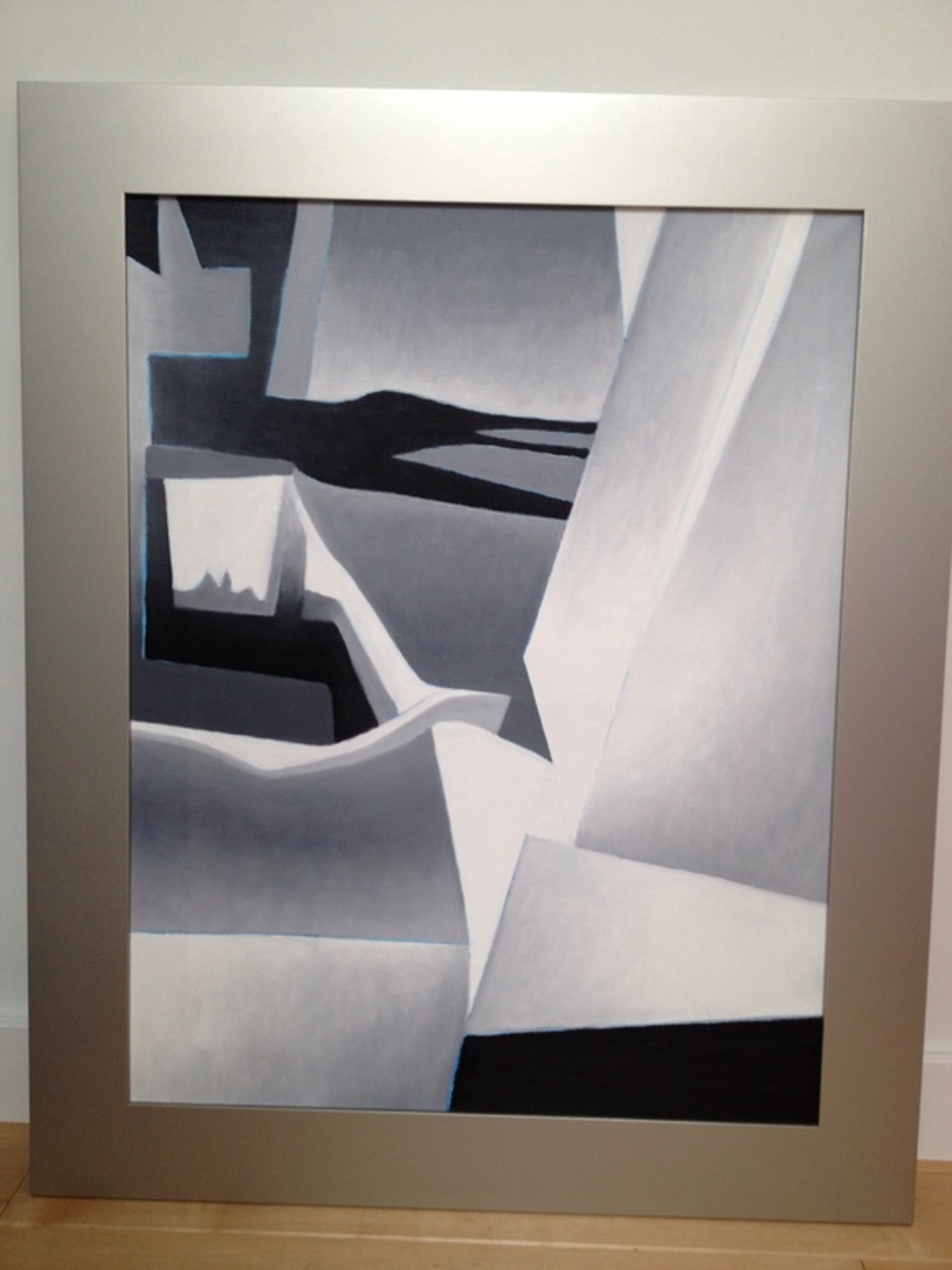 Modern schilderij, geschilderd door Ido Vunderink. Abstracte voorstelling in zwart, wit en grijstinten.