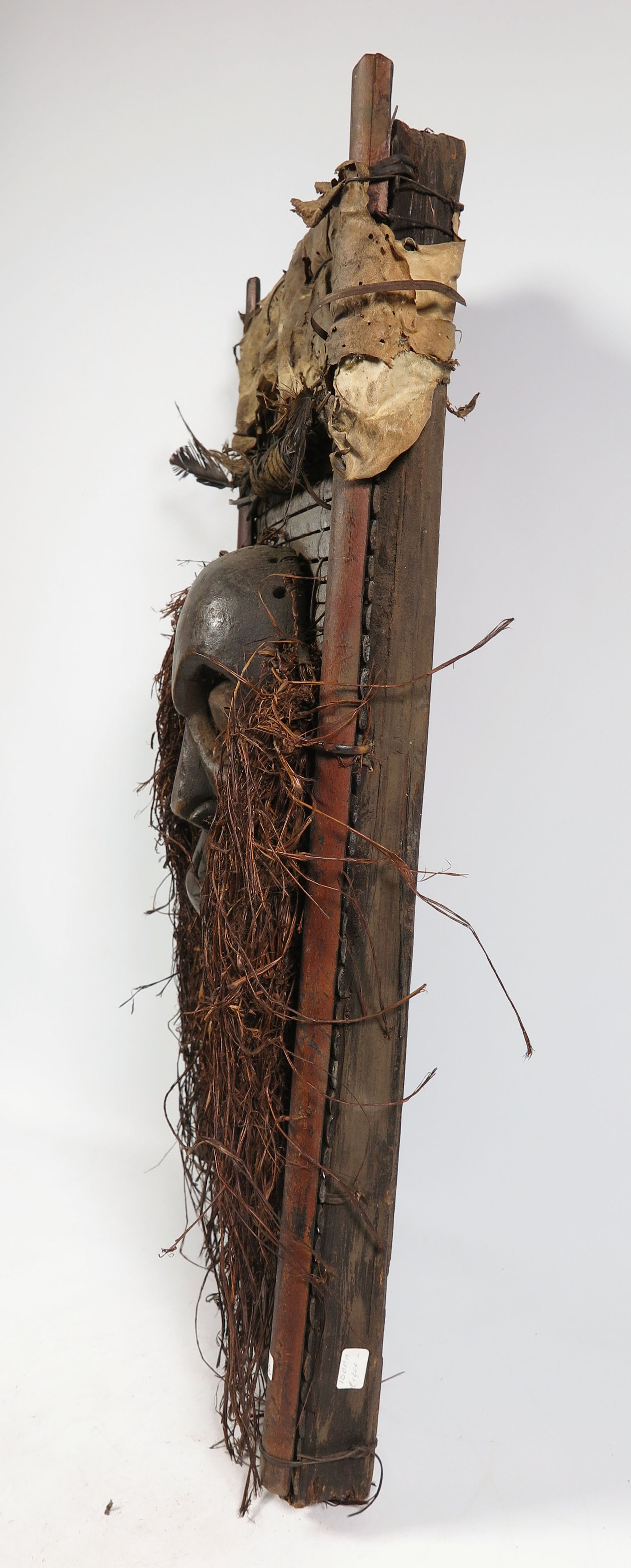 Deels houten Idoma (stam) jagers borstmasker met veren blaas en plantenresten.