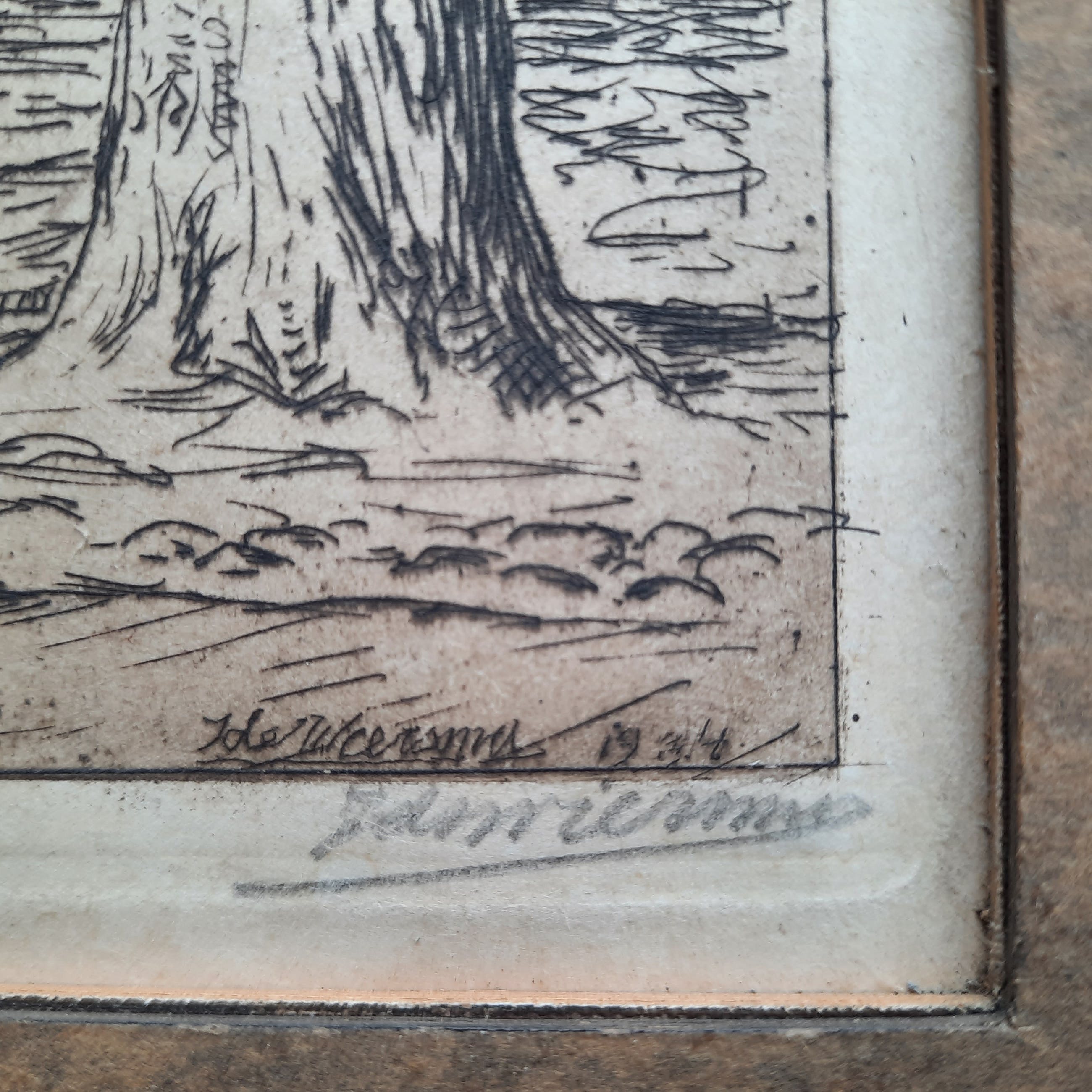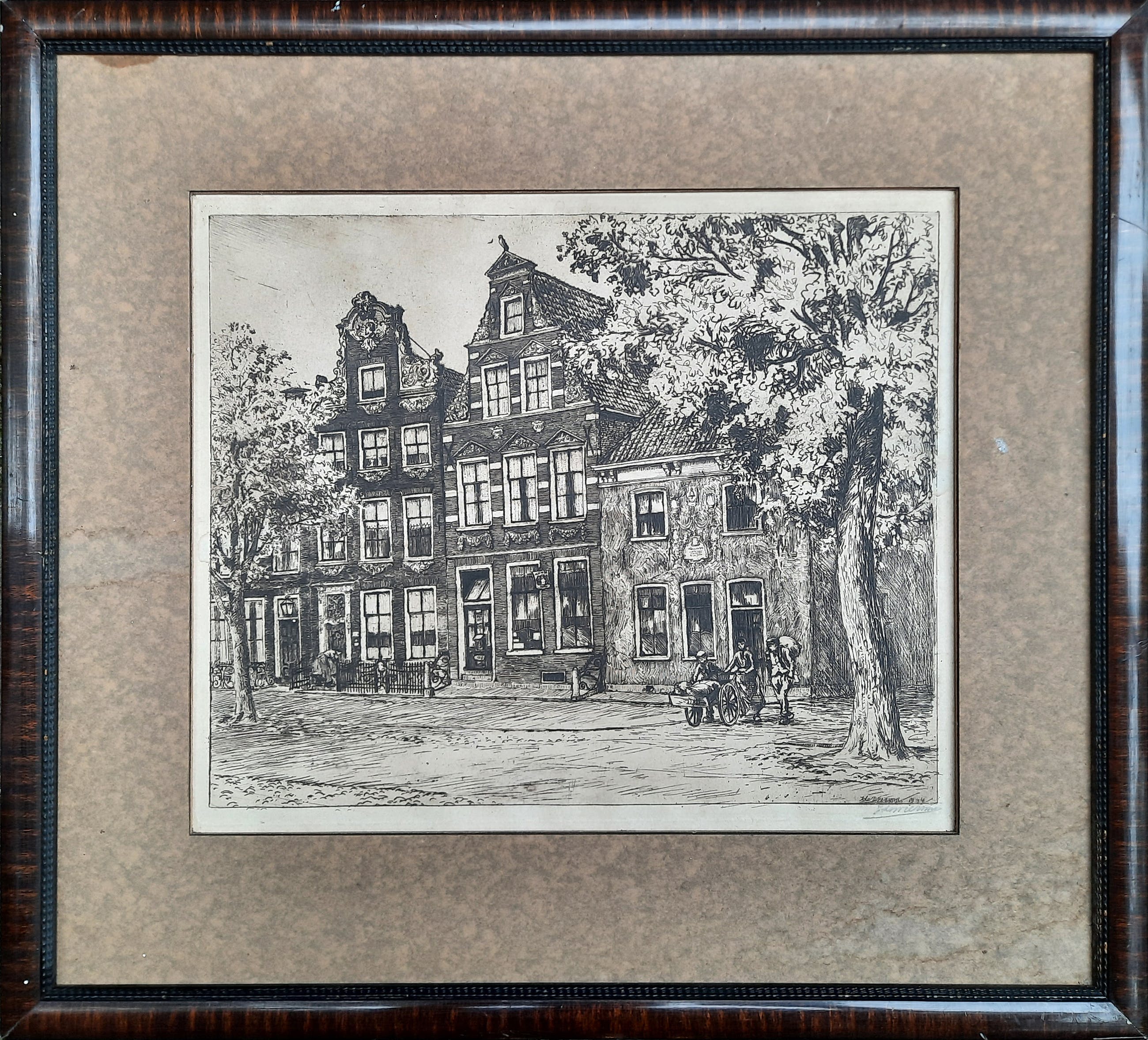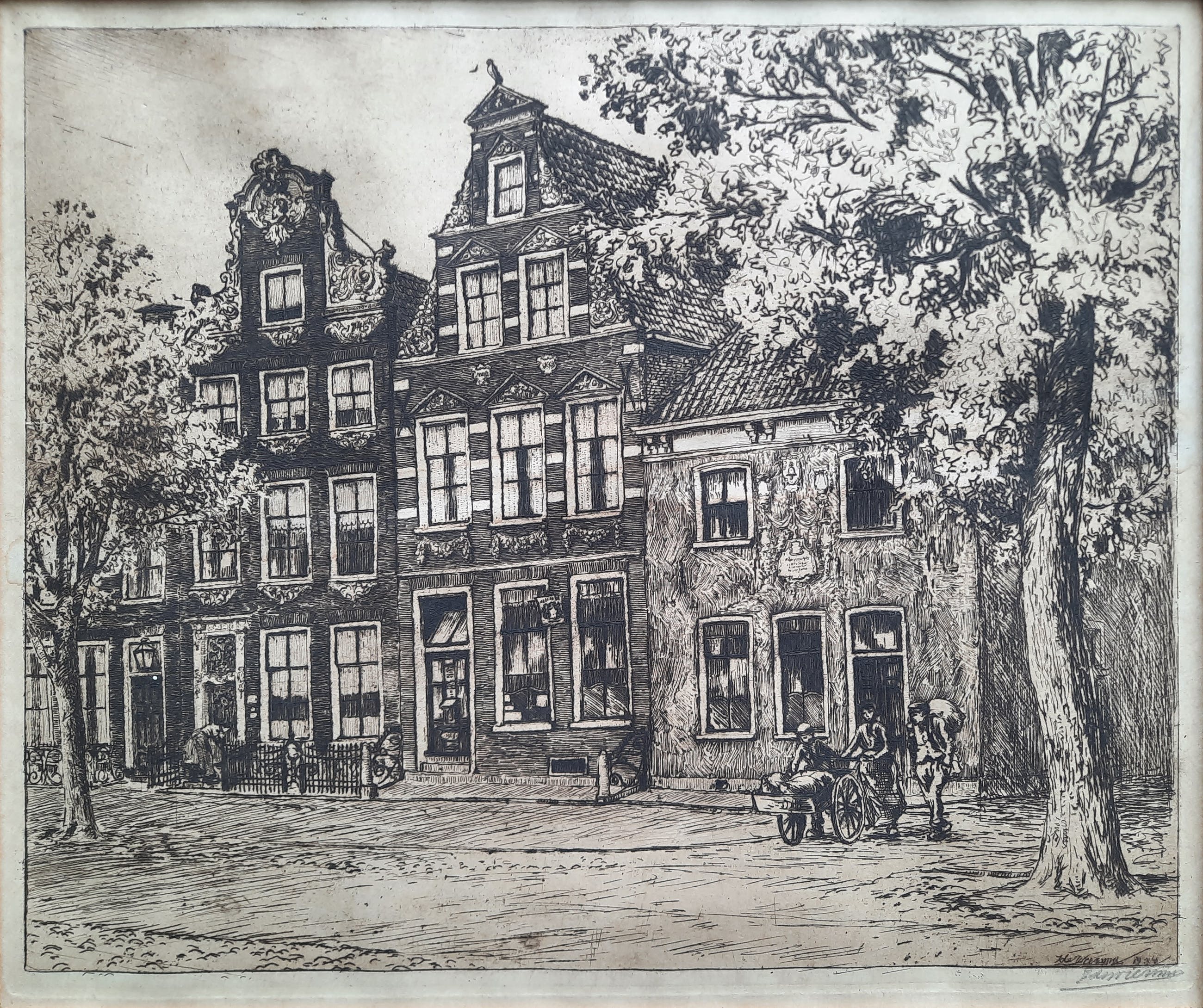 Een ingelijste ets uit 1934 van de Friese kunstenaar Ids Wiersma, met een voorstelling van drie panden aan de Voorstraat te Franeker: de z.g.n. 'Professorenhuizen' . Van links naar rechts zijn het Coopmanshûs, het Valckeniershuis en de Waag te zien. Het Valckeniershuis is te herkennen aan de valk bovenop de gevel. Wordt verzekerd verzonden. Risico verzending is voor koper. Afhalen in de galerie in Zaandam verdient de voorkeur. Het werk bekijken alvorens een bod te doen behoort ook tot de mogelijkheden.