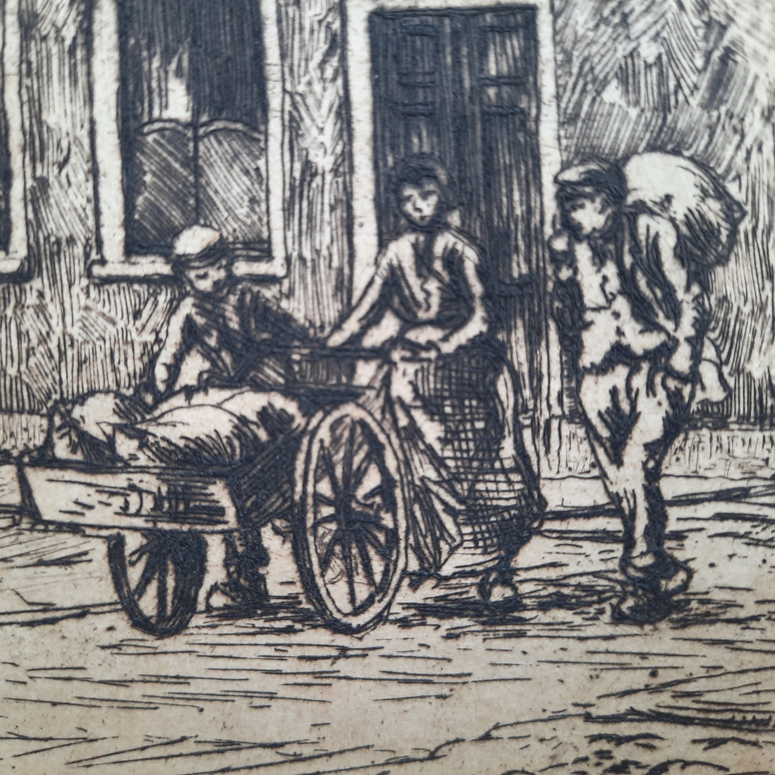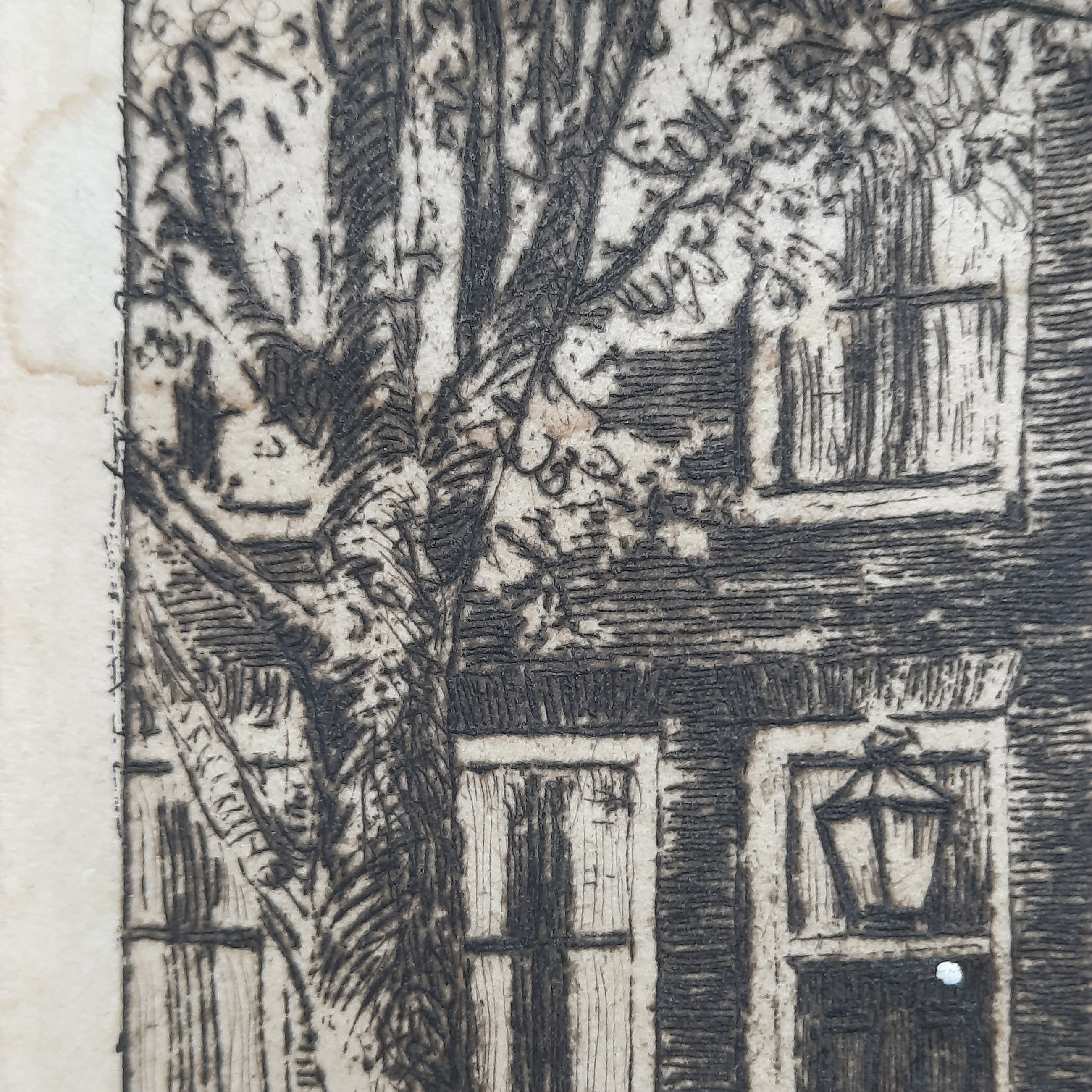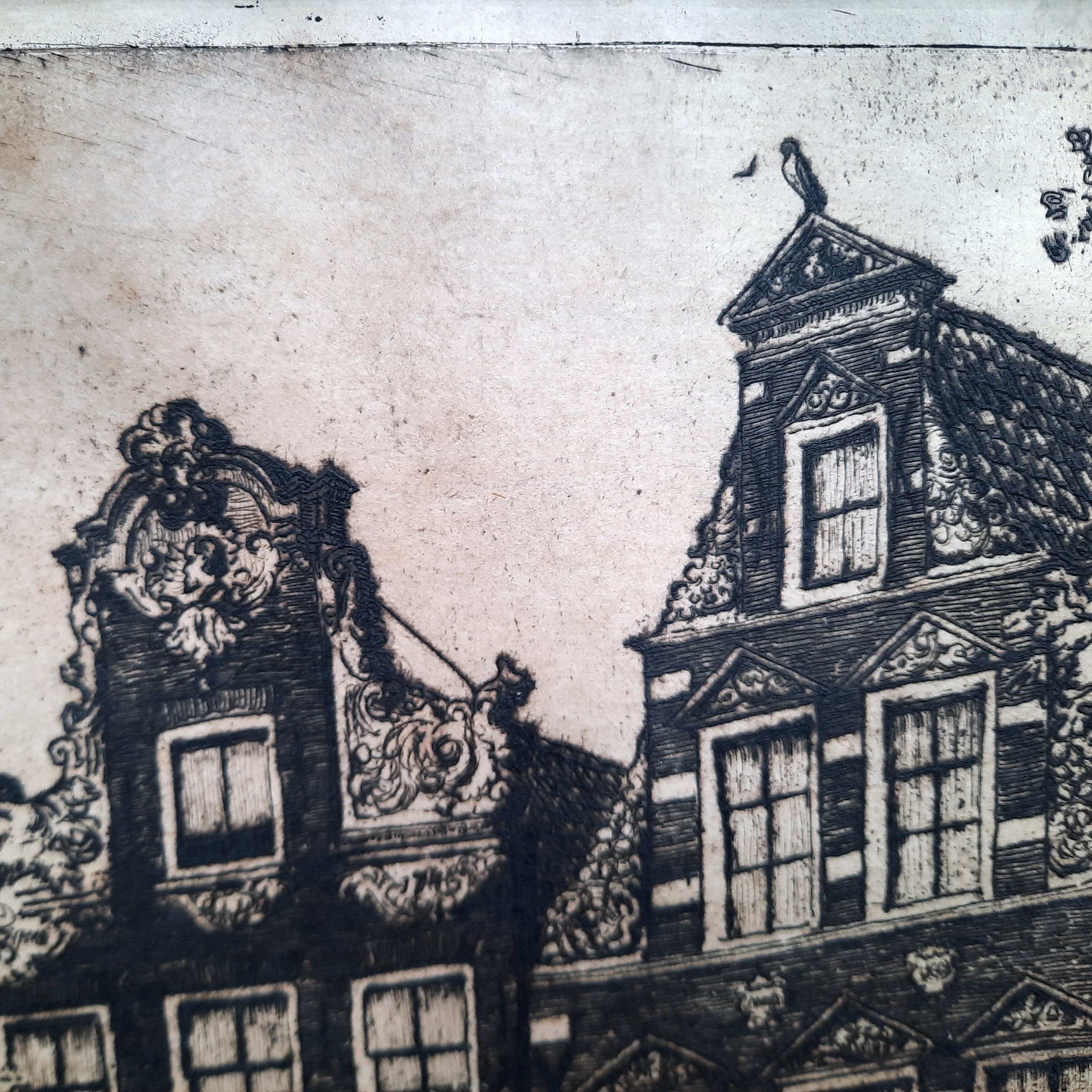 Een ingelijste ets uit 1934 van de Friese kunstenaar Ids Wiersma, met een voorstelling van drie panden aan de Voorstraat te Franeker: de z.g.n. 'Professorenhuizen' . Van links naar rechts zijn het Coopmanshûs, het Valckeniershuis en de Waag te zien. Het Valckeniershuis is te herkennen aan de valk bovenop de gevel. Wordt verzekerd verzonden. Risico verzending is voor koper. Afhalen in de galerie in Zaandam verdient de voorkeur. Het werk bekijken alvorens een bod te doen behoort ook tot de mogelijkheden.