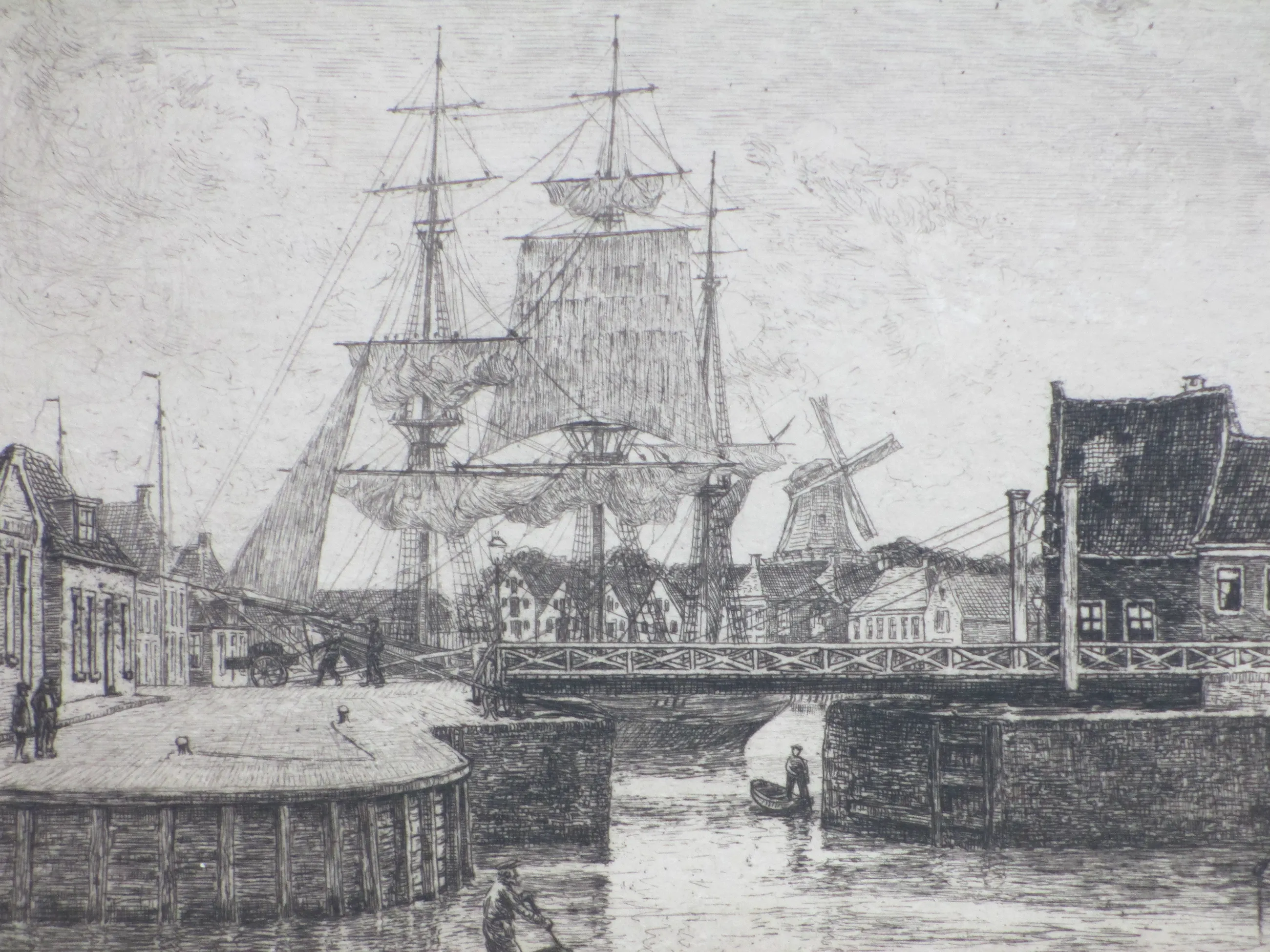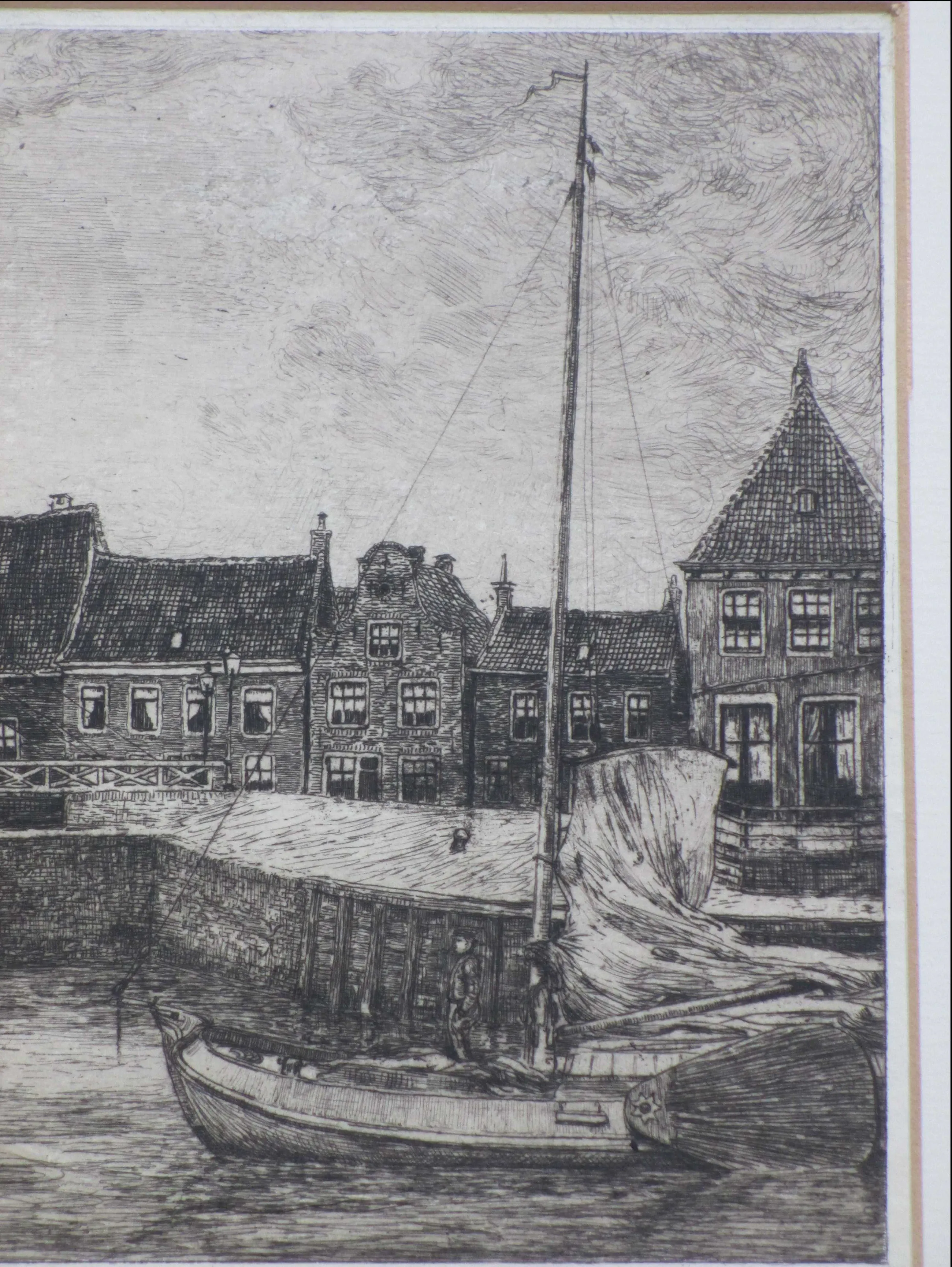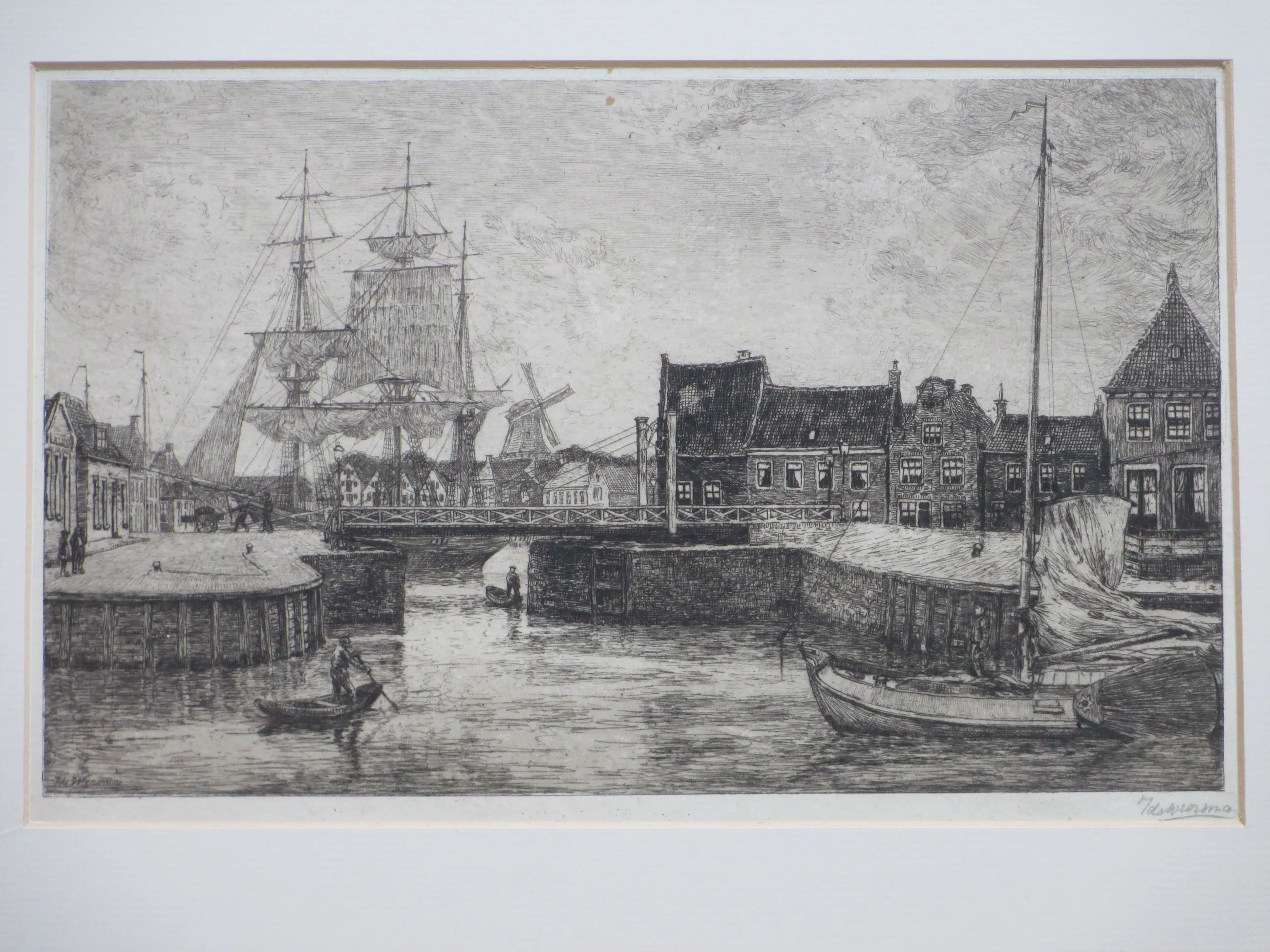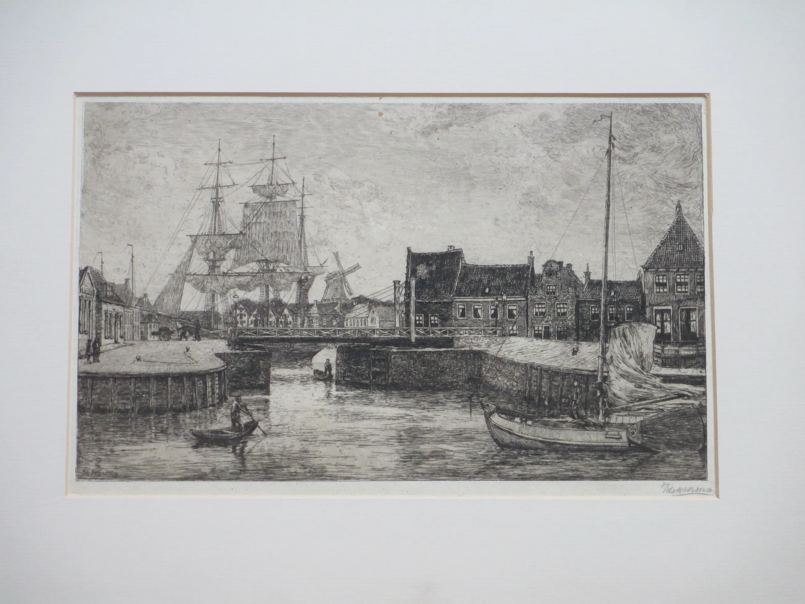 Weinig geziene ets door Ids Wiersma Voorstelling van een Friese havenstad met een aangemeerde driemaster Ets op onderblad onder passepartout, beeldmaat 22.5x37, p.p.maat 38x53 Gesigneerd in potlood r.o.: 'Ids Wiersma' Tevens gesigneerd l.o. in de druk: 'Ids Wiersma' Authenticiteit volledig gegarandeerd