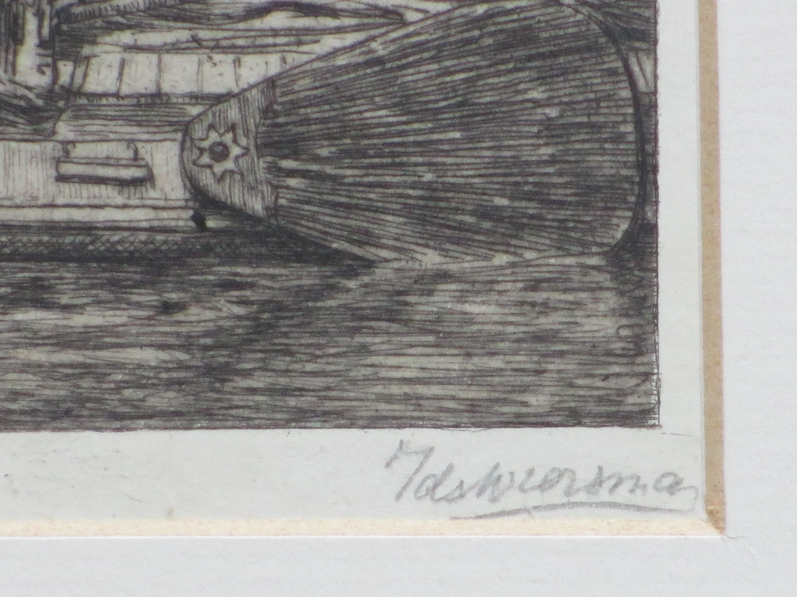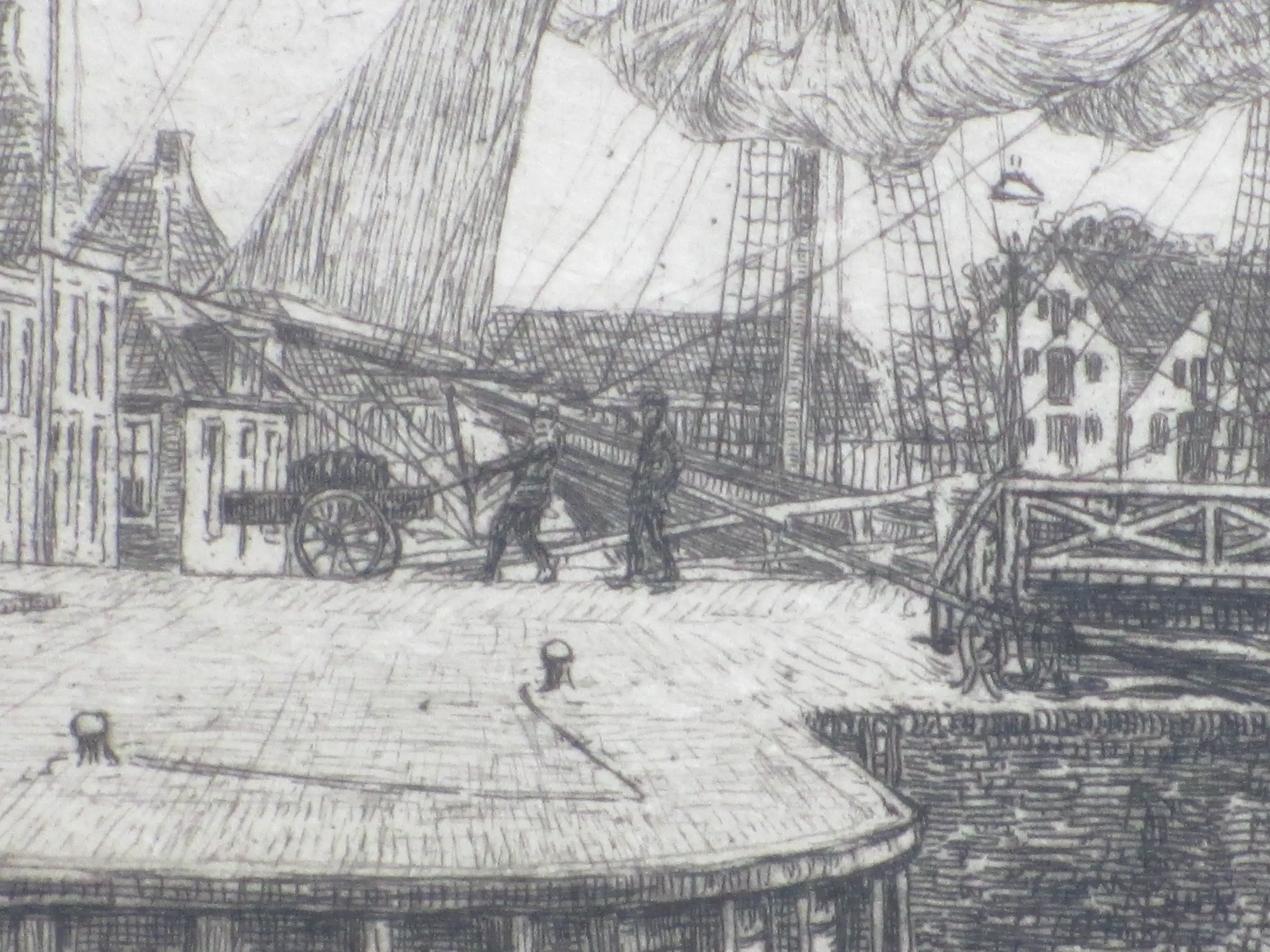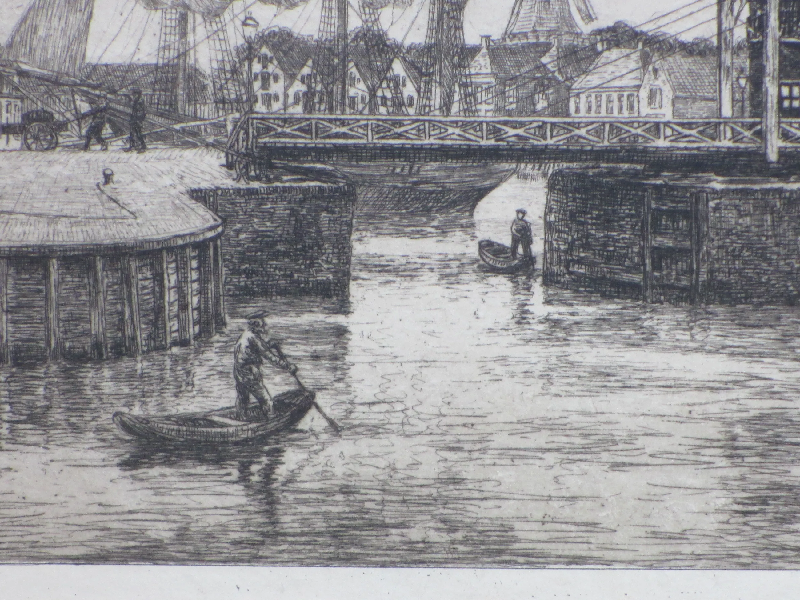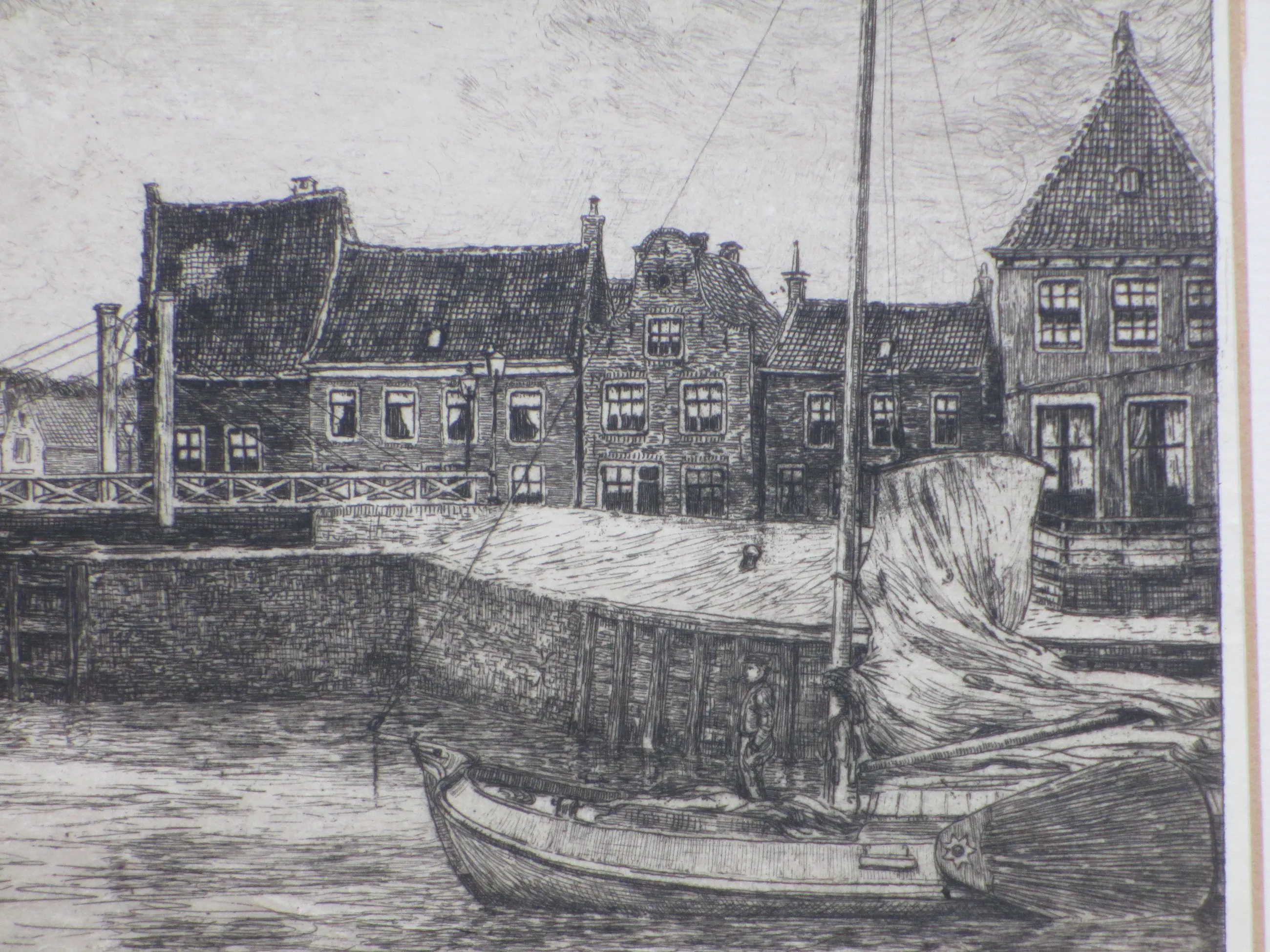Weinig geziene ets door Ids Wiersma Voorstelling van een Friese havenstad met een aangemeerde driemaster Ets op onderblad onder passepartout, beeldmaat 22.5x37, p.p.maat 38x53 Gesigneerd in potlood r.o.: 'Ids Wiersma' Tevens gesigneerd l.o. in de druk: 'Ids Wiersma' Authenticiteit volledig gegarandeerd