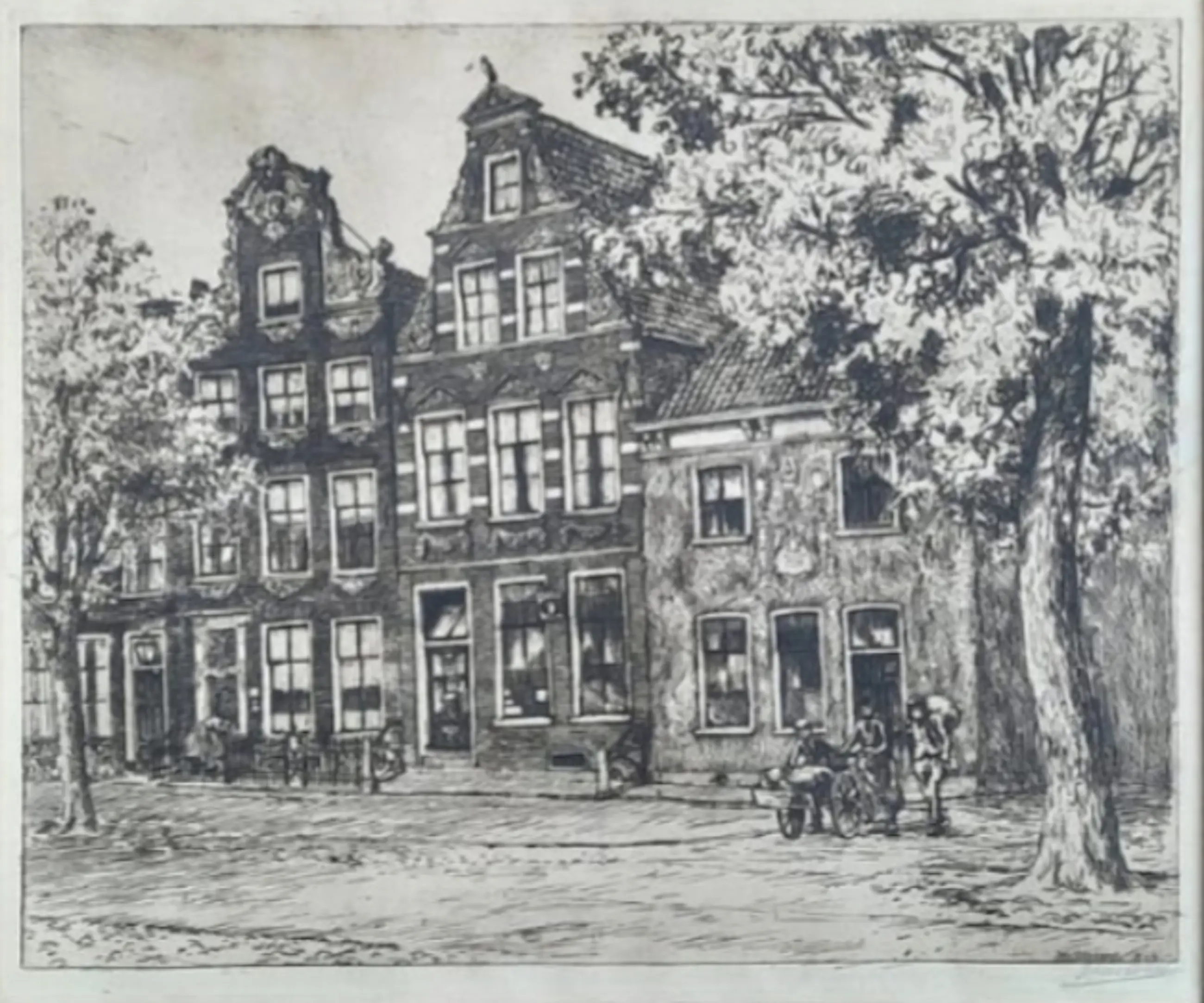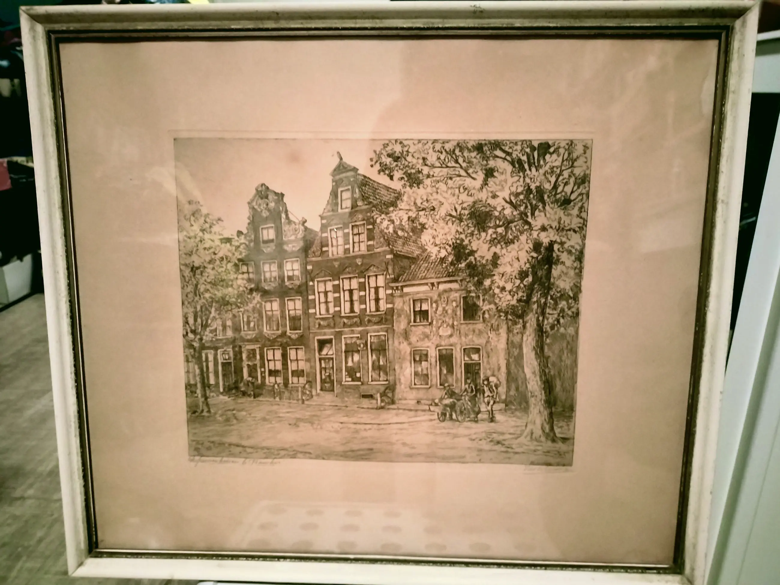 Een ingelijste ets uit 1934 van de Friese kunstenaar Ids Wiersma, met een voorstelling van drie panden aan de Voorstraat te Franeker: de z.g.n. 'Professorenhuizen' . Van links naar rechts zijn het Coopmanshûs, het Valckeniershuis en de Waag te zien. Het Valckeniershuis is te herkennen aan de valk bovenop de gevel. Wordt verzekerd verzonden. Risico verzending is voor koper. Afhalen in de galerie in Zaandam verdient de voorkeur. Het werk bekijken alvorens een bod te doen behoort ook tot de mogelijkheden.