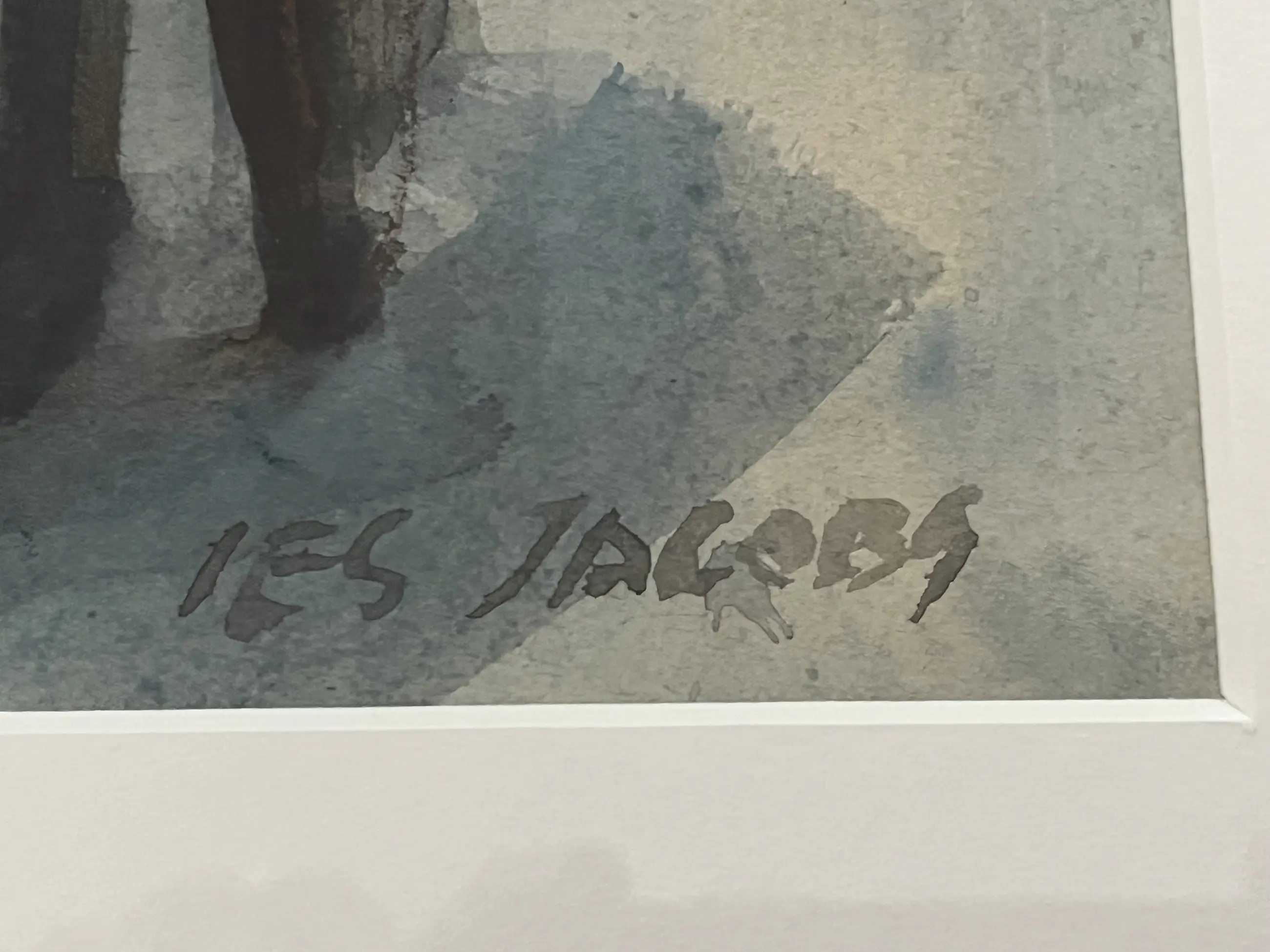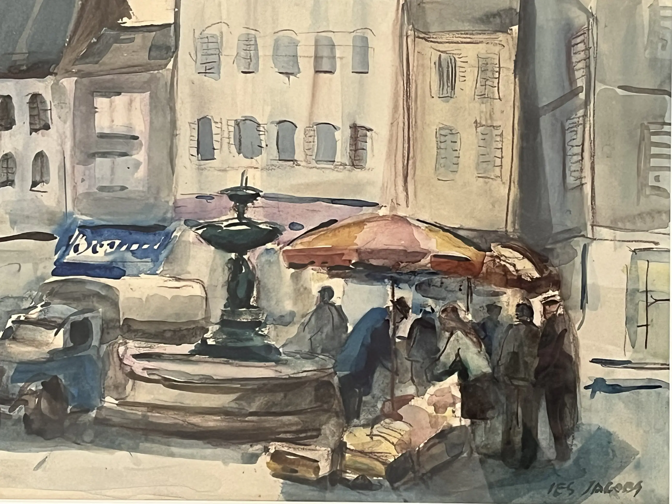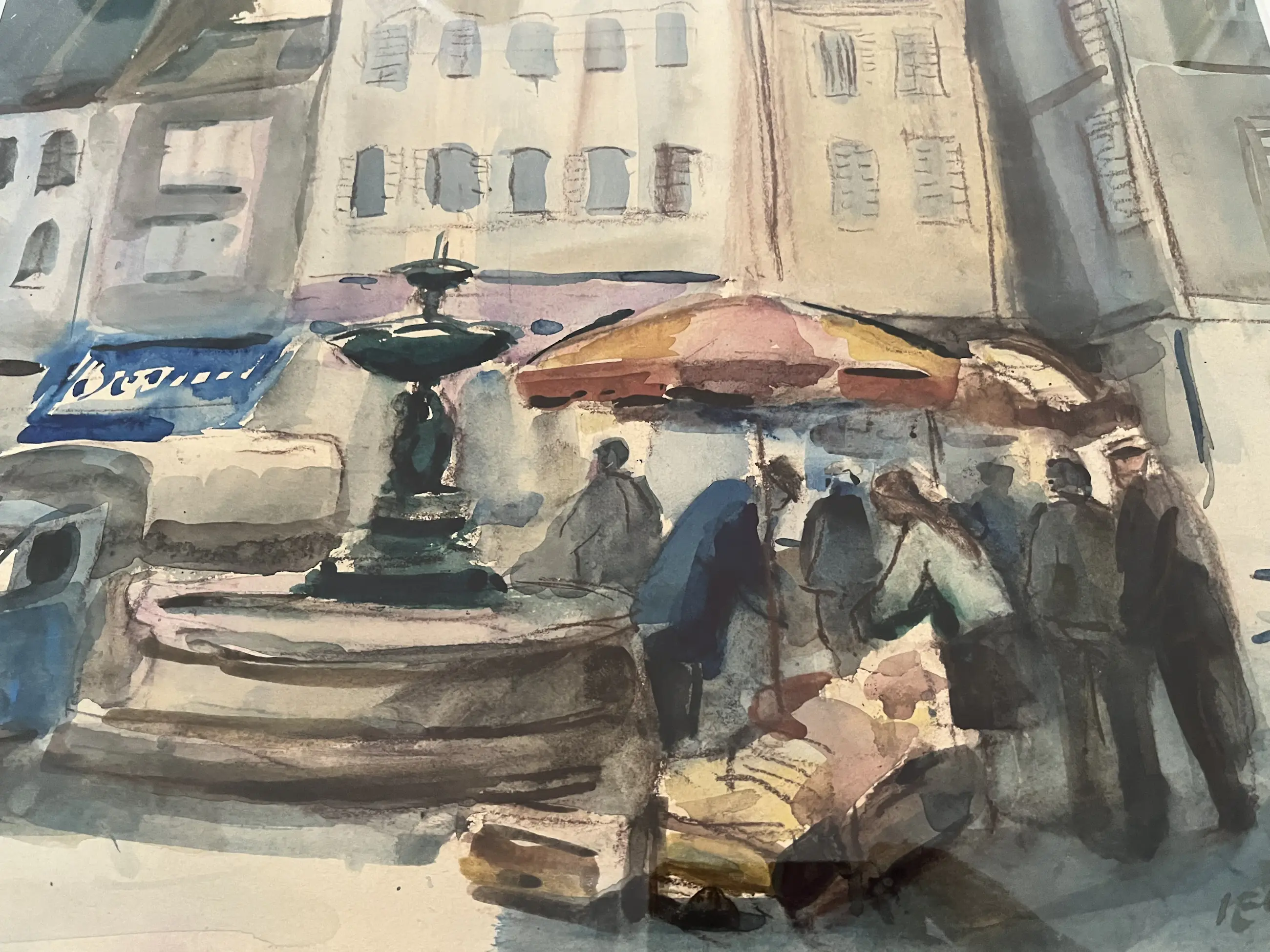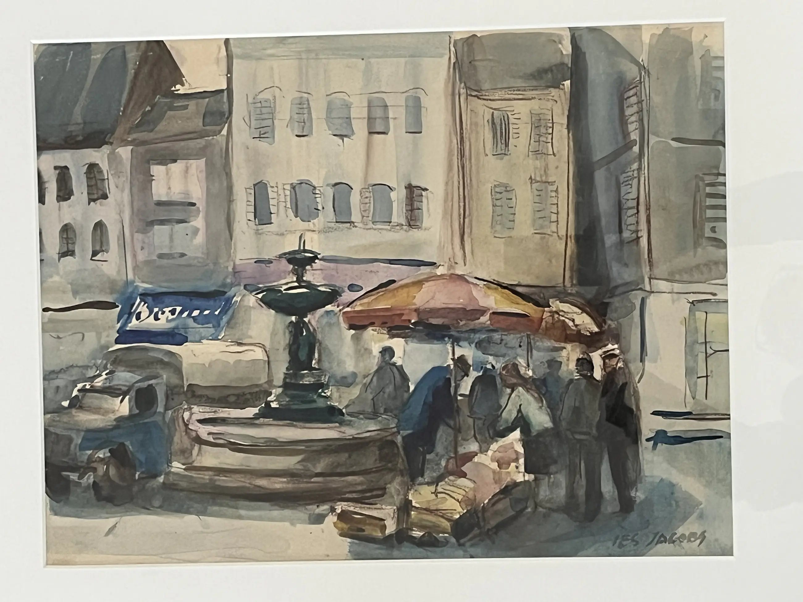Fraai sfeerbeeld van een Frans dorpje. Aquarel uit de collectie van de belastingdienst. Gelijst in zwarte houten lijst met gebruikssporen. (likje zwarte verf doet wonderen) Afmeting afbeelding 35,5 x 46,5 cm. Inclusief lijst 63 x 73 cm.