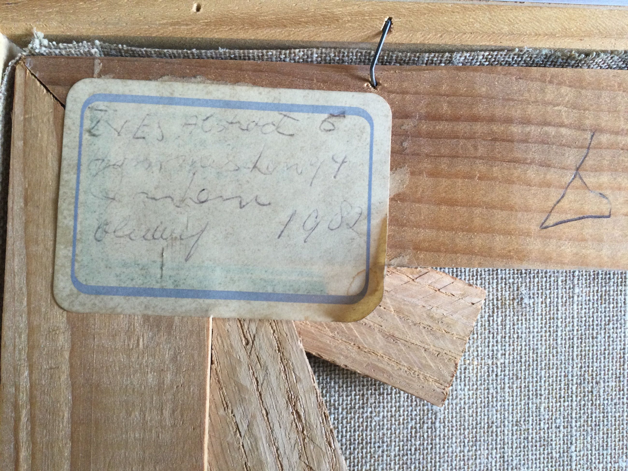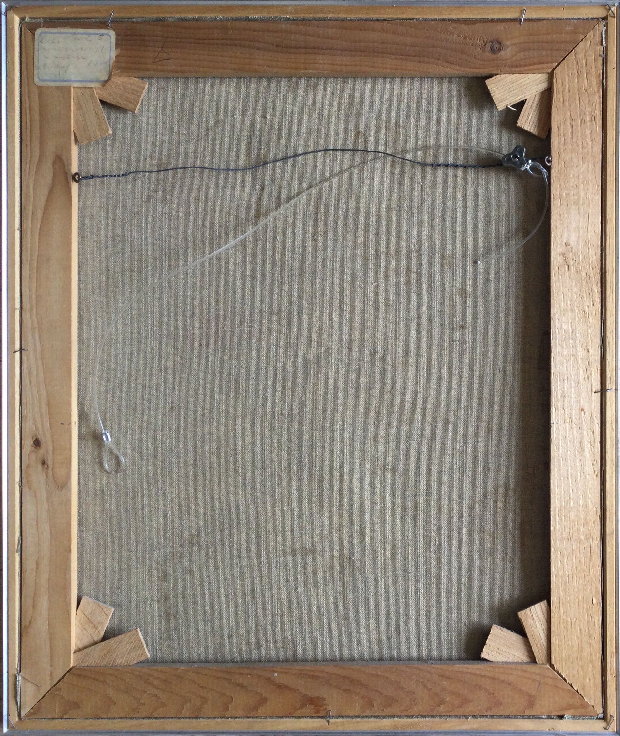 Achterop het houten spieraam zit een oud en origineel etiket met (slecht leesbaar) relevante gegevens, o.a. adres in Arnhem.