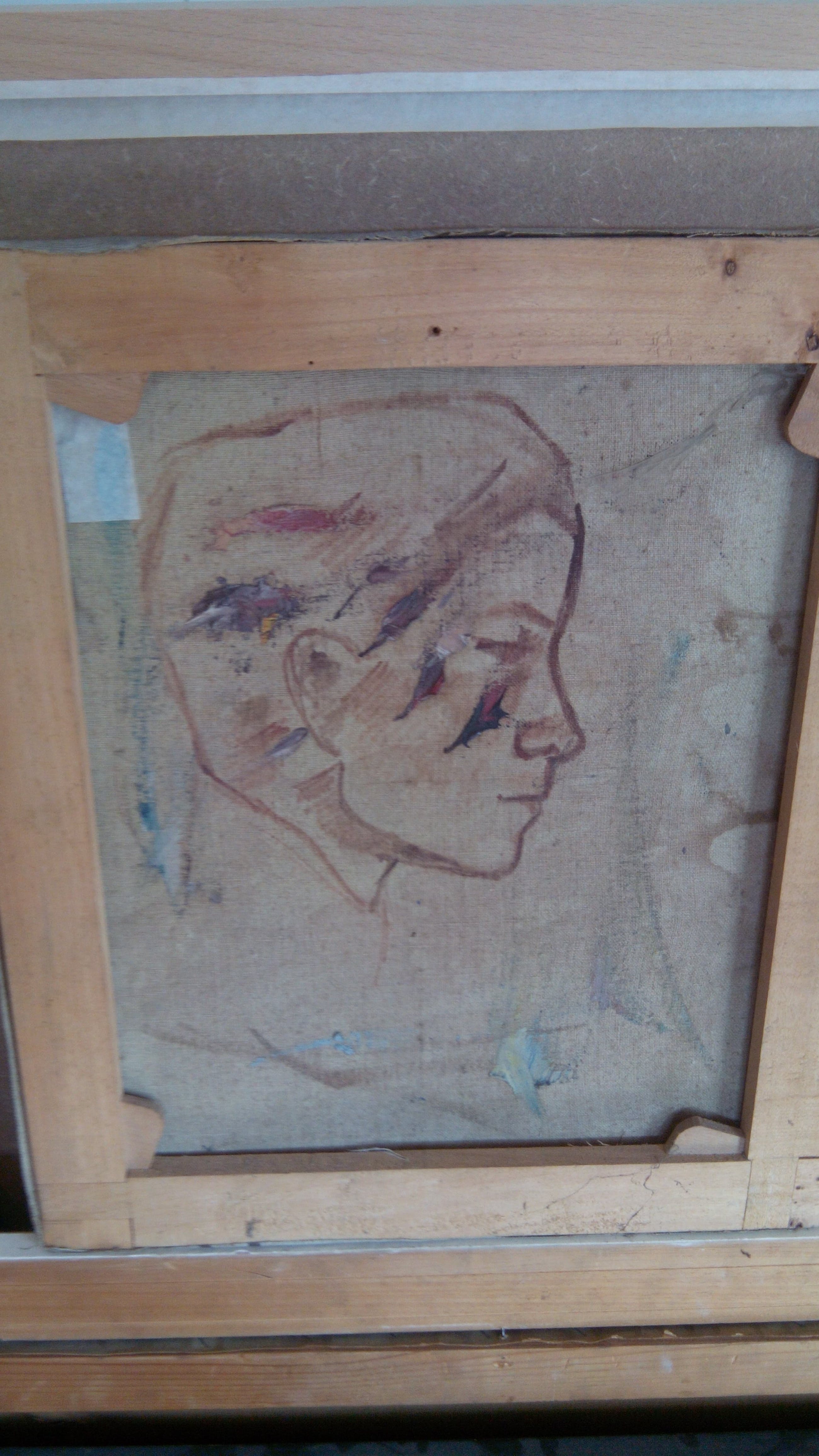Op de achterkant van het doek is hij begonnen aan een portret.Rechtsboven zit een scheurtje in het doek.