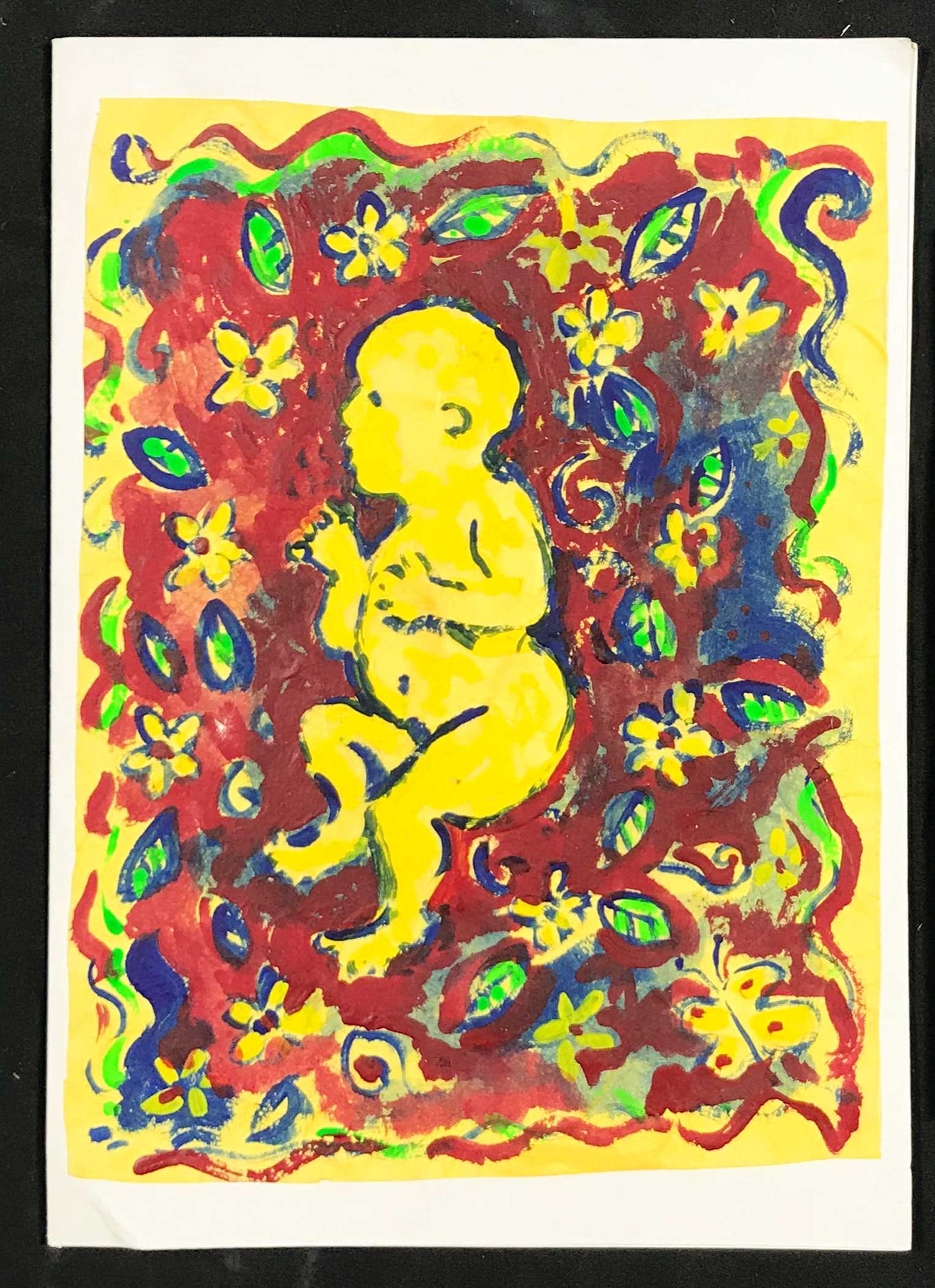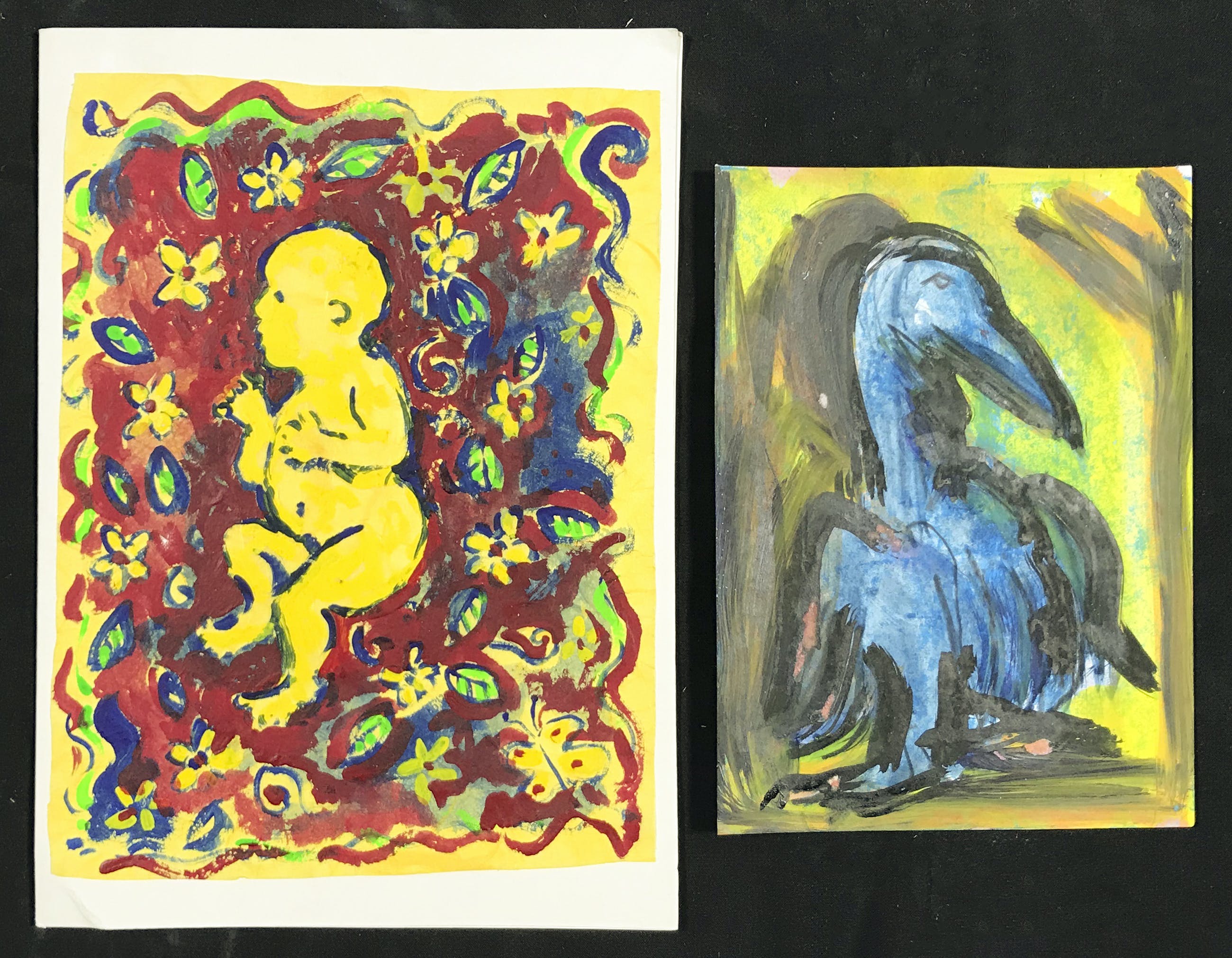 Dit lot bevat twee werken op papier. Het werk met voorstelling van baby is vervaardigd op dun papier, en bevestigd op een dubbelgebouwen stevig blad.