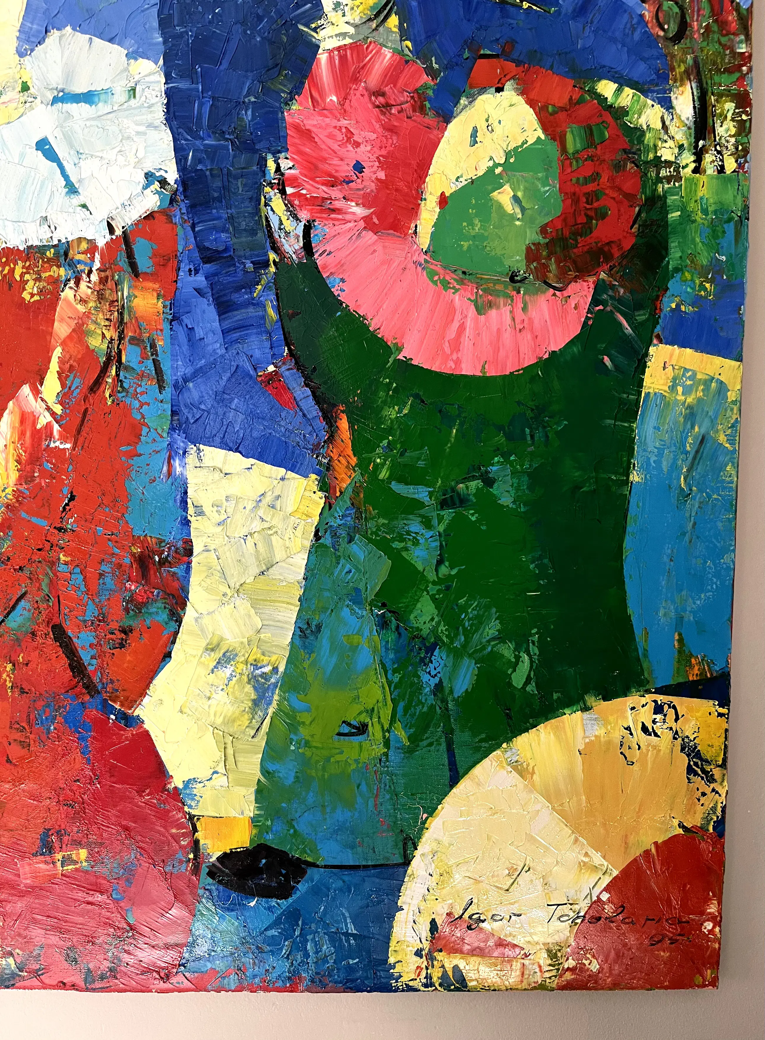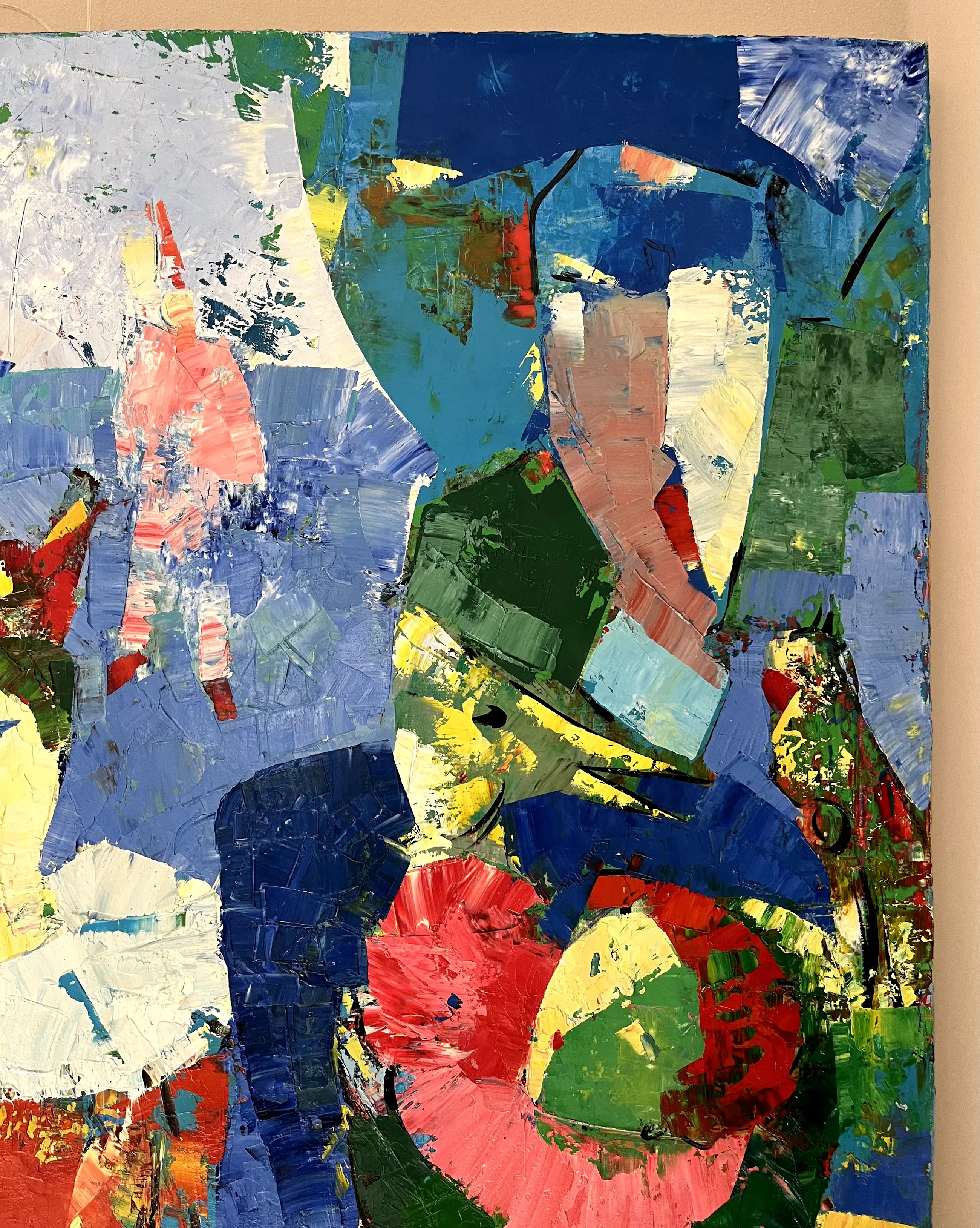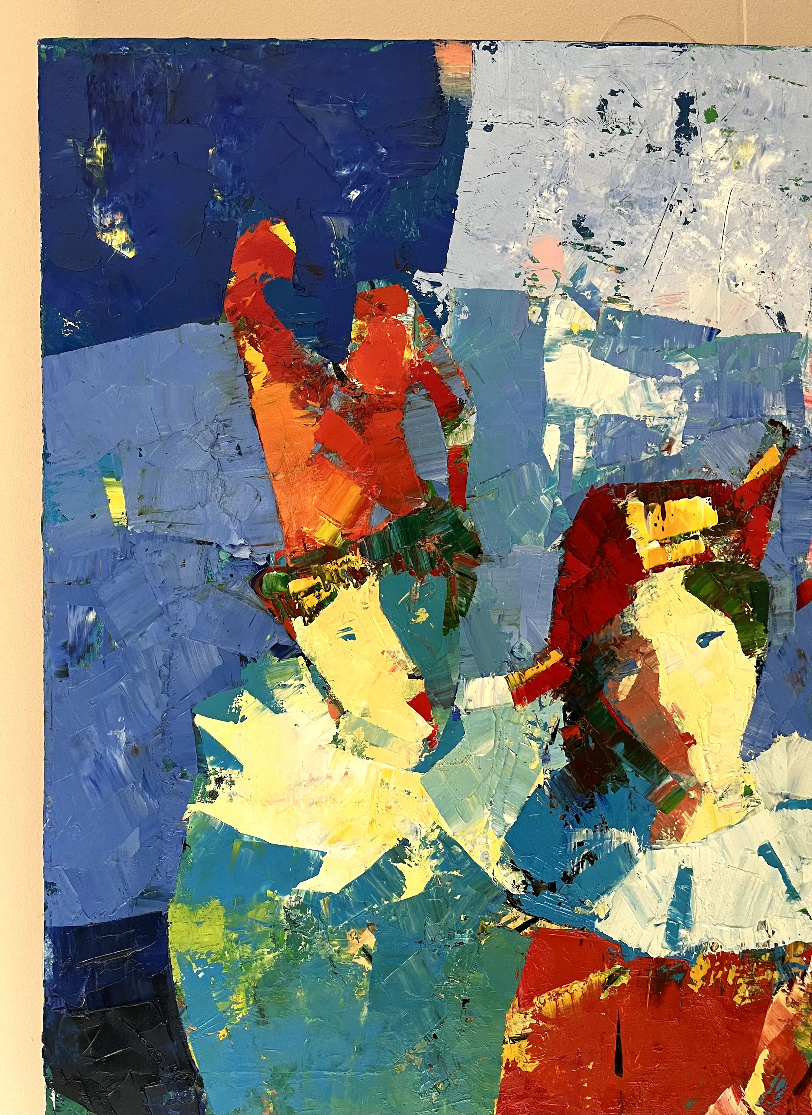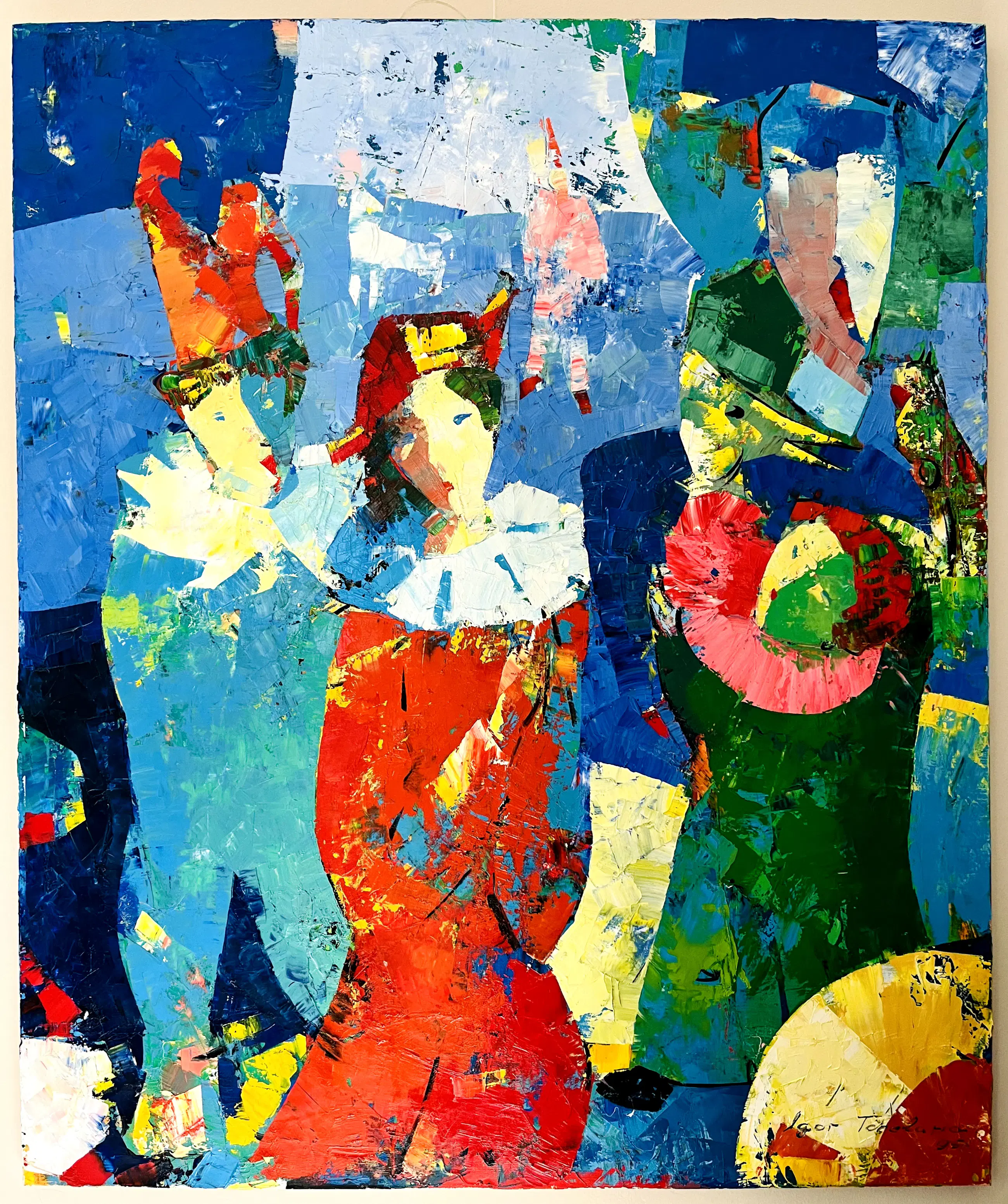 Zonder titel, maar duidelijk te onderscheiden zijn de figuren die doen denken aan andere werken uit dezelfde periode, waarin 'jokers', 'circusartiesten' en andere kleurrijke entertainers onderwerp zijn van zijn schilderijen.