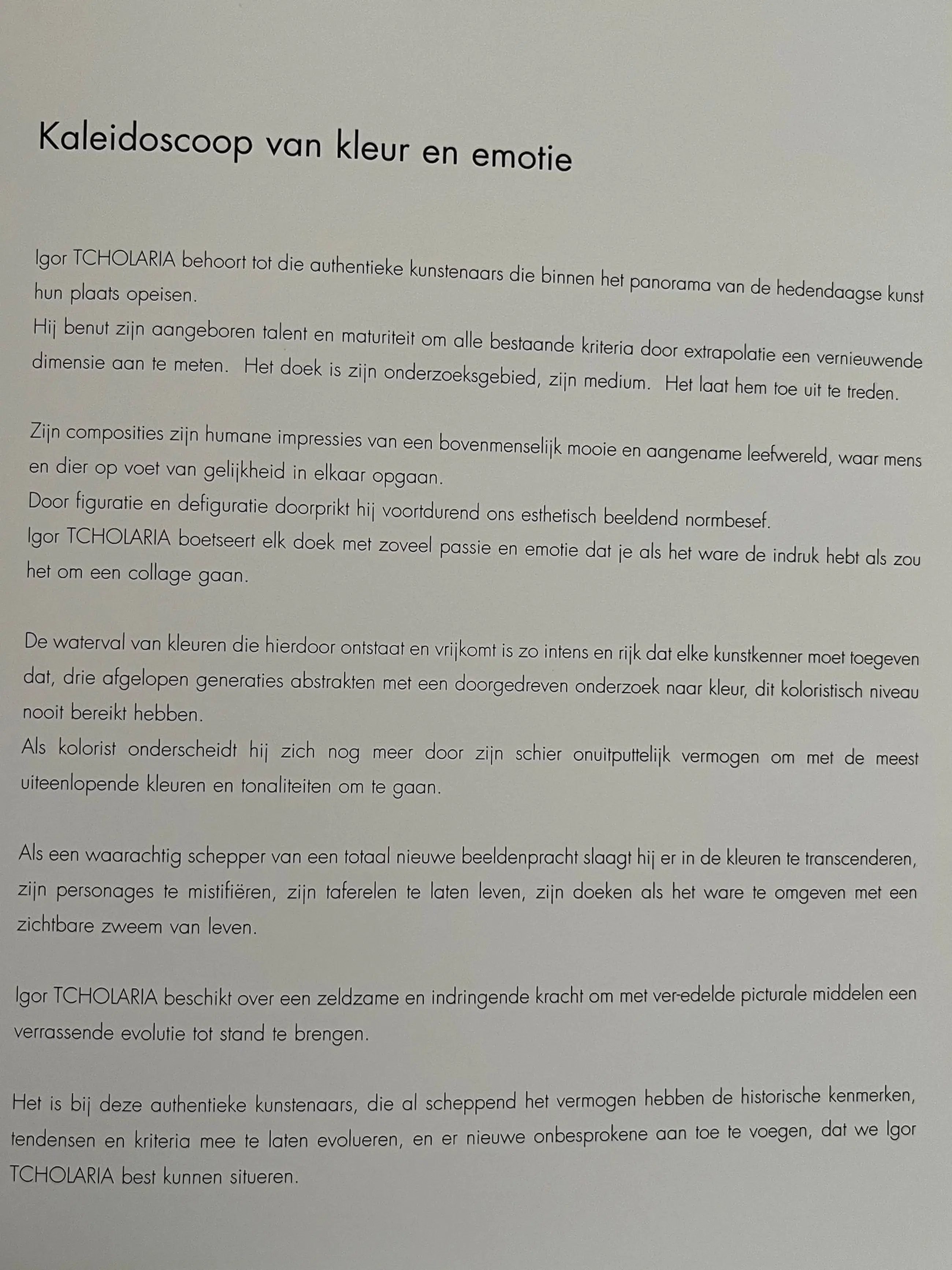 "Zijn composities zijn humane impressies van een bovenmenselijk mooie en aangename leefwereld, waar mens en dier op voet van gelijkheid in elkaar opgaan. ... Igor Tcholaria boetseert elk doek met zoveel passie en emotie dat je als het ware d eindruk hebt als zou het om een collage gaan."