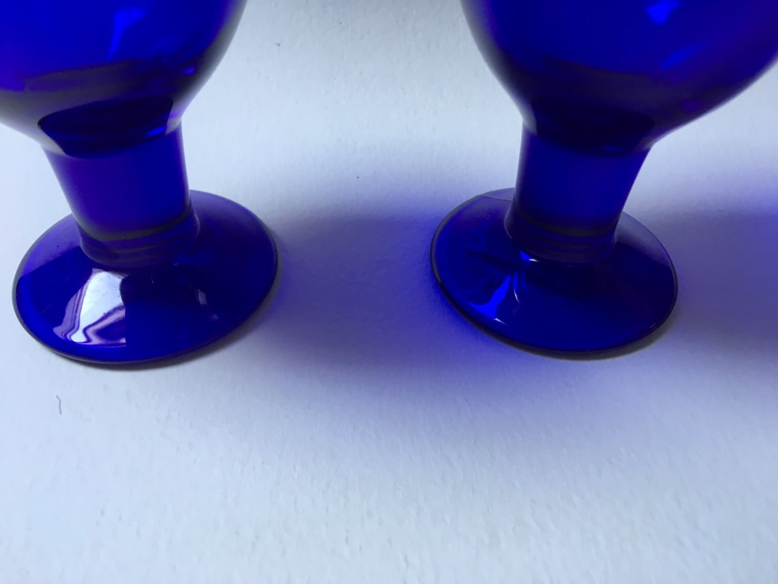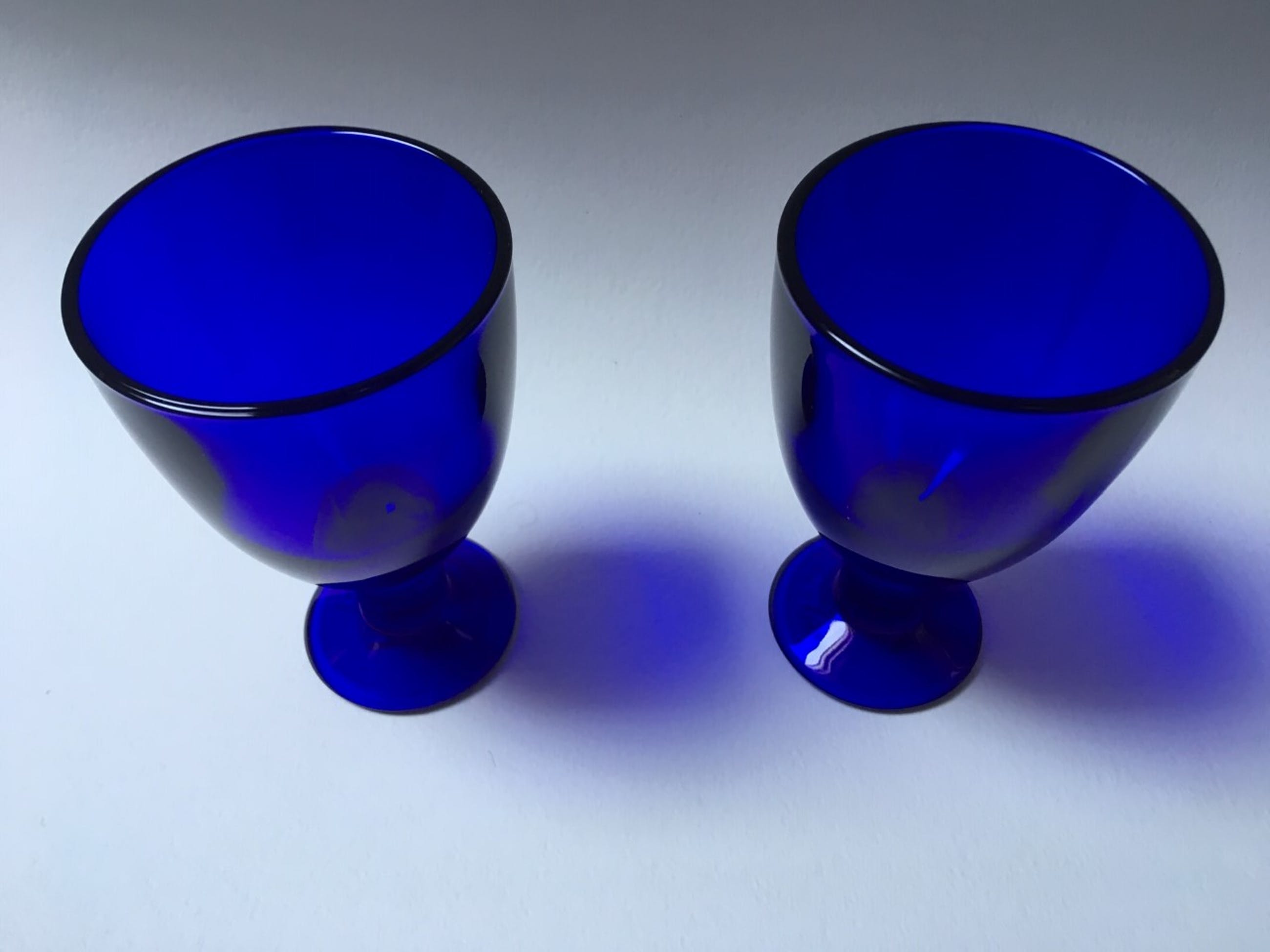 2 kobaltblauwe Vernu glazen van ontwerper Kerttu Nurminen voor Iittala, ca. 1999.Hoogte 13,5 cm, max. doorsnede 8 cm.Goede staat, zeer lichte gebruikssporen. Onderop drukgesigneerd.
