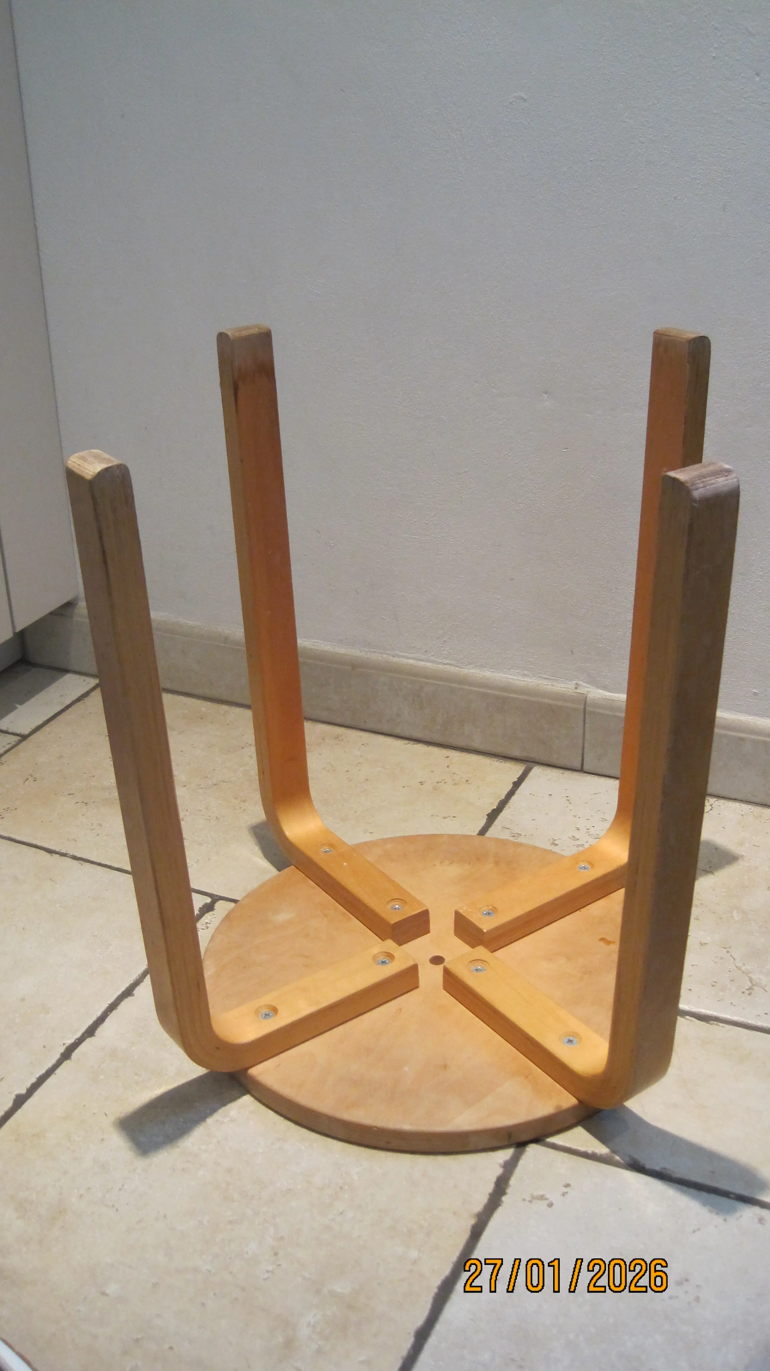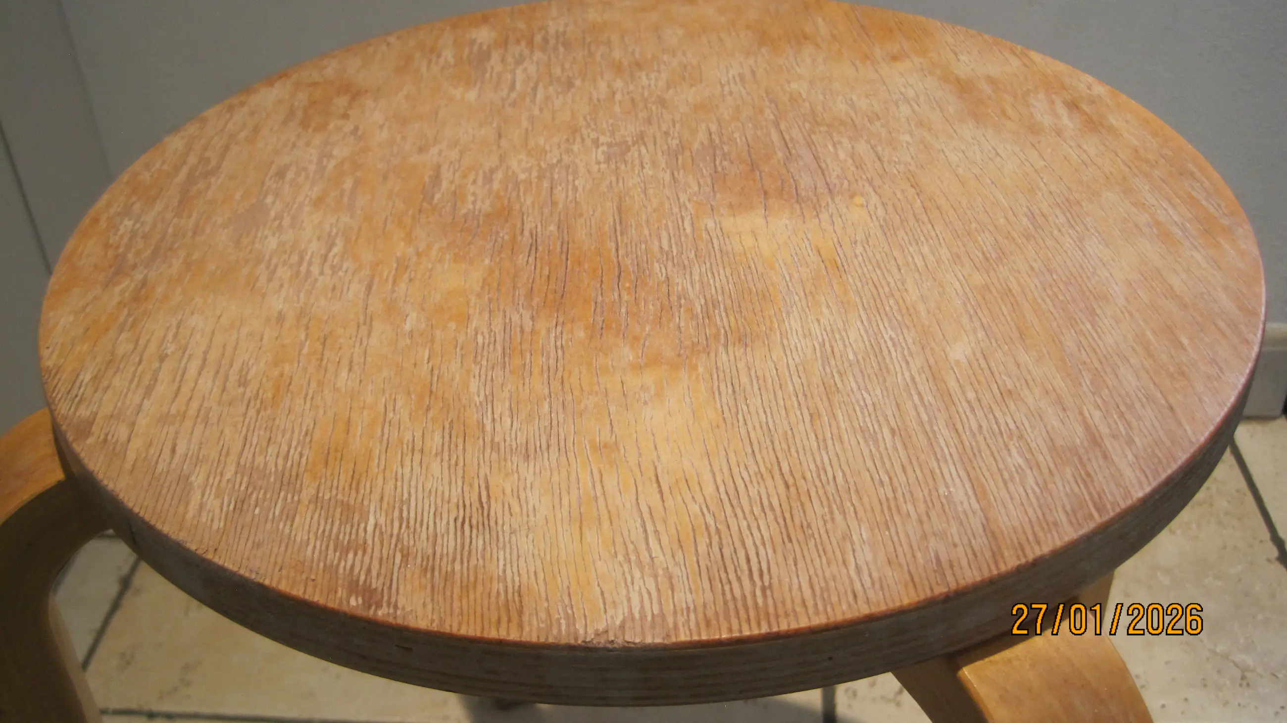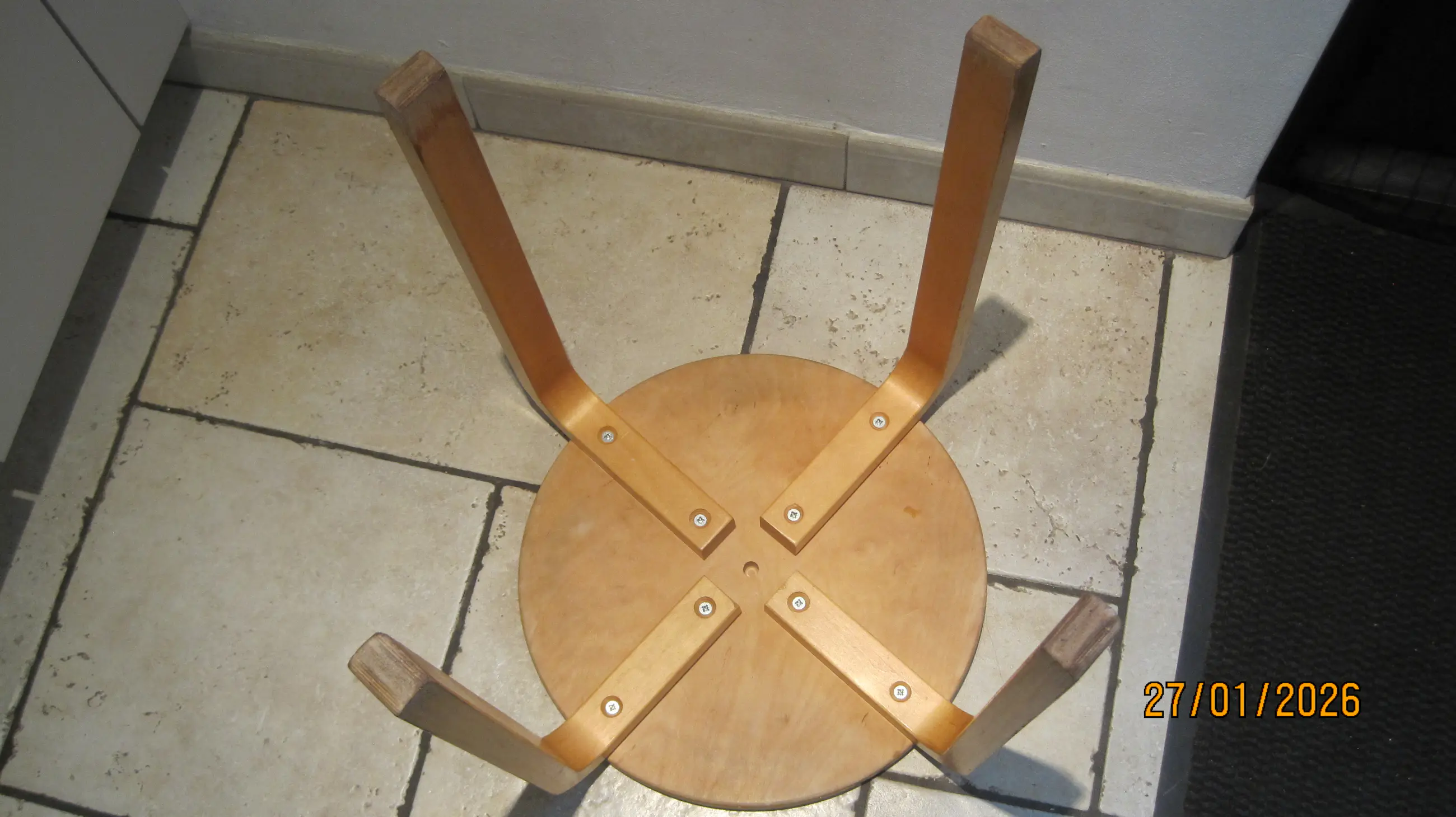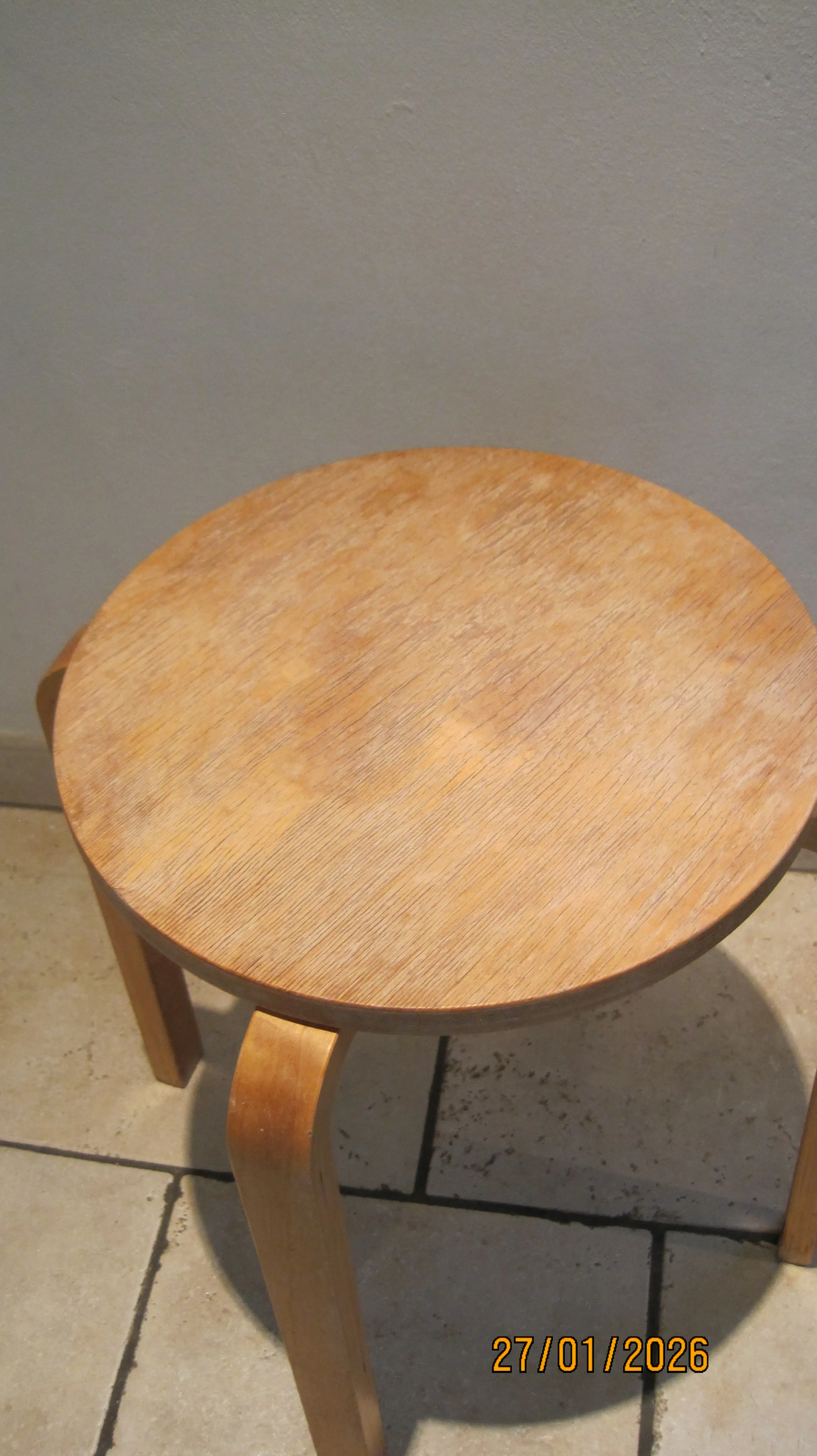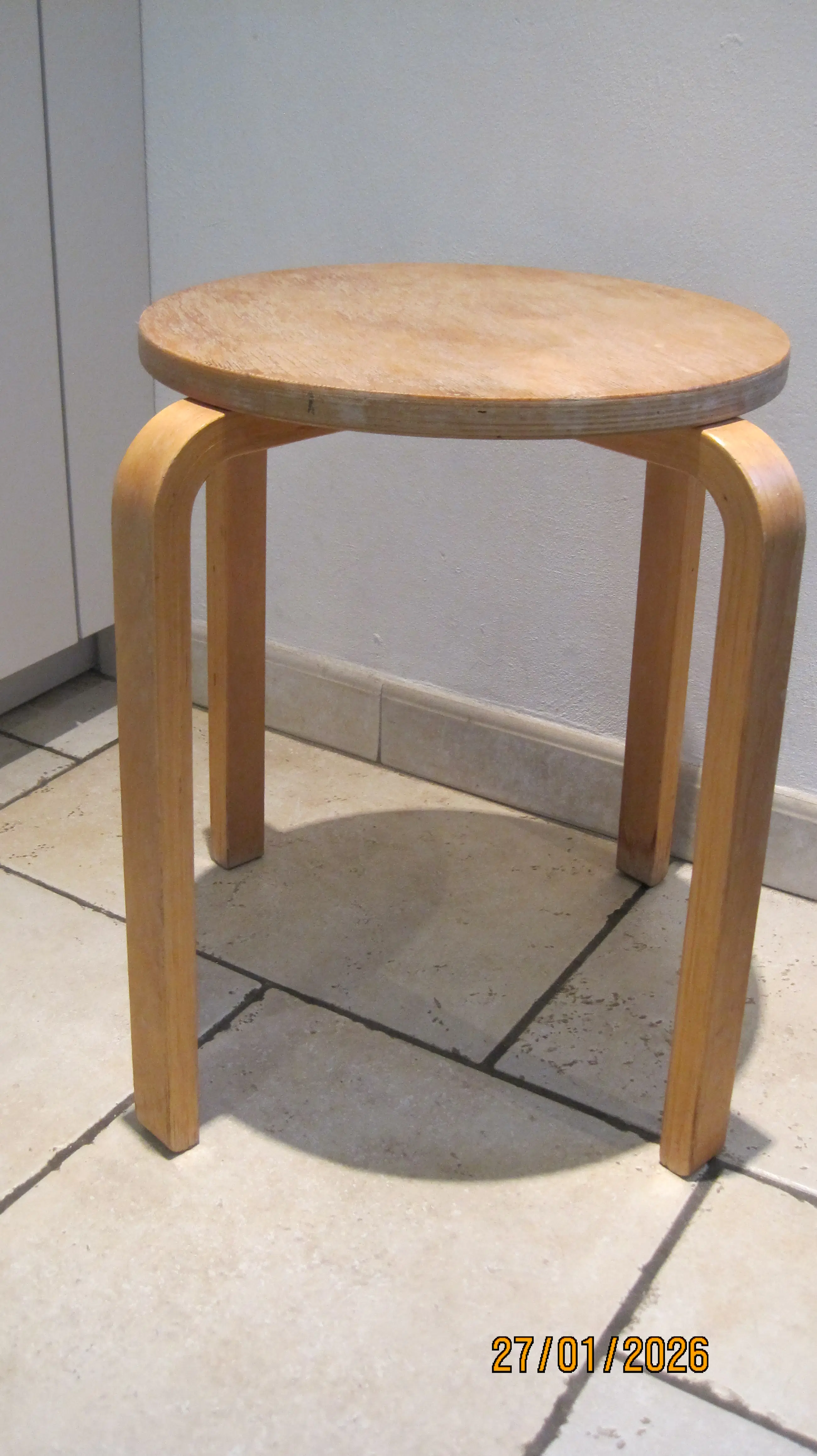 Berkenhout kruk in de stijl van Alvar Aalto die in 1933 de eerste 3-potige kruk ontwierp waarvan de Frosta krukken zijn afgeleid. Dit exemplaar uit de jaren 80 is gemaakt van (gebogen) berken multiplex. Deze kruk heeft gebruiks- en ouderdomsporen, maar verkeert in een goede staat.