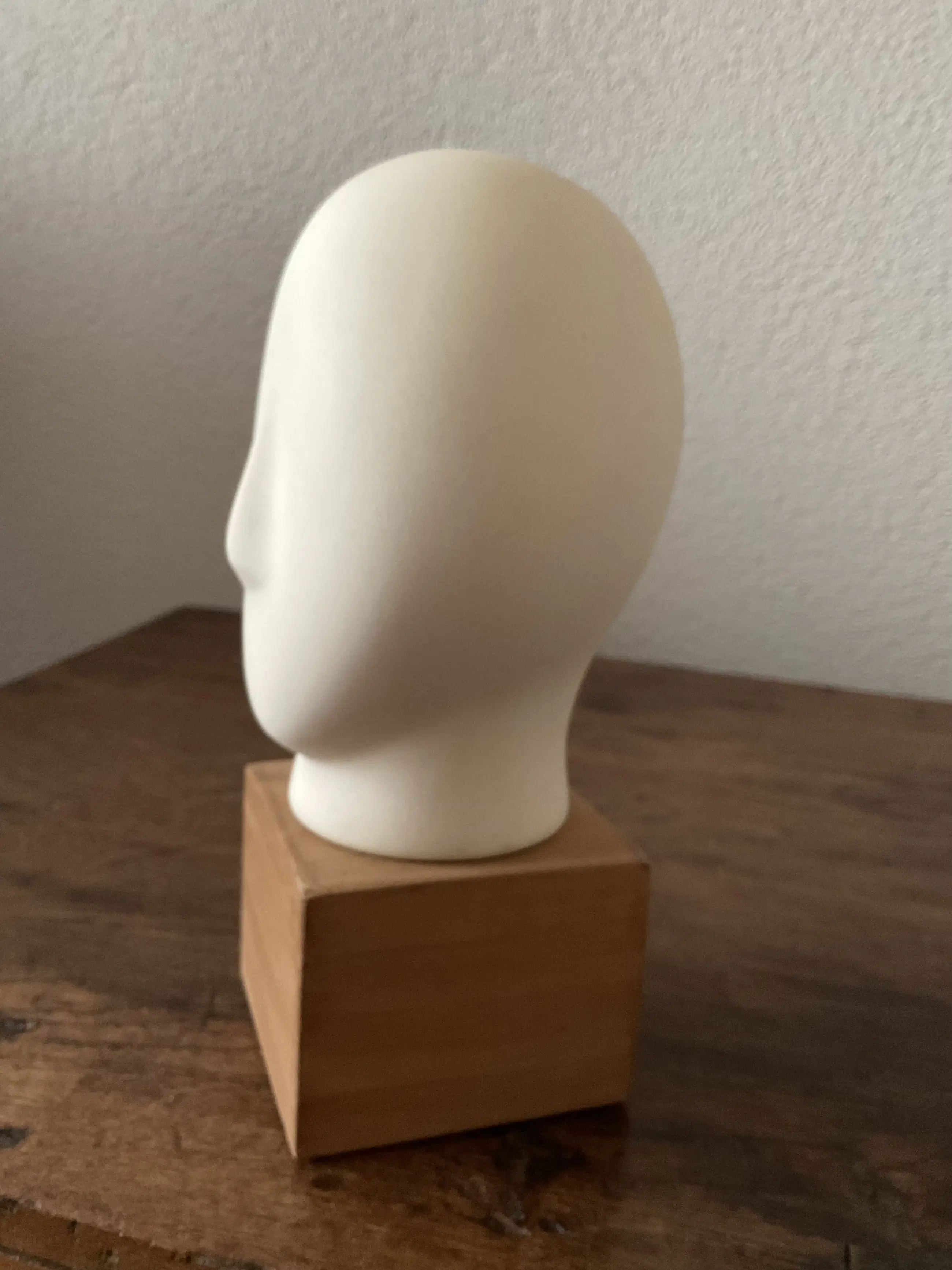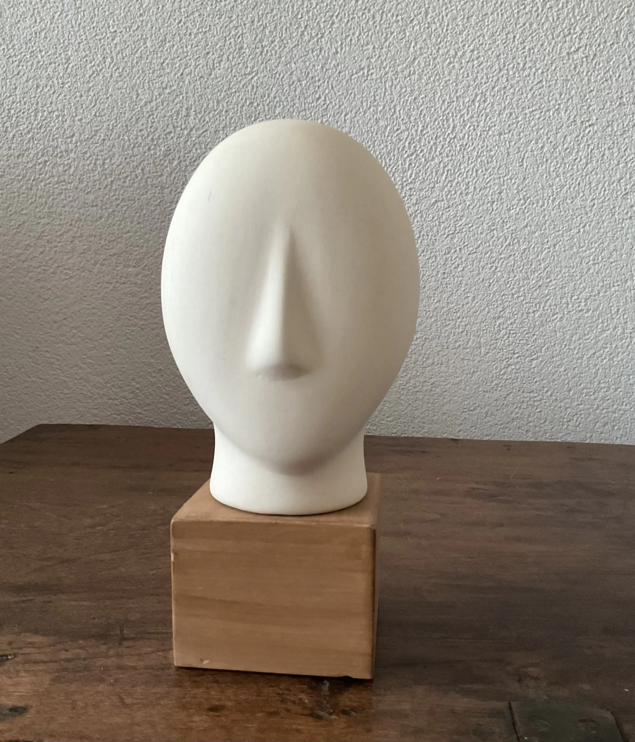 Mooi sereen cycladisch beeld van kunstenaar Ab Majid Speciaal ontworpen in 2003 voor IKEA Naam NÅGON ( somebody) Abstract mens gezicht zonder mimiek Bisque, op houten sokkel Hoogte 21 cm In de originele verpakking Conditie nieuwstaat