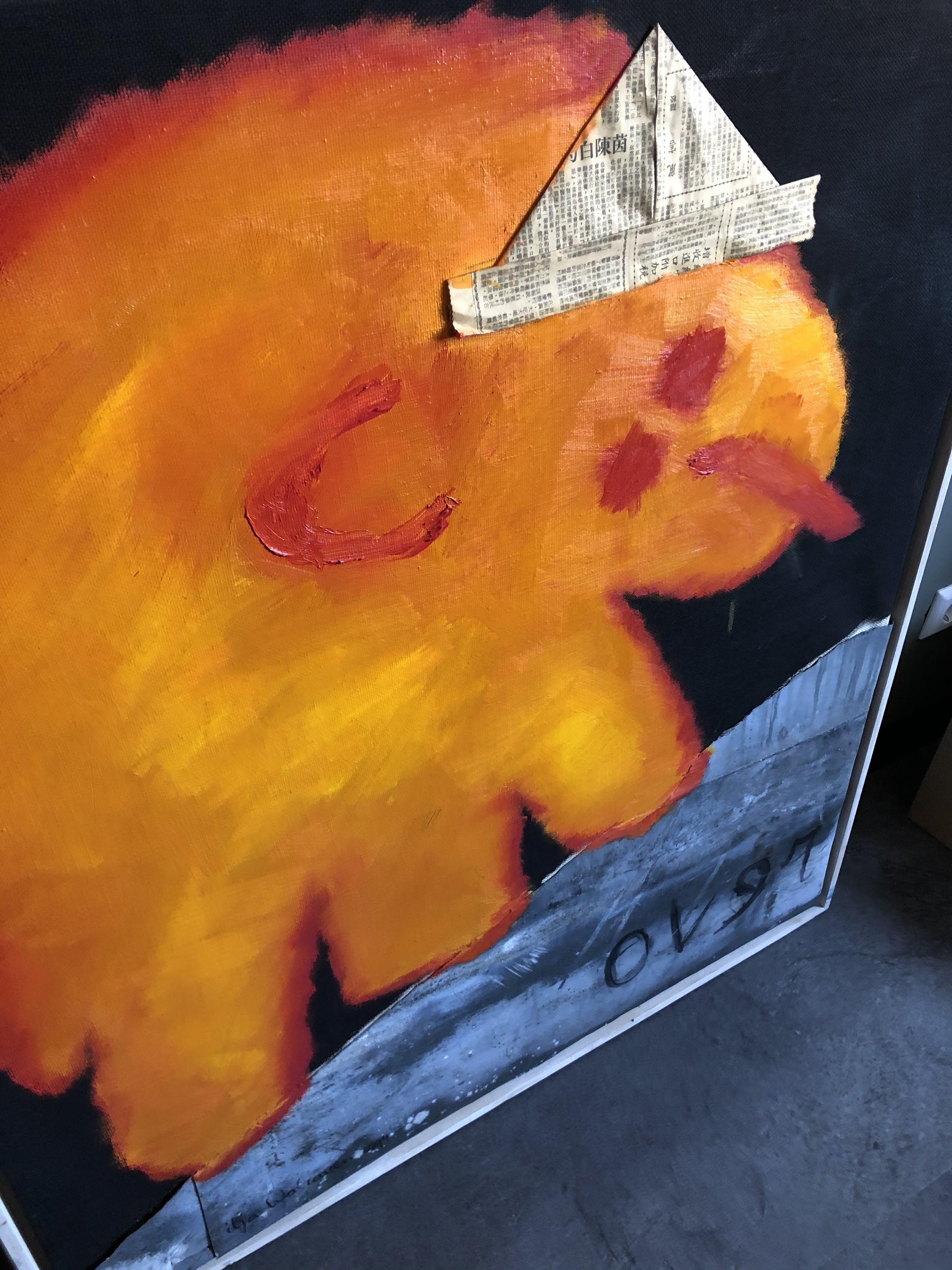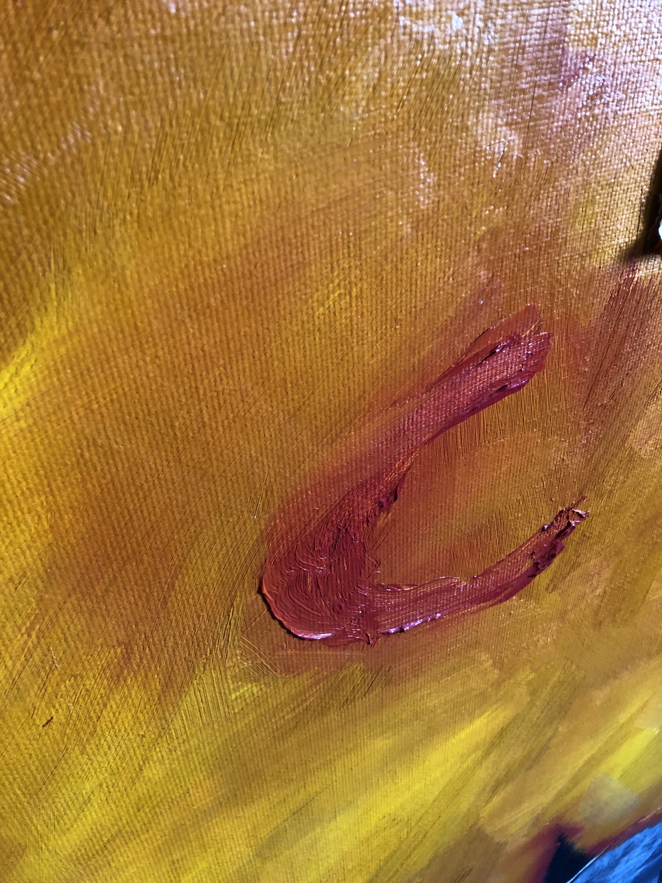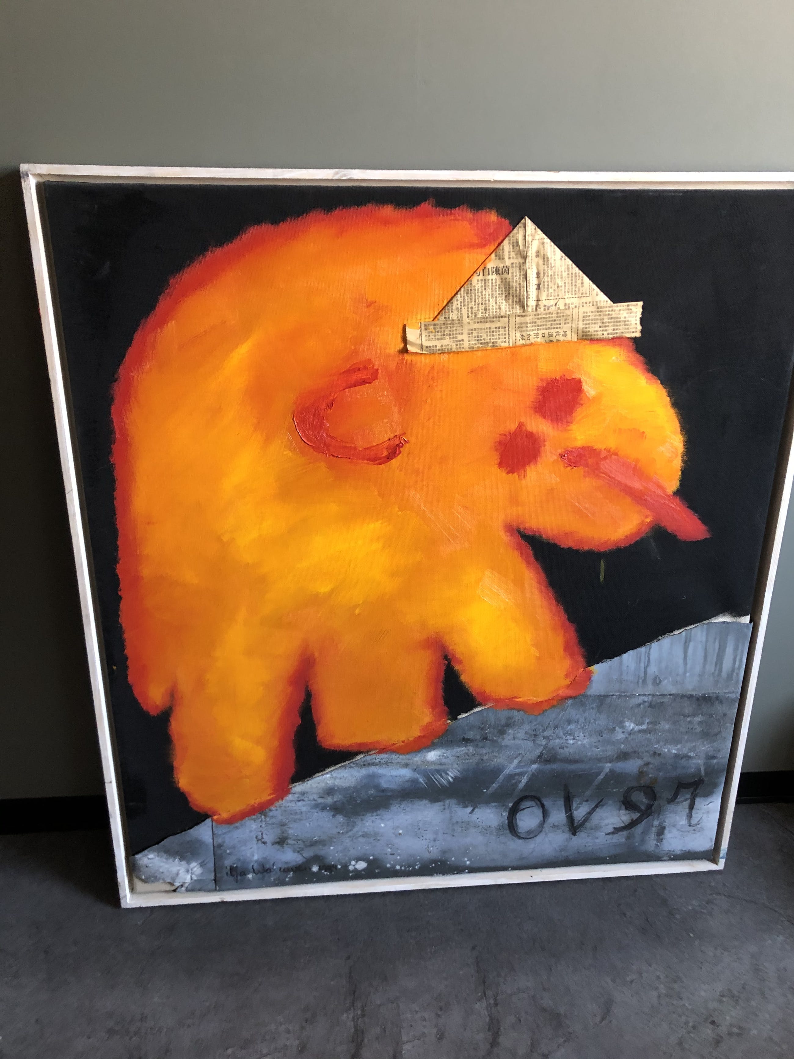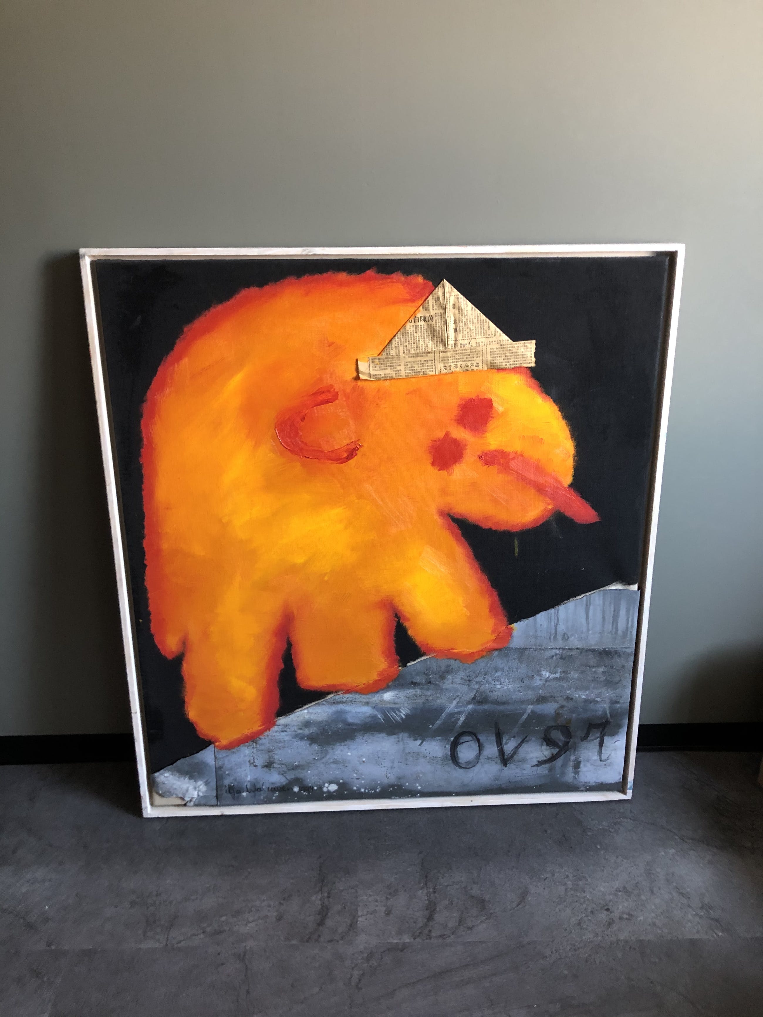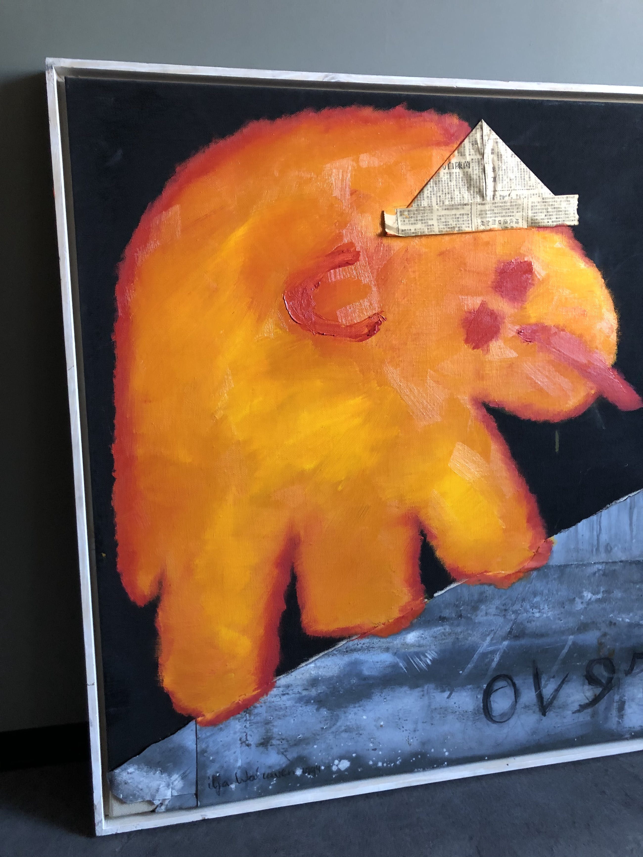 Ilja Walraven gebruikt in dit werk verschillende materialen. Hij heeft stukken zink op het doek geplaatst en heeft delen ervan onbeschilderd gelaten. Voor hem zijn verf, zink en doek gelijkwaardige materialen die elkaar versterken en in evenwicht houden binnen het beeld dat hij creëert. De vormen van dit kunstwerk is simpel en krachtig. Er is één centrale vorm die min of meer figuratief is. Dit element is omgeven door vormen die niet direct herkenbaar zijn als realistische objecten. Deze vormen zijn een deel van de abstracte compositie. Hoe meer we naar een schilderij kijken, hoe meer de abstracte compositie dominant wordt. Zowel de figuratieve vorm als het vleugje humor dat in Walravens voorstelling zit, geeft de toeschouwer een toegang tot de abstracte compositie en de hele schildering. De kleuren in dit schilderij zijn helder en puur. Bij nauwkeuriger observatie wordt de gelaagde structuur van de soms bijna transparant gekleurde gebieden zichtbaar. De krachtige helderheid van de kleuren contrasteren met het zink en het onbeschilderde doek.