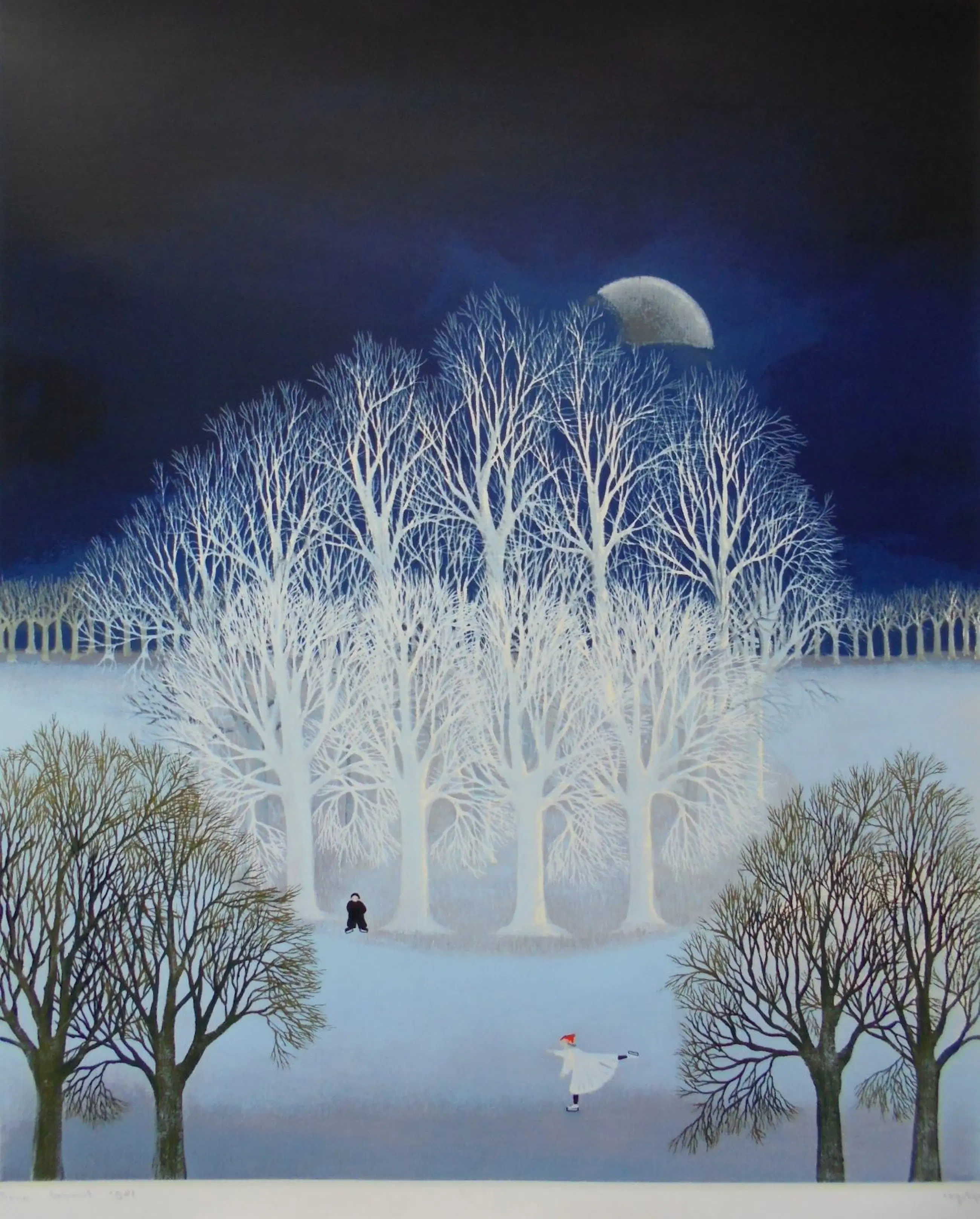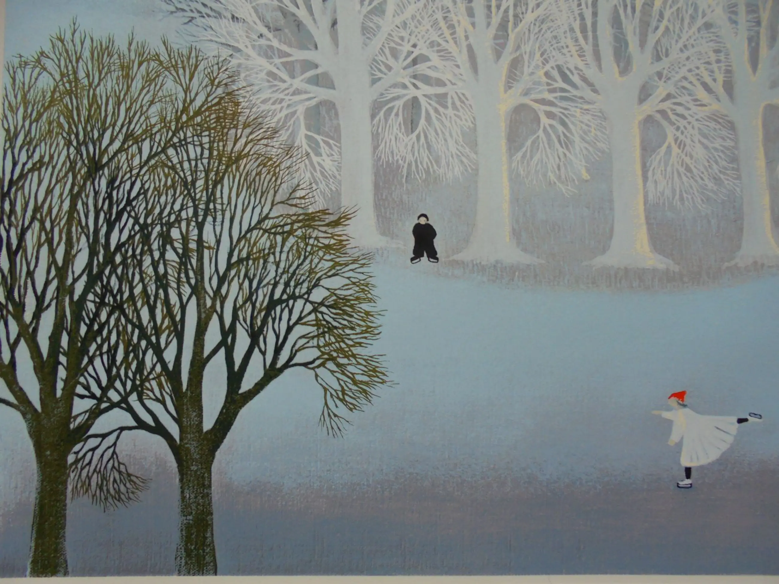 Prachtige winterlandschap van de kunstenaar Ilona Smit. De afbeelding is zeer gedetailleerd en daardoor veel te zien Mooie kleuren en een schaats thema. Zeefdruk is genummerd en gesigneerd en in bijna nieuwstaat. Afmetingen beeld: 59 x 50 cm.