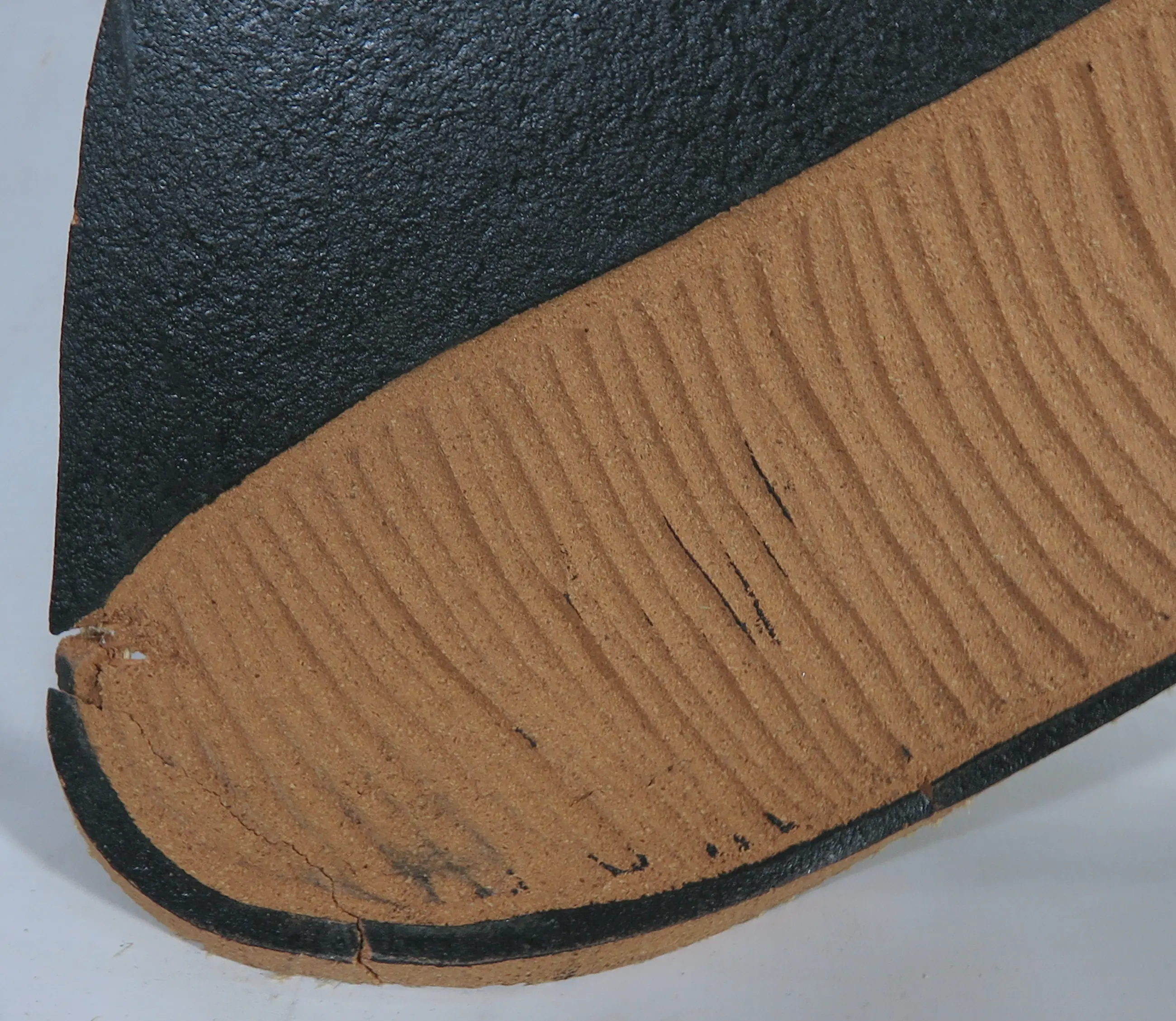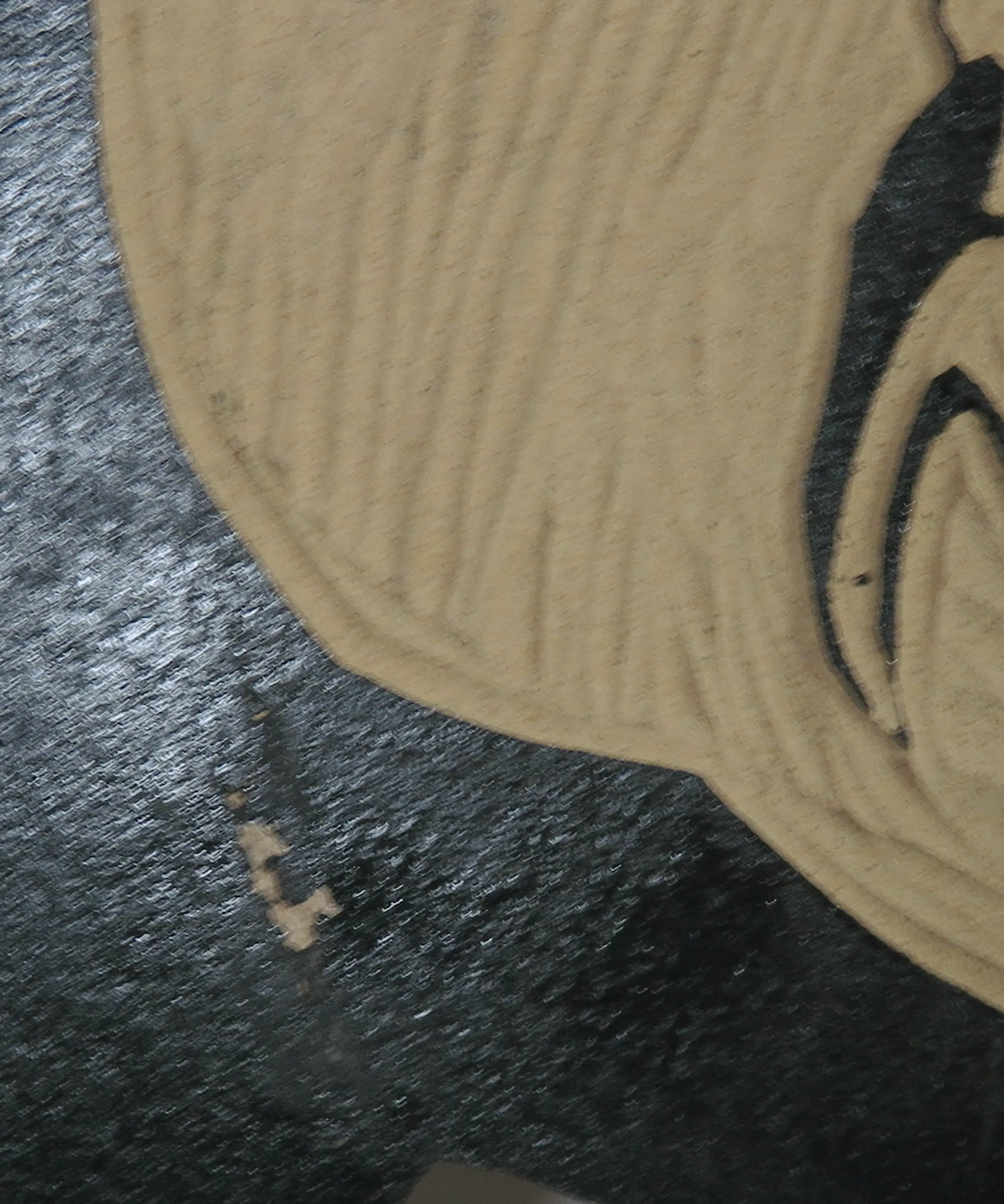 De ellebogen zijn gebogen en een beetje doorgescheurd. Er is ook een kleine imperfectie op het hoofd met de knot. | |
