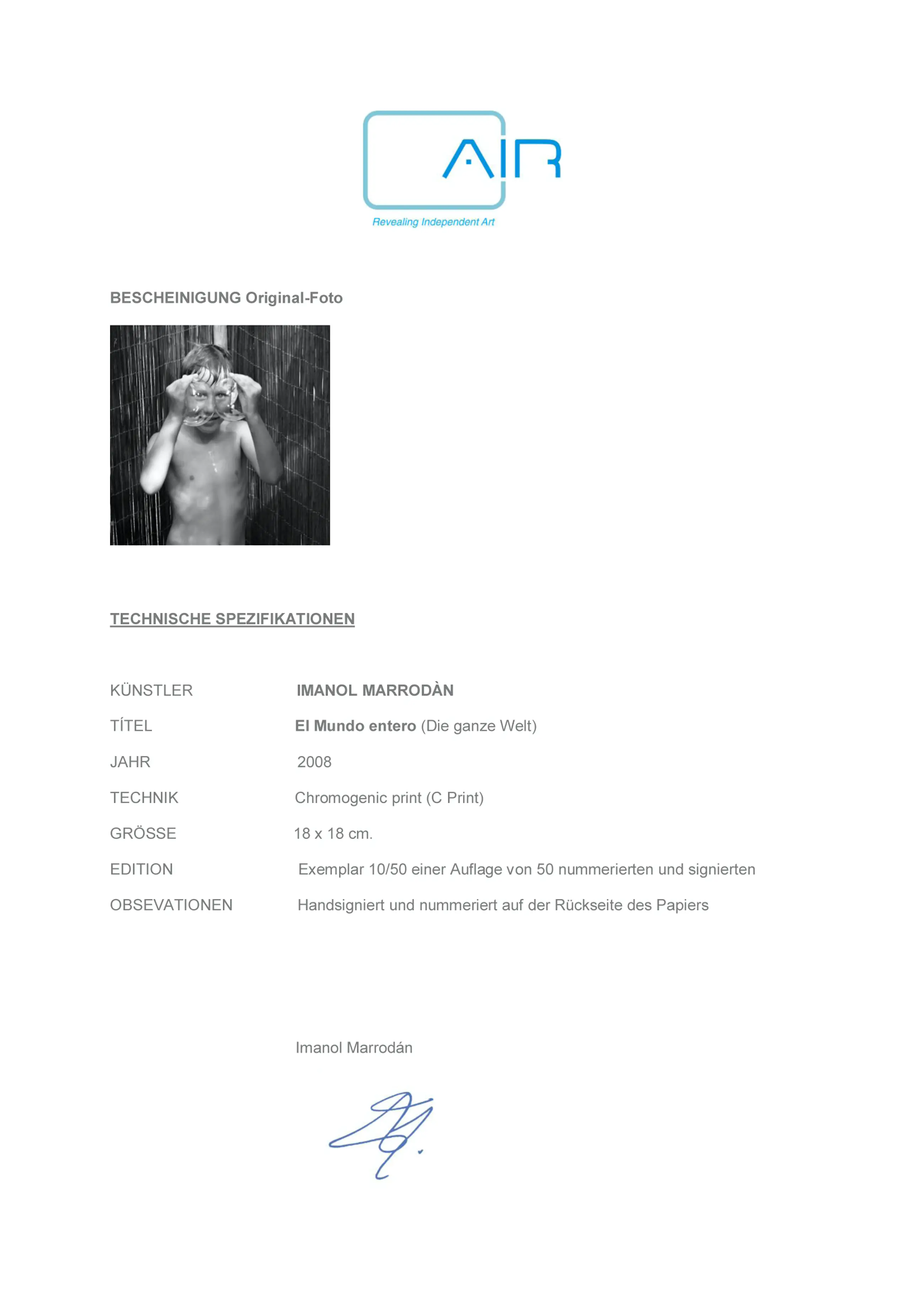 Imanol Marrodán (1964) Titel: El Mundo entero (Die ganze Welt) 2008 Chromogener Abzug (C-Print) 18 x 18 cm. AUFLAGE: 10/50 einer Auflage von 50 nummerierten und signierten Exemplaren. Signiert, betitelt und nummeriert mit Permanentmarker auf der Rückseite der Fotografie. Das vom Künstler signierte Echtheitszertifikat ist im Lieferumfang enthalten.