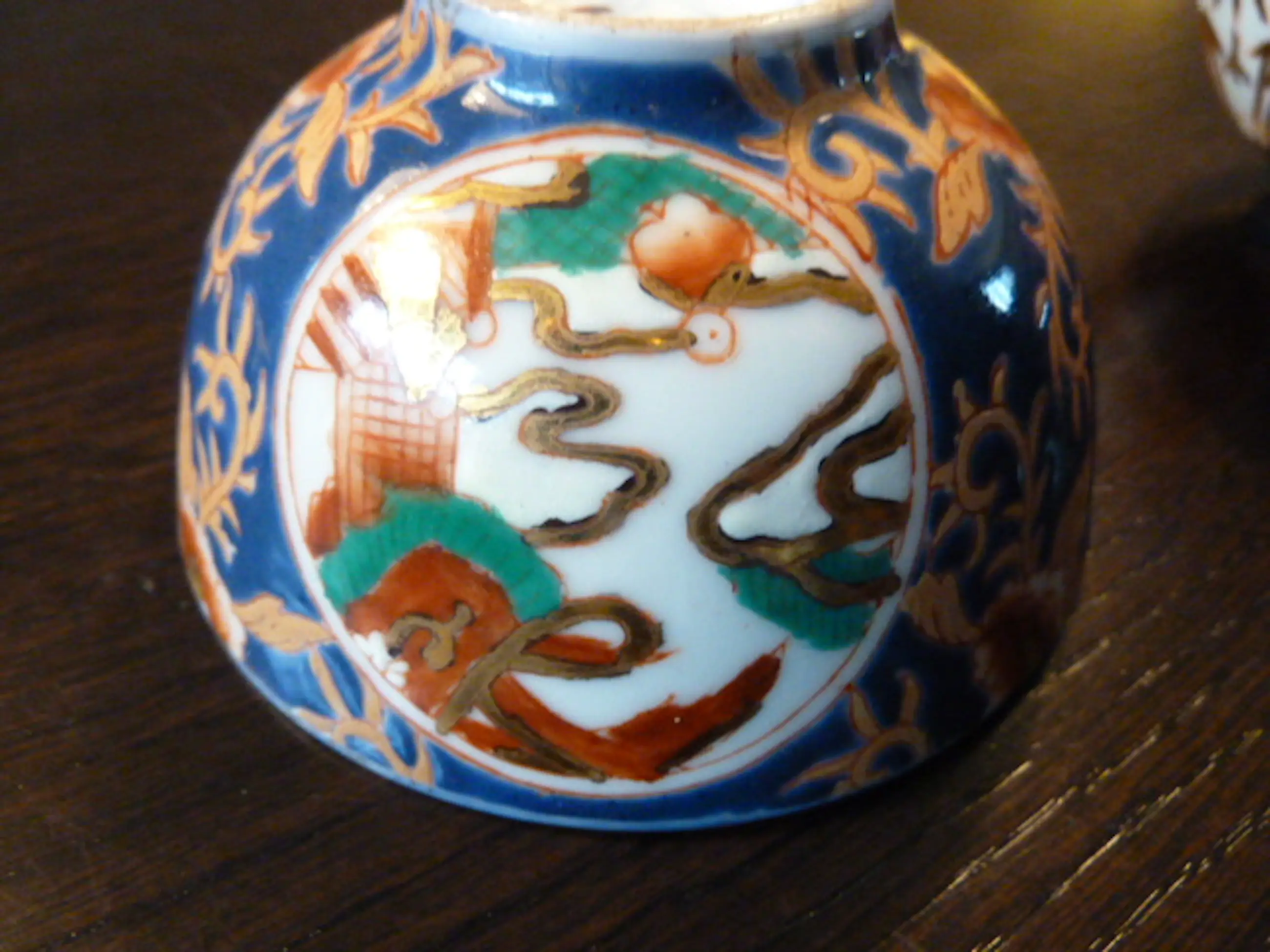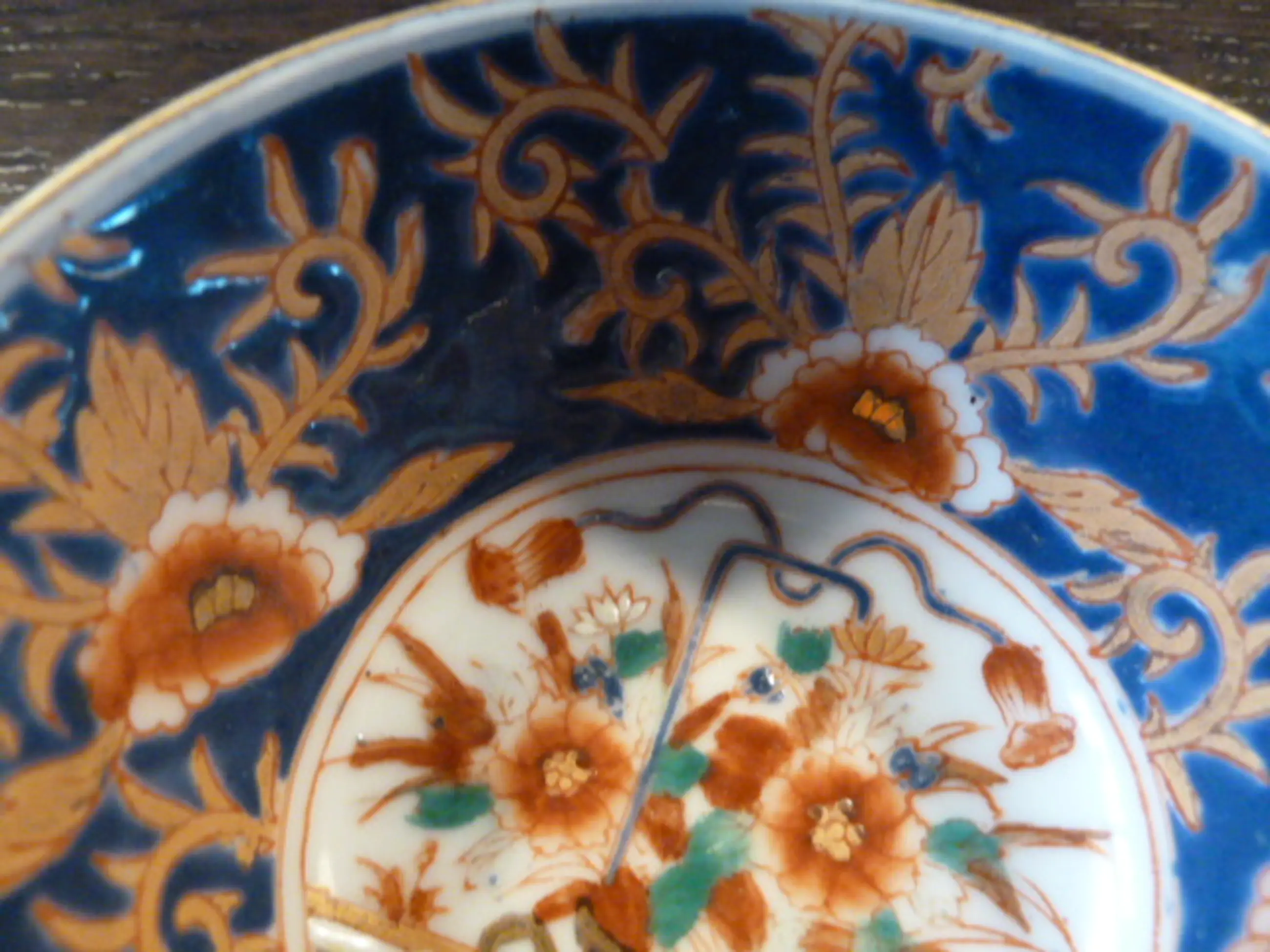 Handgeschilderde Imari porseleinen kommen (2 stuks). Voorzien van 4 karaktermerken. Decoraties van bloemen, gouden bladranken uitgespaard in diep donkerblauw dik opgelegd glazuur. Diameter 10 cm breed en 5,5 cm hoog. In uitstekende staat. Uit nalatenschap.