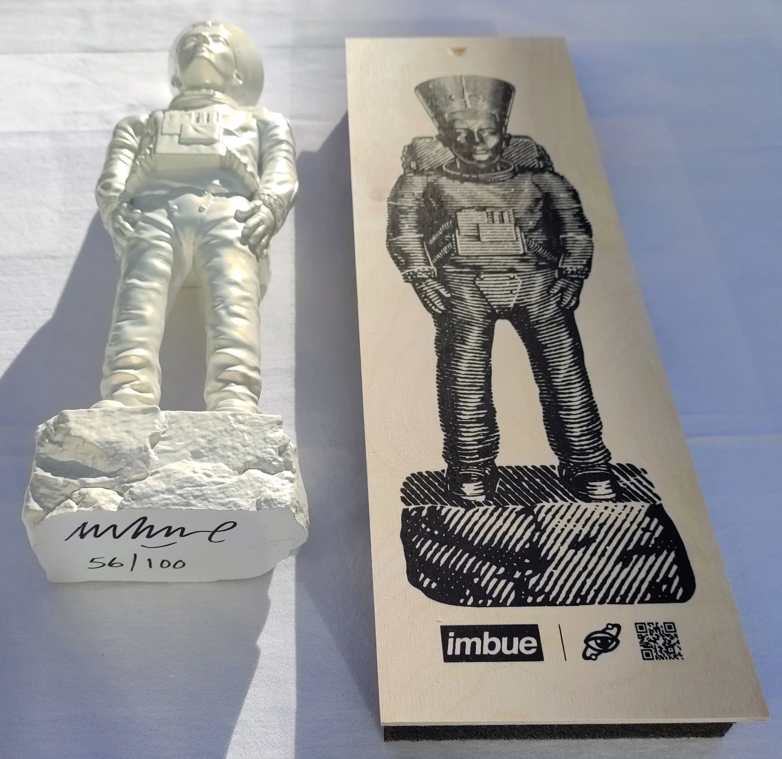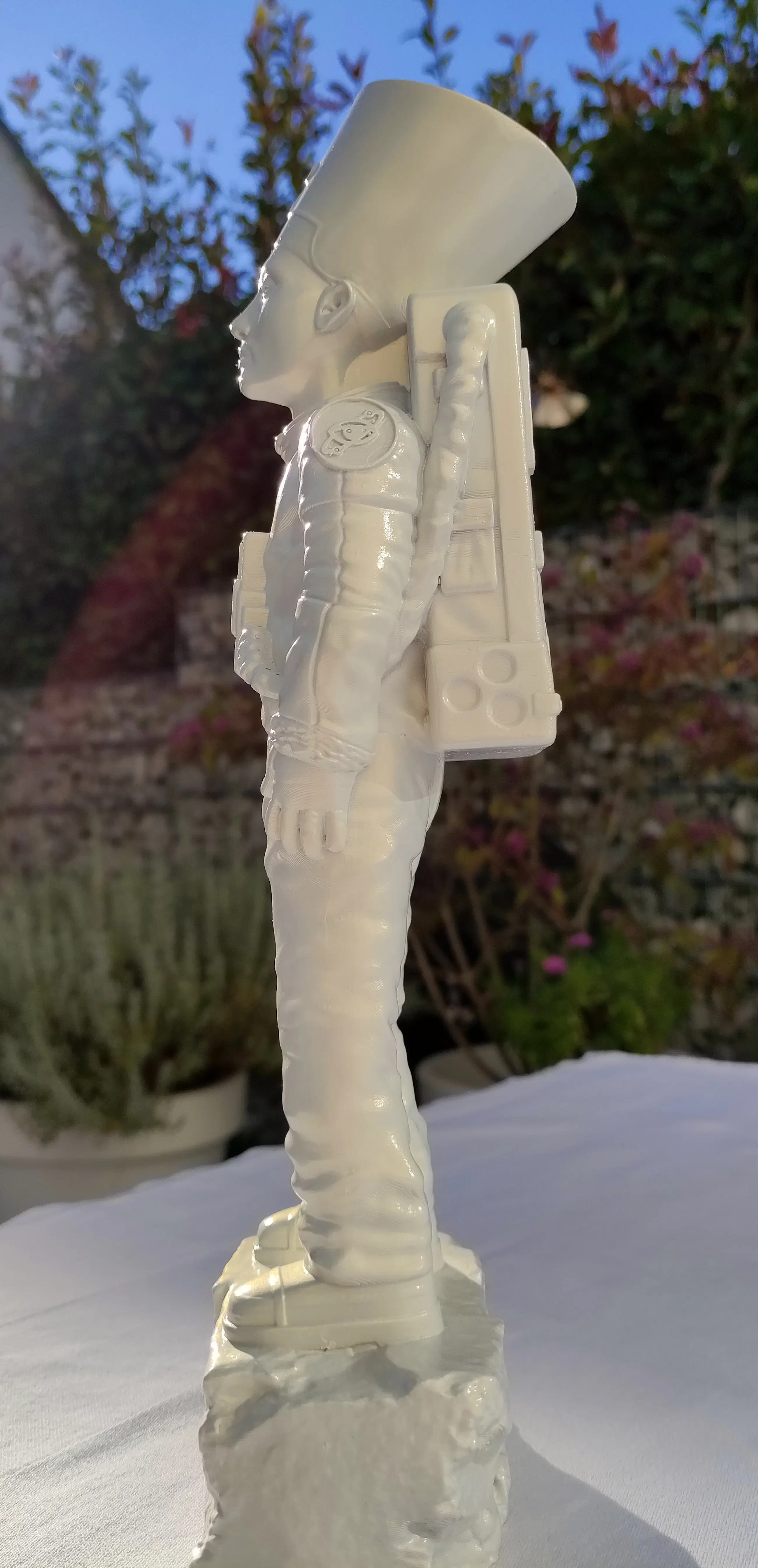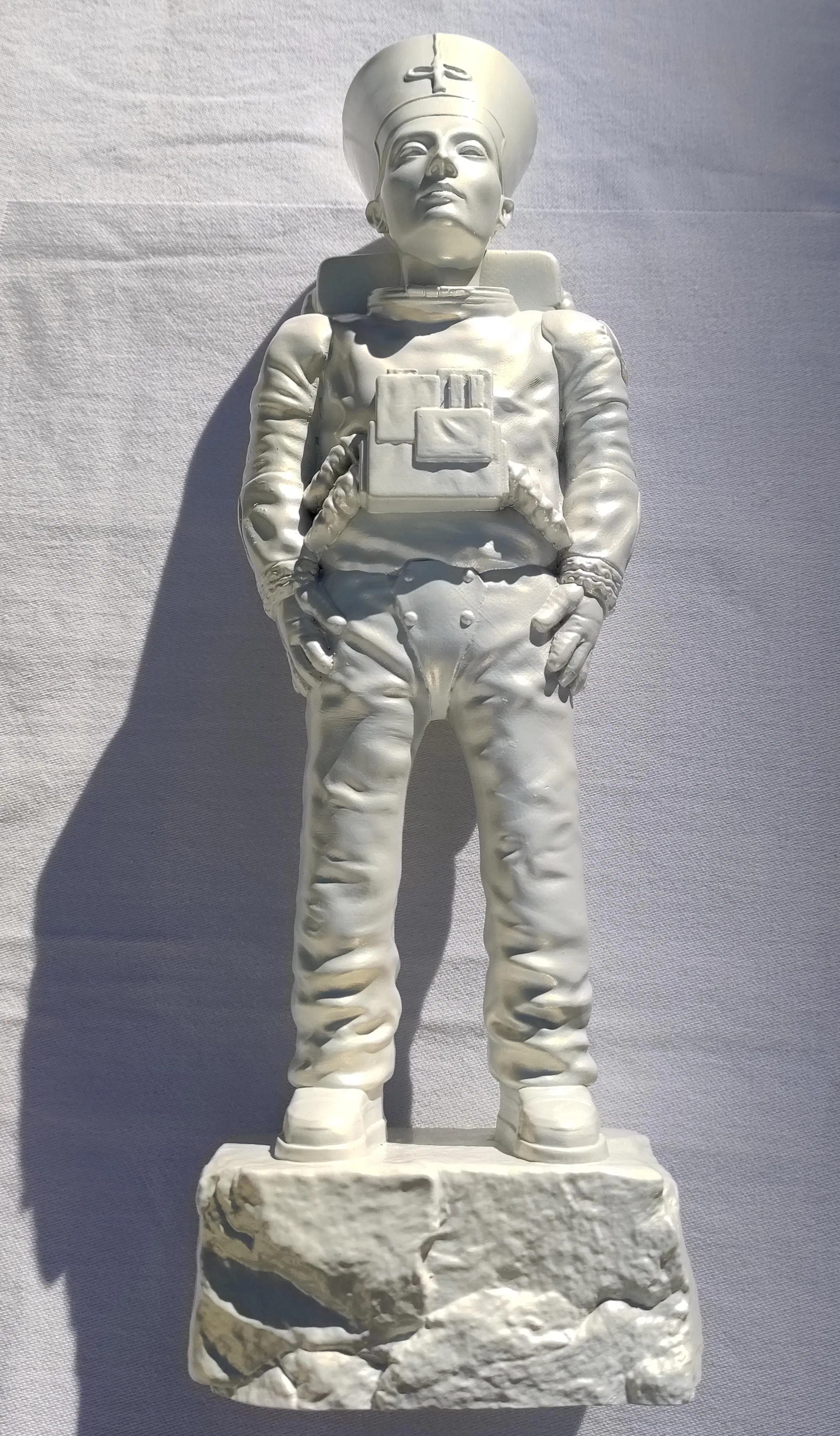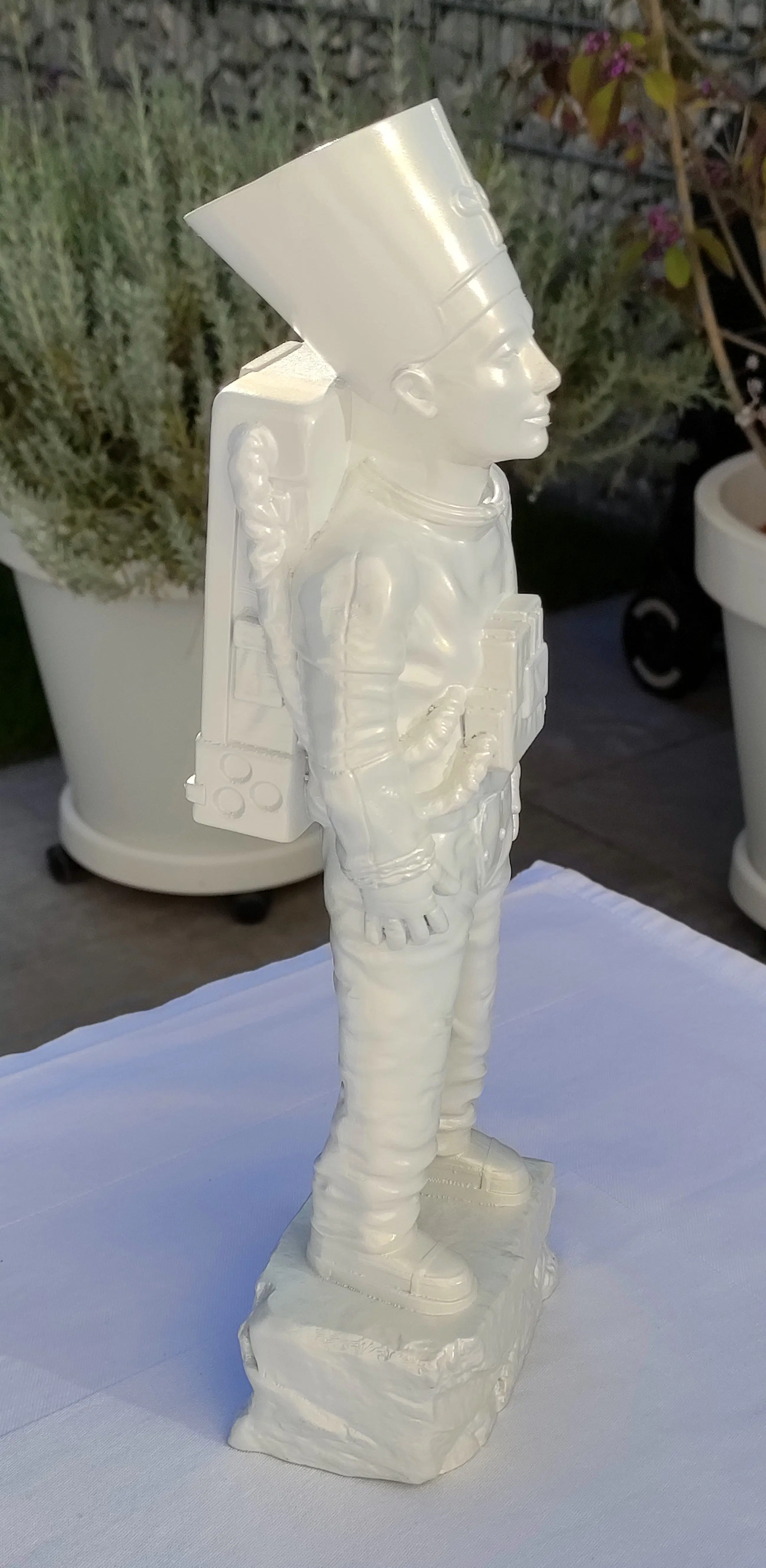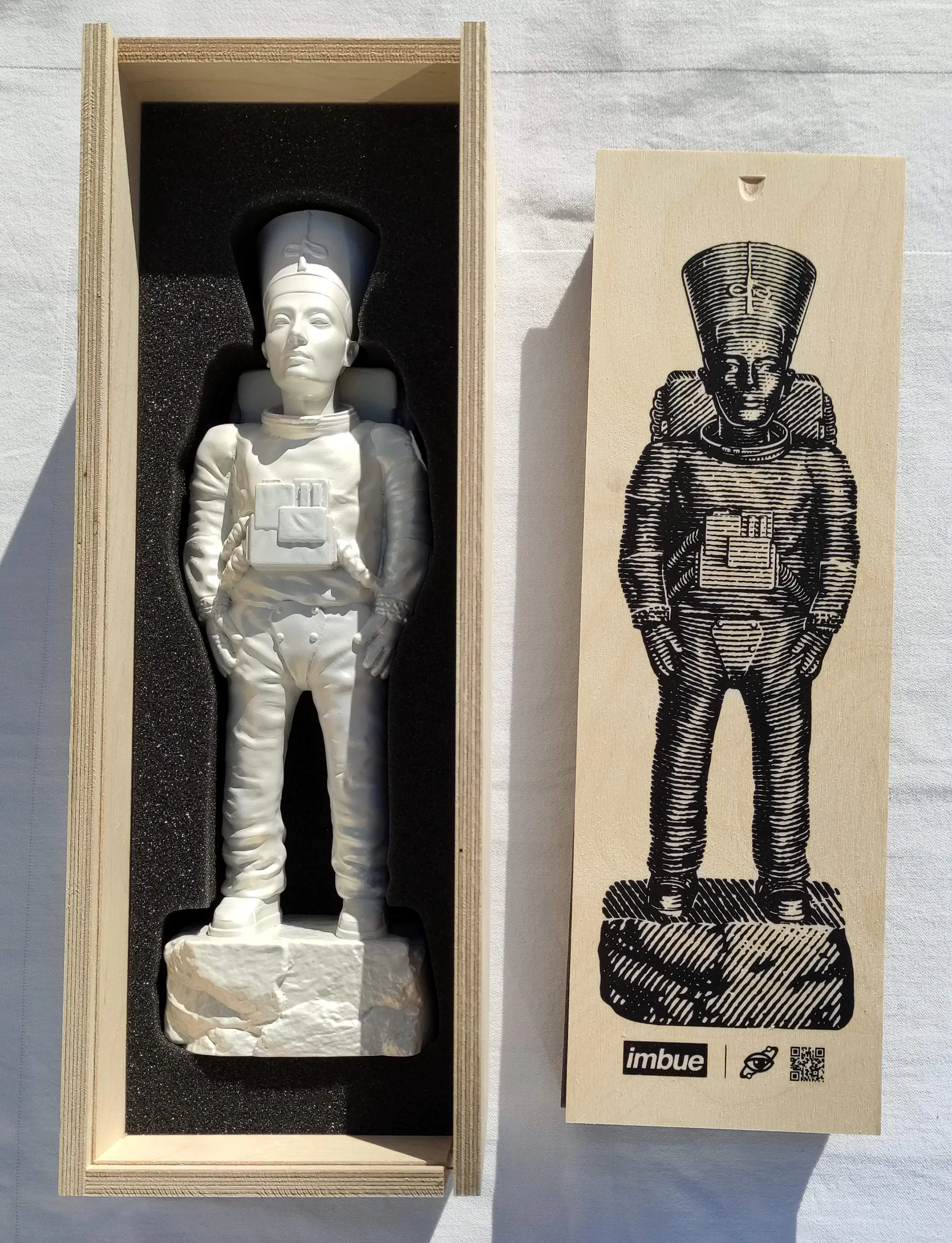 Het XL Ancient Astronaut Nefertiti-beeld is een hybride van Nefertiti (de belangrijkste vrouw van farao Achnaton) en een astronaut. Het werk is gemaakt van kunsthars en heeft een parelwitte afwerking. Het beeld is aan de onderkant met de hand gesigneerd en genummerd. Het wordt geleverd met een Certificaat van Echtheid (COA) in een op maat gemaakte, bedrukte doos van berkenmultiplex met een beschermende schuimrubberen inleg.