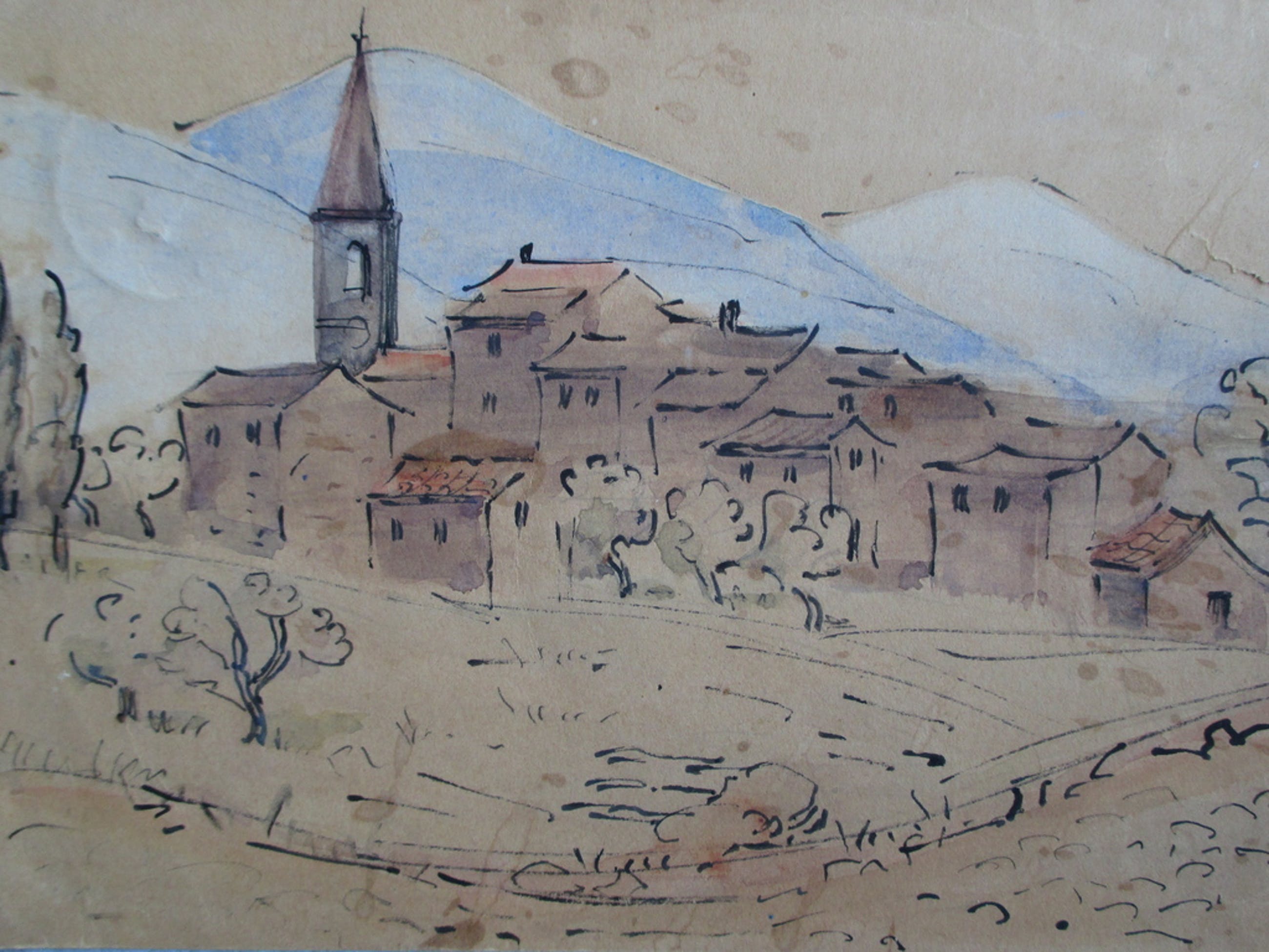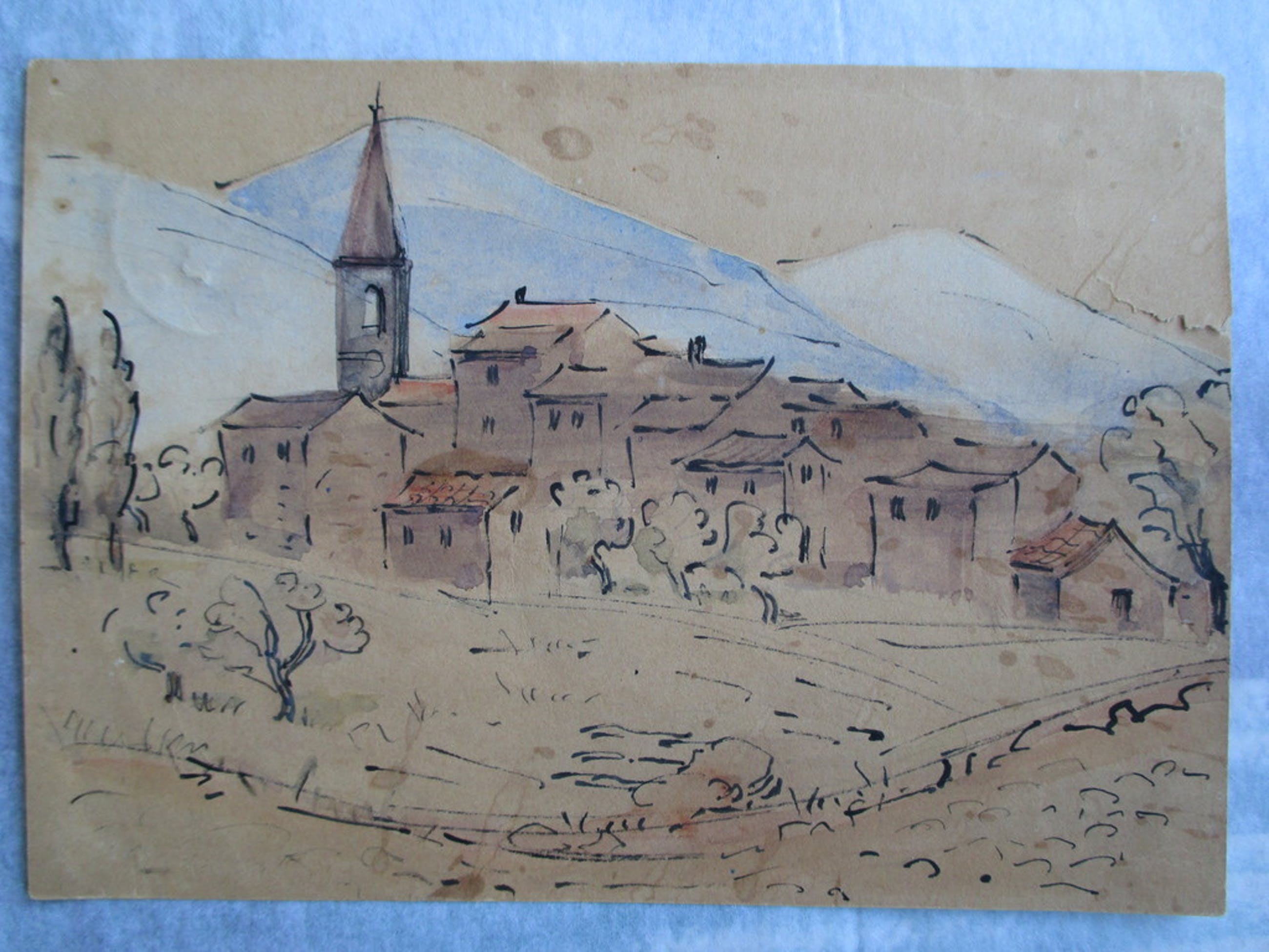 Een bijzondere geaquerelleerde pentekening op een briefkaart uit Comano van Ina Hooft (1894-1994) uit 1958, geadresseerd aan Harm Kamerlingh Onnes (schilder, 1893-1985). De achterkant is beschreven. De kaart is afkomstig uit de nalatenschap van Harm Kamerlingh Onnes.