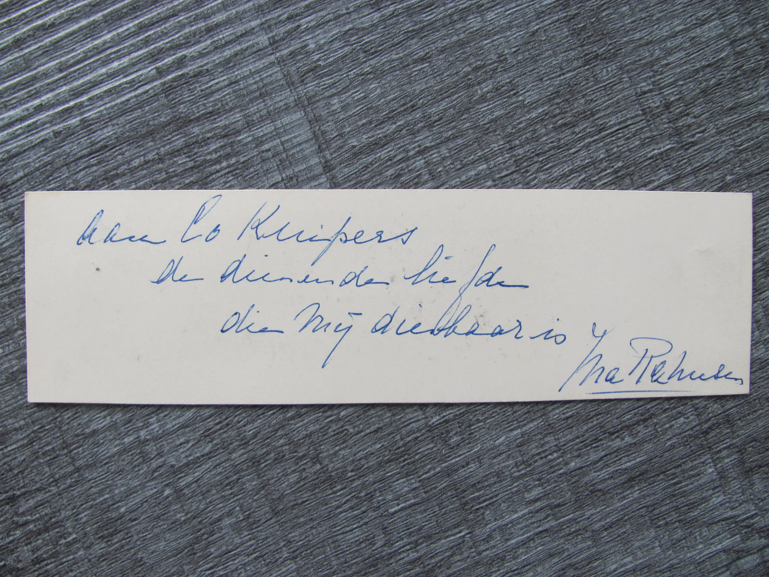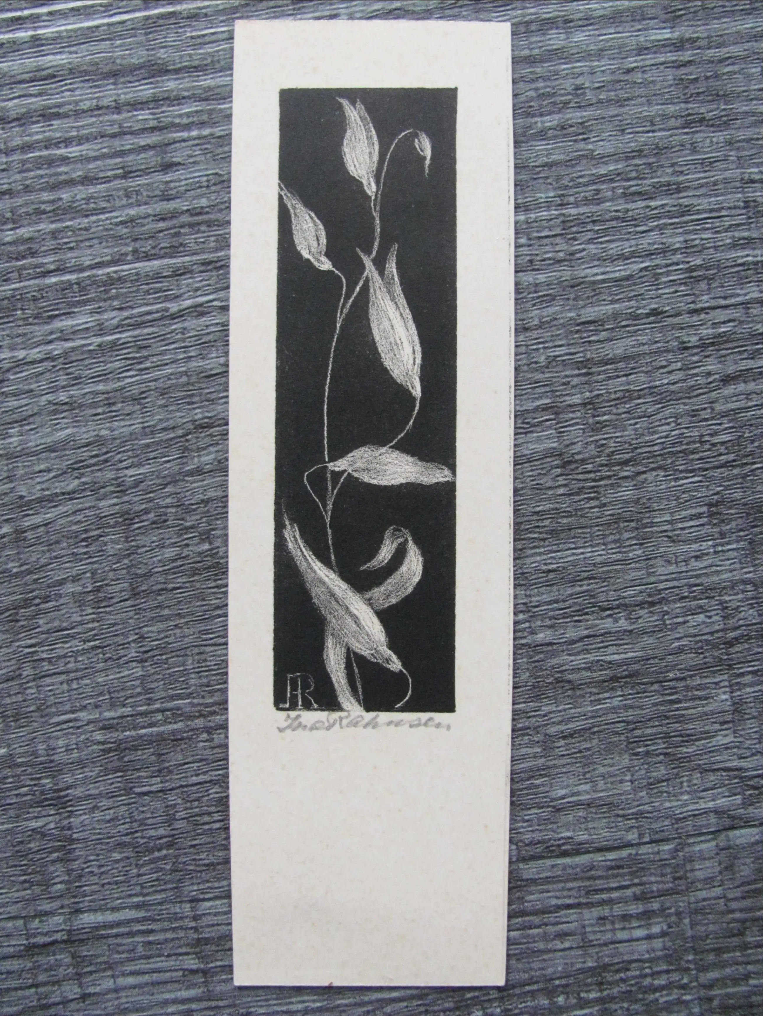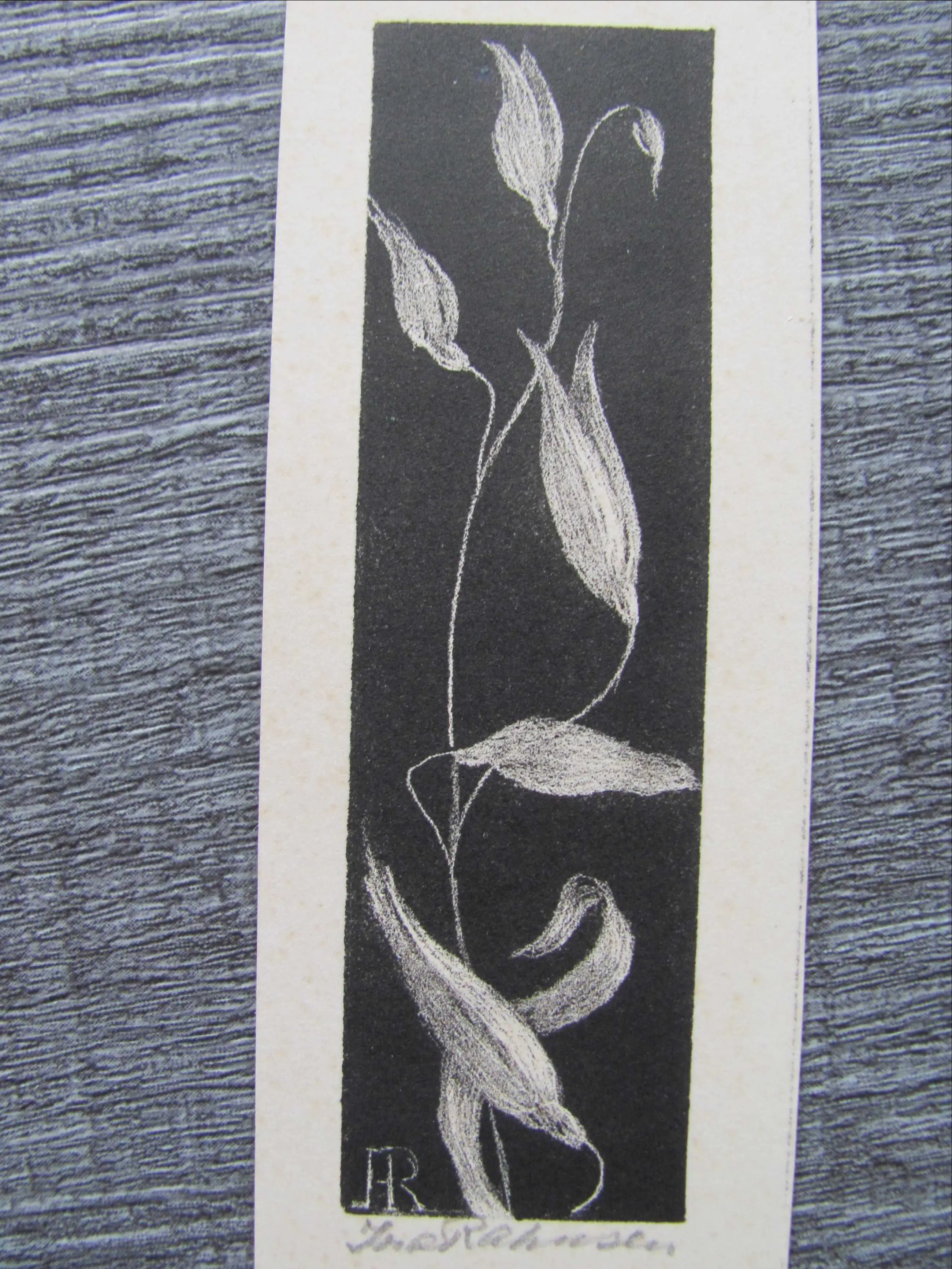 Kleine houtsnede (of ets) van Ina Rahusen. Onder de afbeelding met potlood gesigneerd. Aan achterzijde met tekst: "de heer Co Kuipers, de dienende liefde die mij dierbaar is. Ina Rahusen". Totale afmeting van het papier is 13 cm hoog en 4 cm breed. Wordt als brievenbuspakket met Track en Tracecode verzonden (ophalen ook mogelijk).