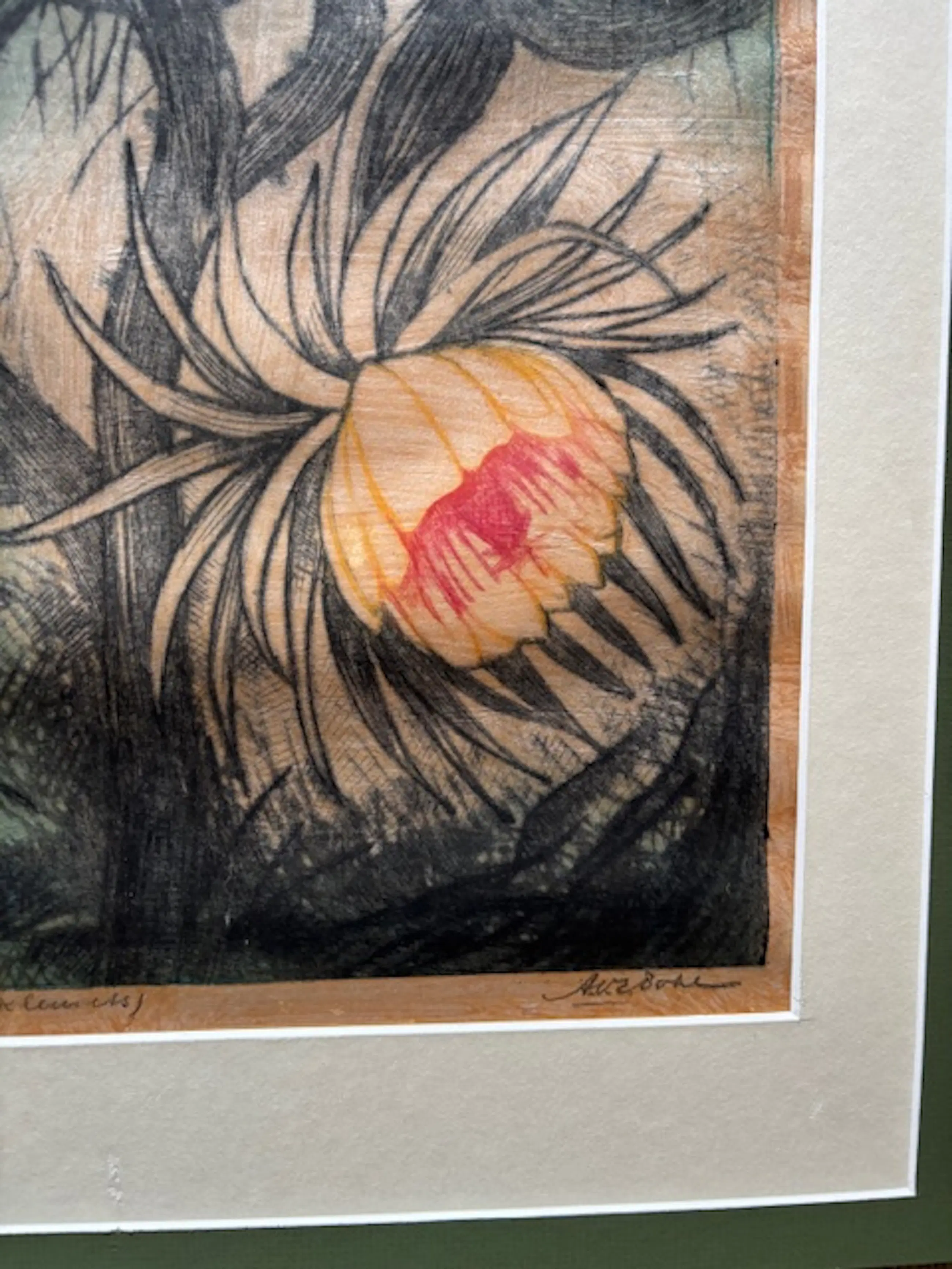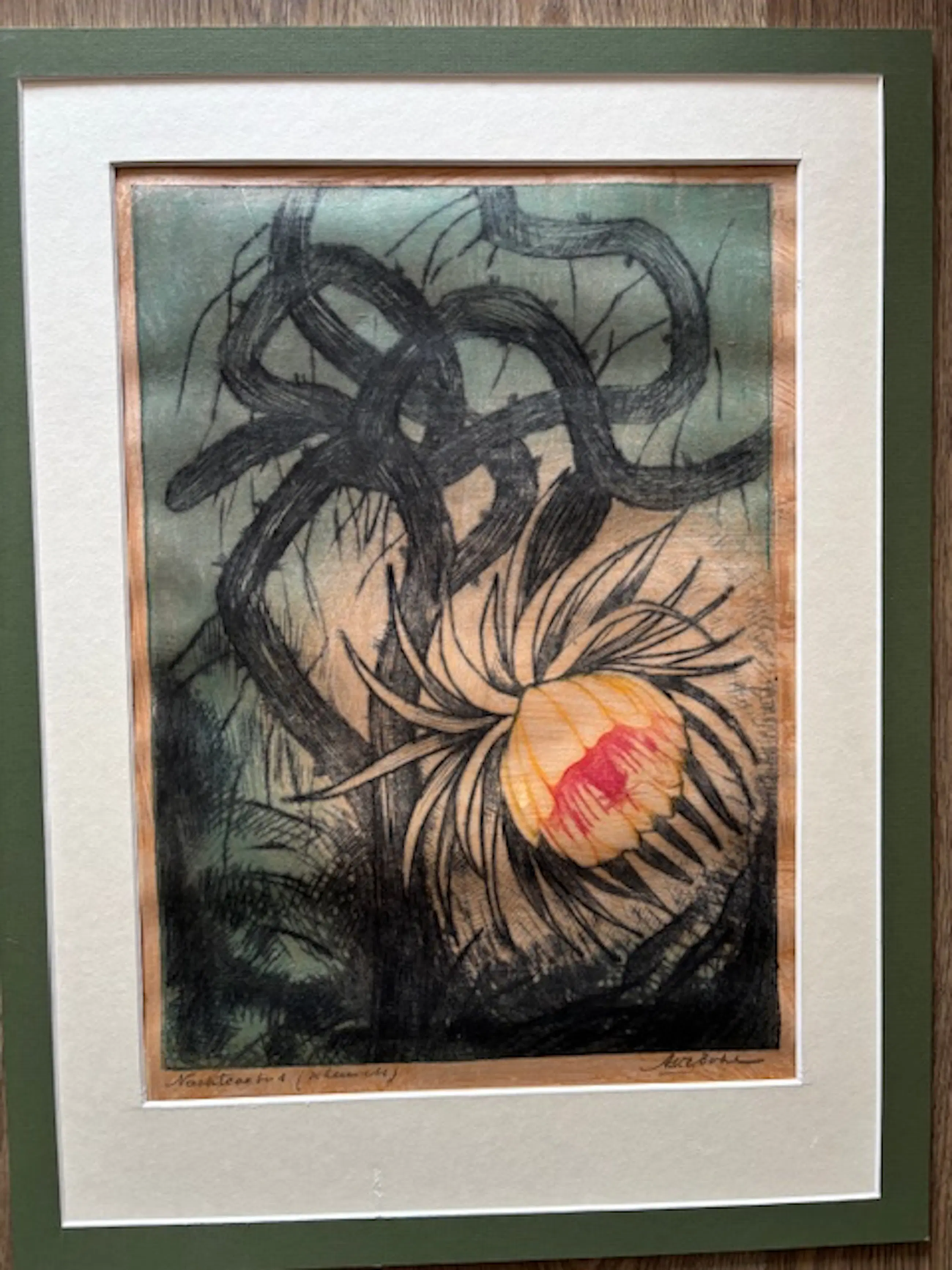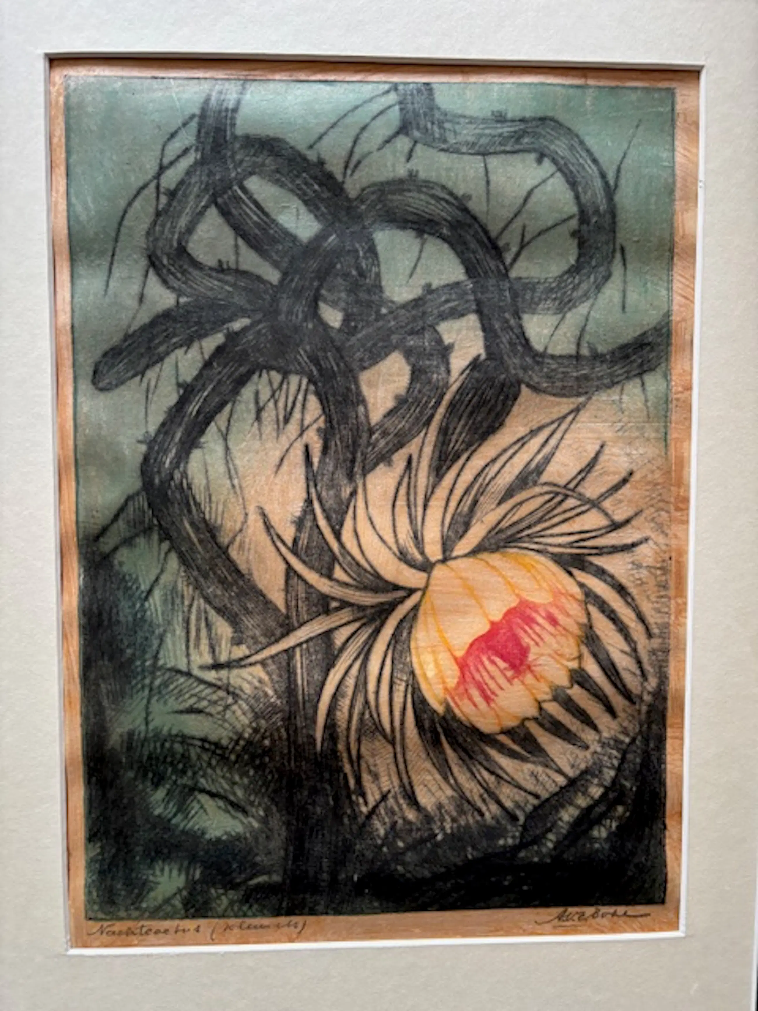 Mooie oude ets met voorstelling van bloeiende cactus ('Nachtschade' getiteld). De signatuur kan ik niet thuisbrengen helaas.