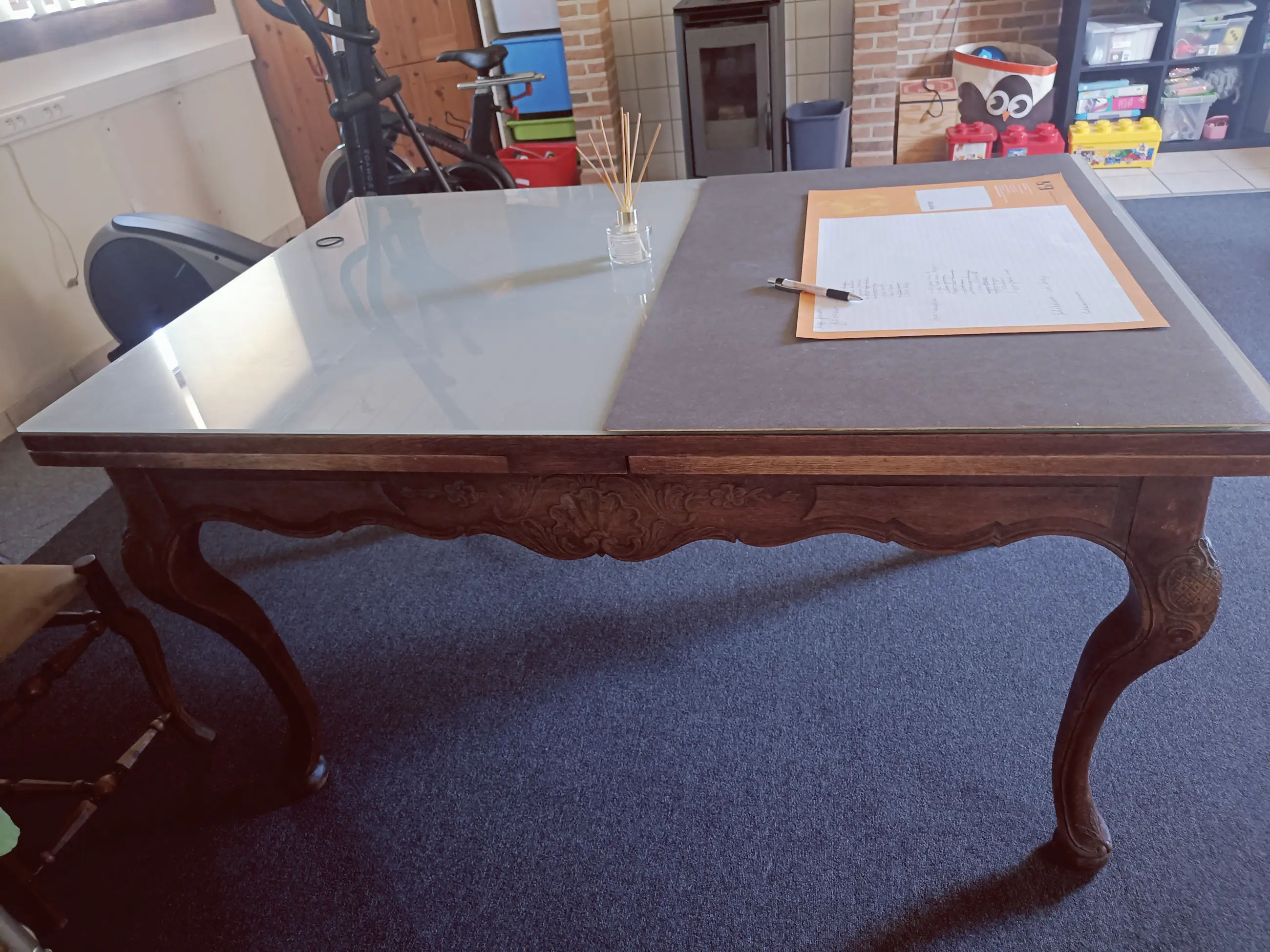Tafel en stoelen in perfecte staat. Tafel kan langs beide zeiden vergroot worden. Steeds gebruikt met glazen plaat erop Alle stoelen zijn voorzien van nieuwe bekleding.