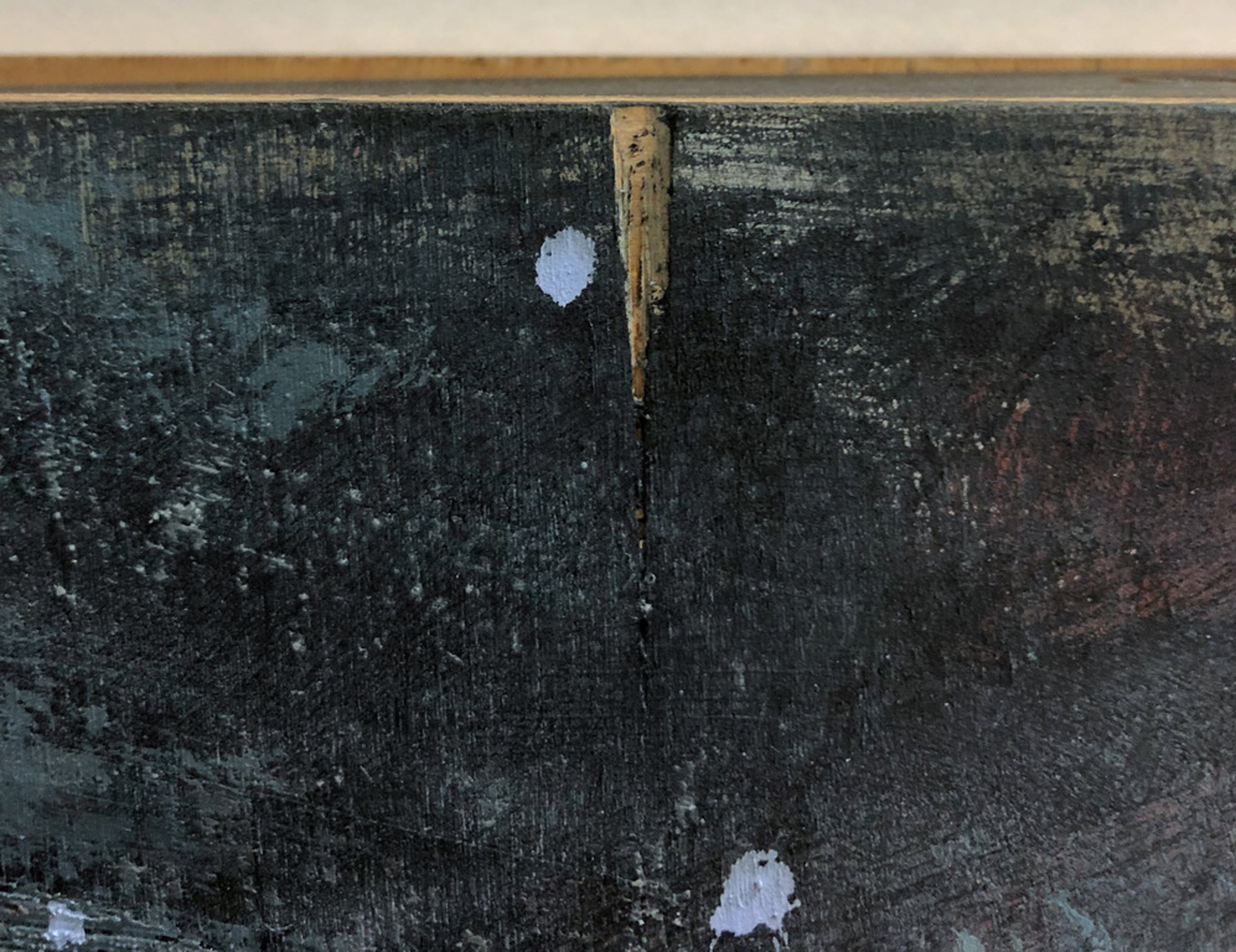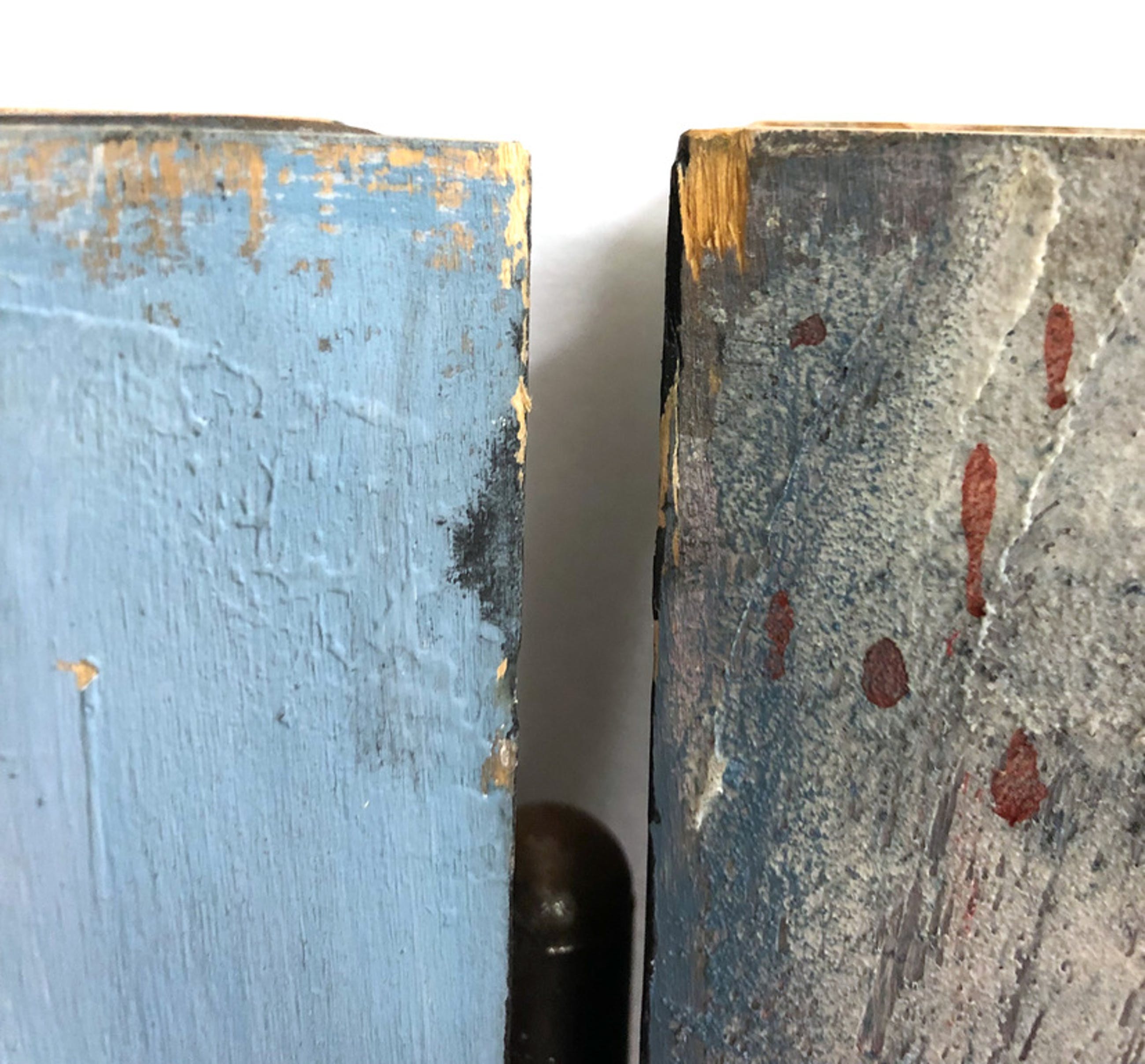 Conditie: In zeer goede staat. Op het eerste paneel ontbreekt aan in de linkerbovenhoek een stukje hout. Het laatste paneel heeft rechtsboven in de hoek twee plekken waarvan een stukje hout ontbreekt. De pootjes van dit werk zijn verroest en rollen niet goed. Daarnaast is het uiterste pootje rechts afgebroken (is aanwezig) (zie foto's).