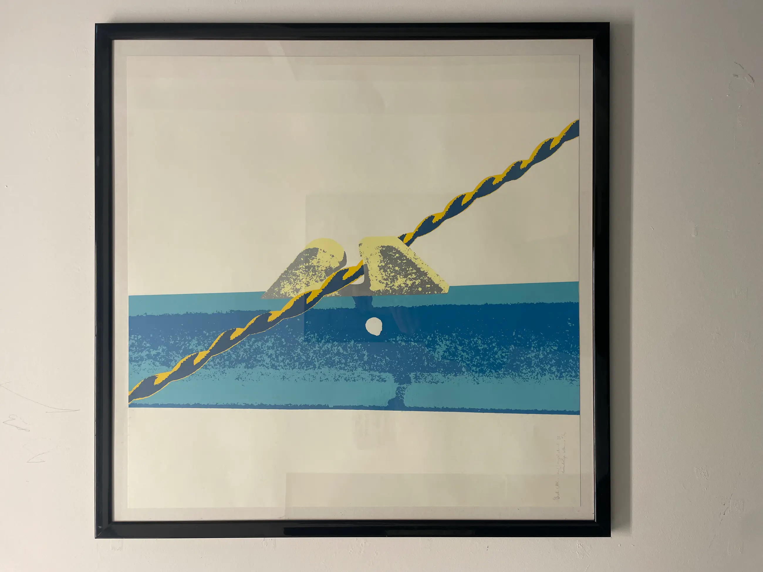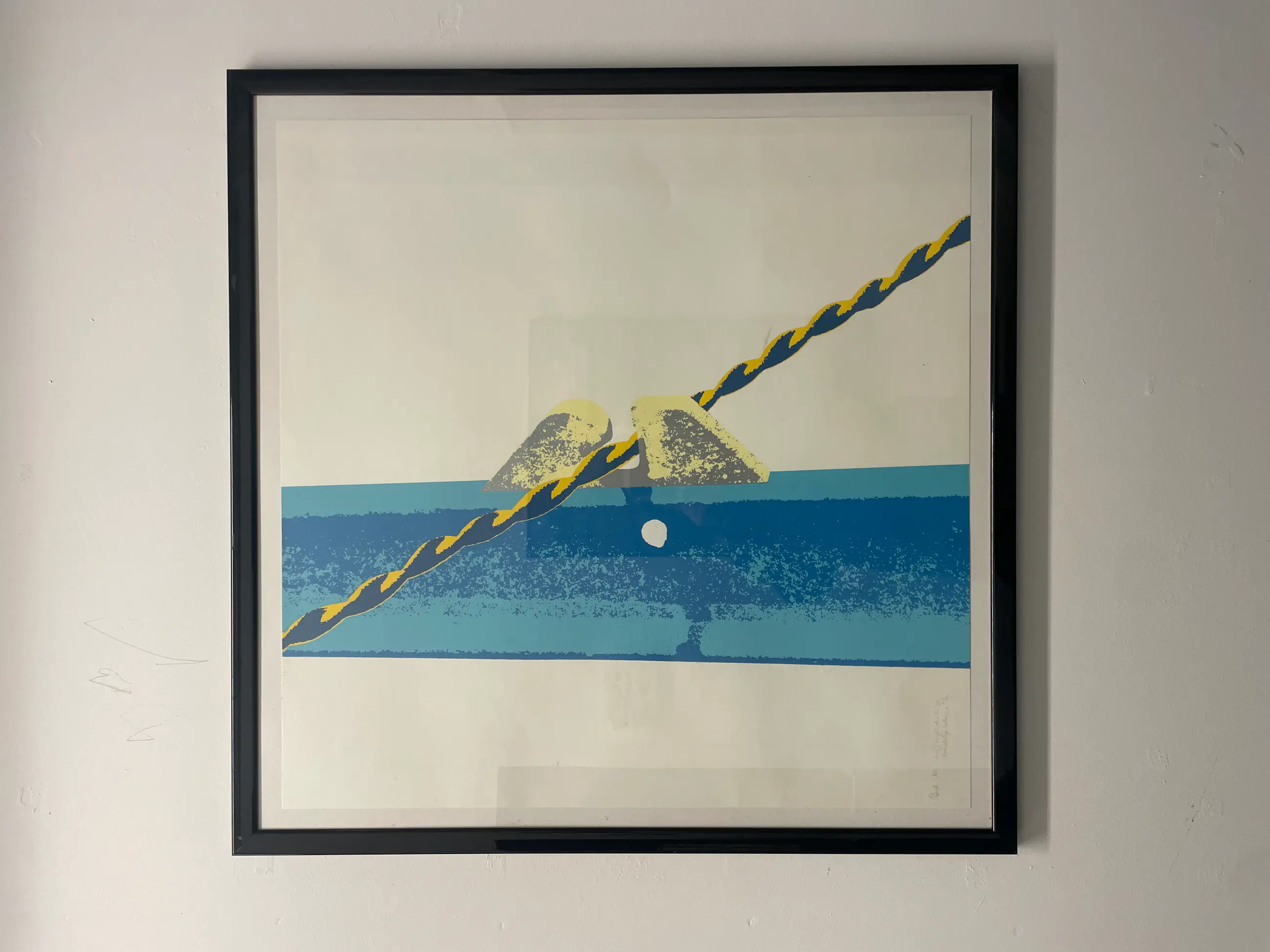 Ineke Calis – Zeefdruk (1992) Abstracte zeefdruk van Ineke Calis, uitgevoerd in een evenwichtige geometrische compositie met krachtige kleurvlakken. Het werk is kenmerkend voor het grafische oeuvre van de kunstenaar en sluit goed aan bij een modern of minimalistisch interieur. De zeefdruk is uitgevoerd als eigen druk, is handgesigneerd en genummerd in potlood onder de voorstelling. Het betreft een origineel grafisch werk. Het werk verkeert in goede staat en is ingelijst. Gegevens Kunstenaar: Ineke Calis Techniek: zeefdruk (eigen druk) Jaar: 1992 Oplage: genummerd Signatuur: handgesigneerd in potlood Afmetingen (beeld): 65 × 65 cm Lijst: inbegrepen