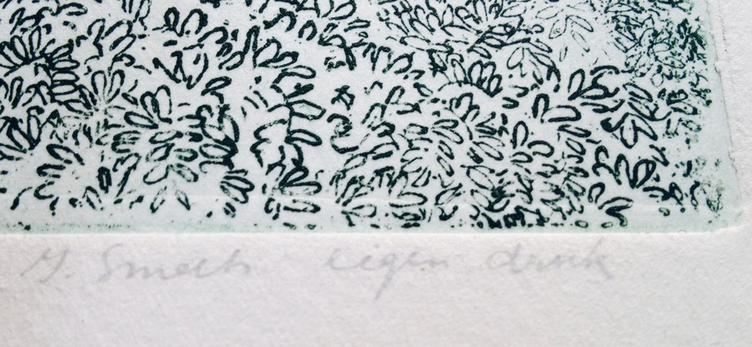 Het werk is in uitstekende staat, de kunstenaar heeft het met de hand in potlood onder het werk gesigneerd, genummerd 5/40 en voorzien van de opmerkingen 'ets + aquatint' en 'eigen druk'. Het blad meet 28x32 (cm)2, de druk is 17,4x19.5 (cm)2 groot.