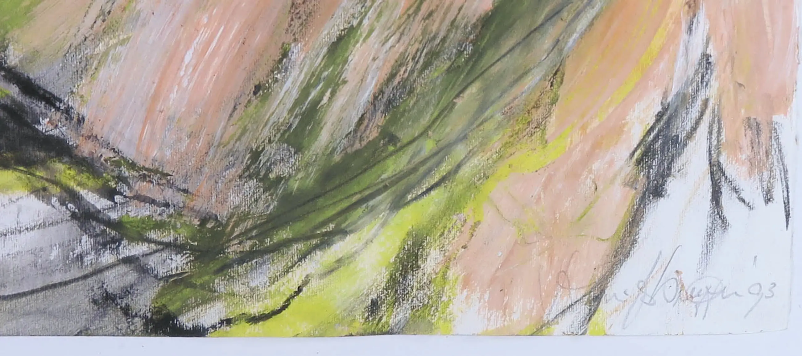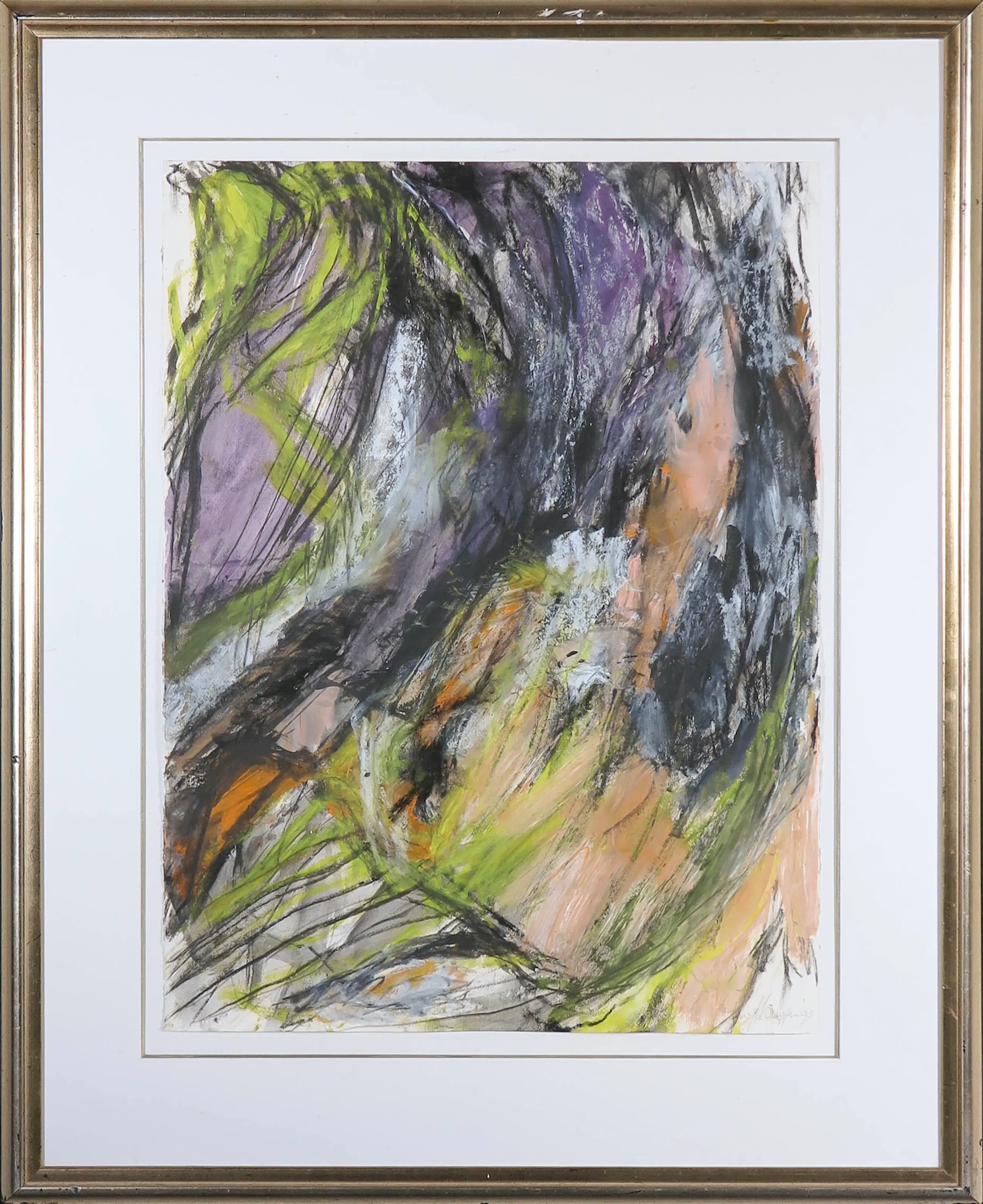 Groot ingelijst werk in gemengde techniek (krijt, verf) door Ineke van Koningsbruggen.