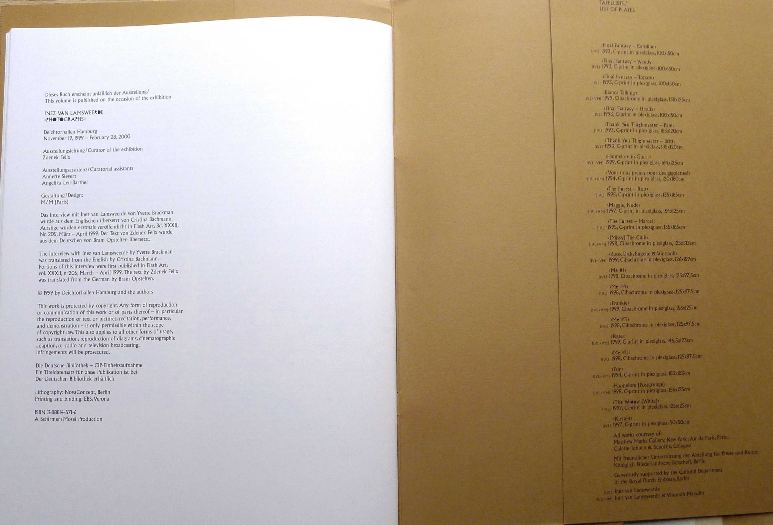 Interview door Yvette Brachman in de Duitse taal, met Engelse vertaling Uitgave ter gelegenheid van Tentoonstelling: Inez van Lamsweerde 'Photographs' d.d. november 1999- februari 2000 in de Deichtorhallen Hamburg Uitgave: ism. Schirmer/Mosel Verlag Gmbh