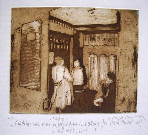 Bistro, Radierung, Blattgröße 37 x 26,5cm, Plattengröße 14 x 17,5cm, Künstlerexemplar (E.A), rechts unten handsigniert, darunter eine Widmung aus dem Jahr 1985, guter Zustand, Versandkosten innerhalb von Deutschland als versichertes Postpaket 7,- Euro.