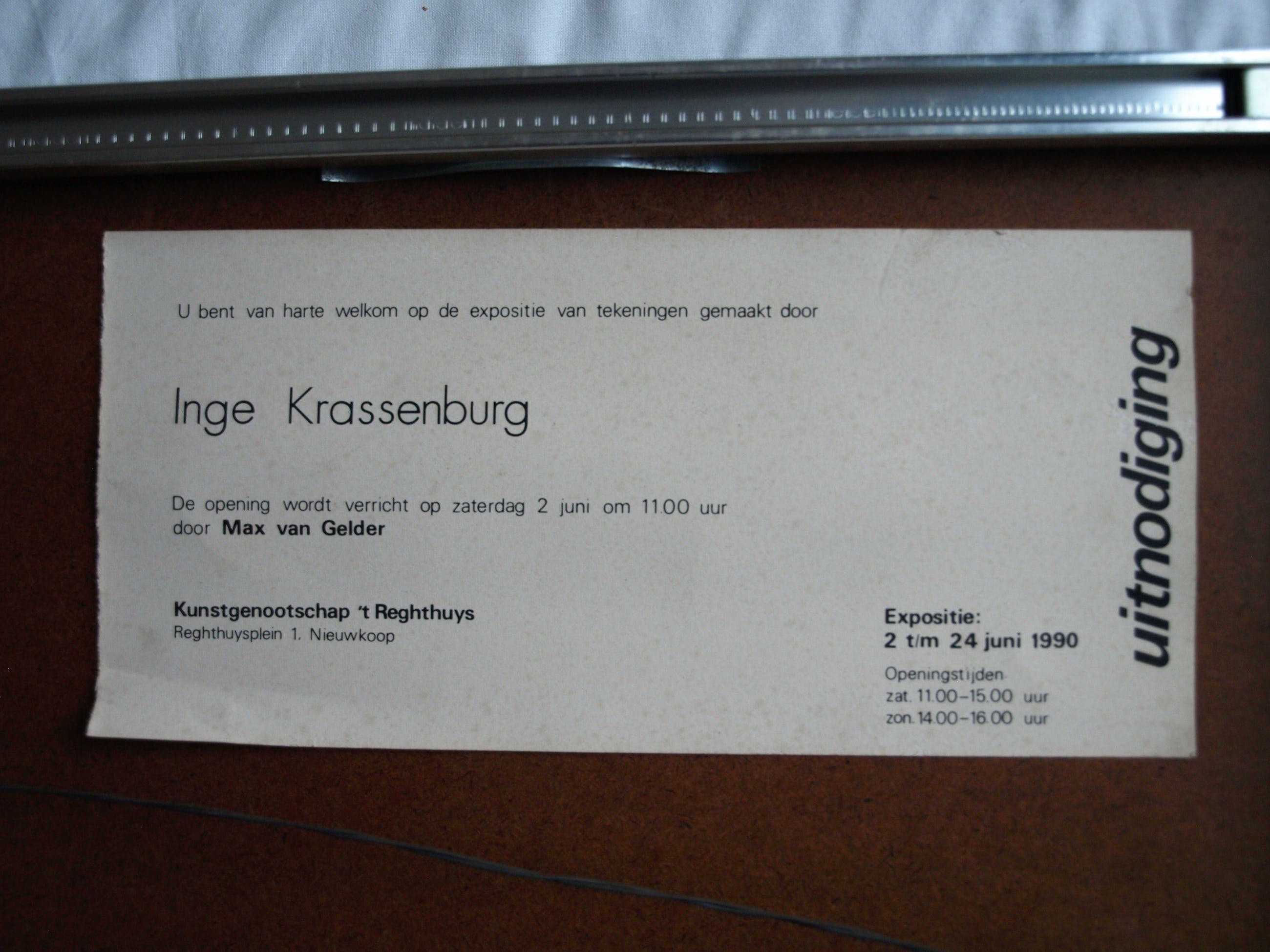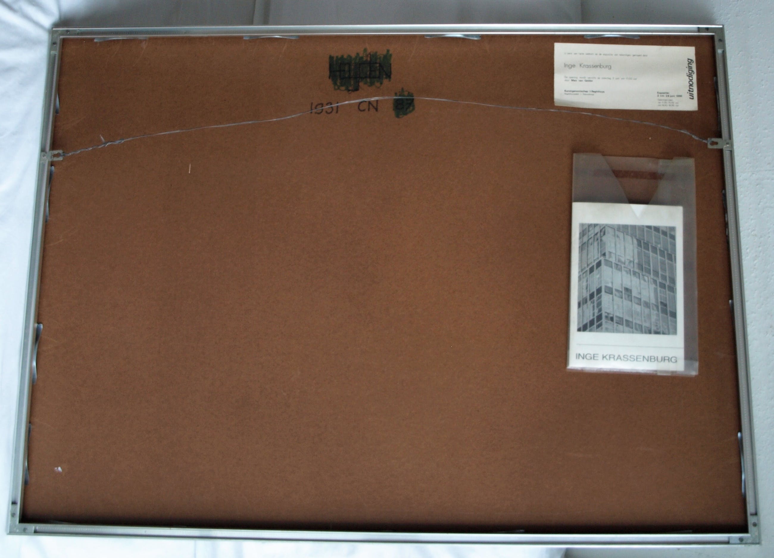 -Waarschijnlijk uit ca. 1989. Op de achterkant van de lijst is een uitnodiging voor een expositie in 1990 en een catalogus (12 pag.) met korte info en voorbeelden van het werk van de kunstenares bevestigd.