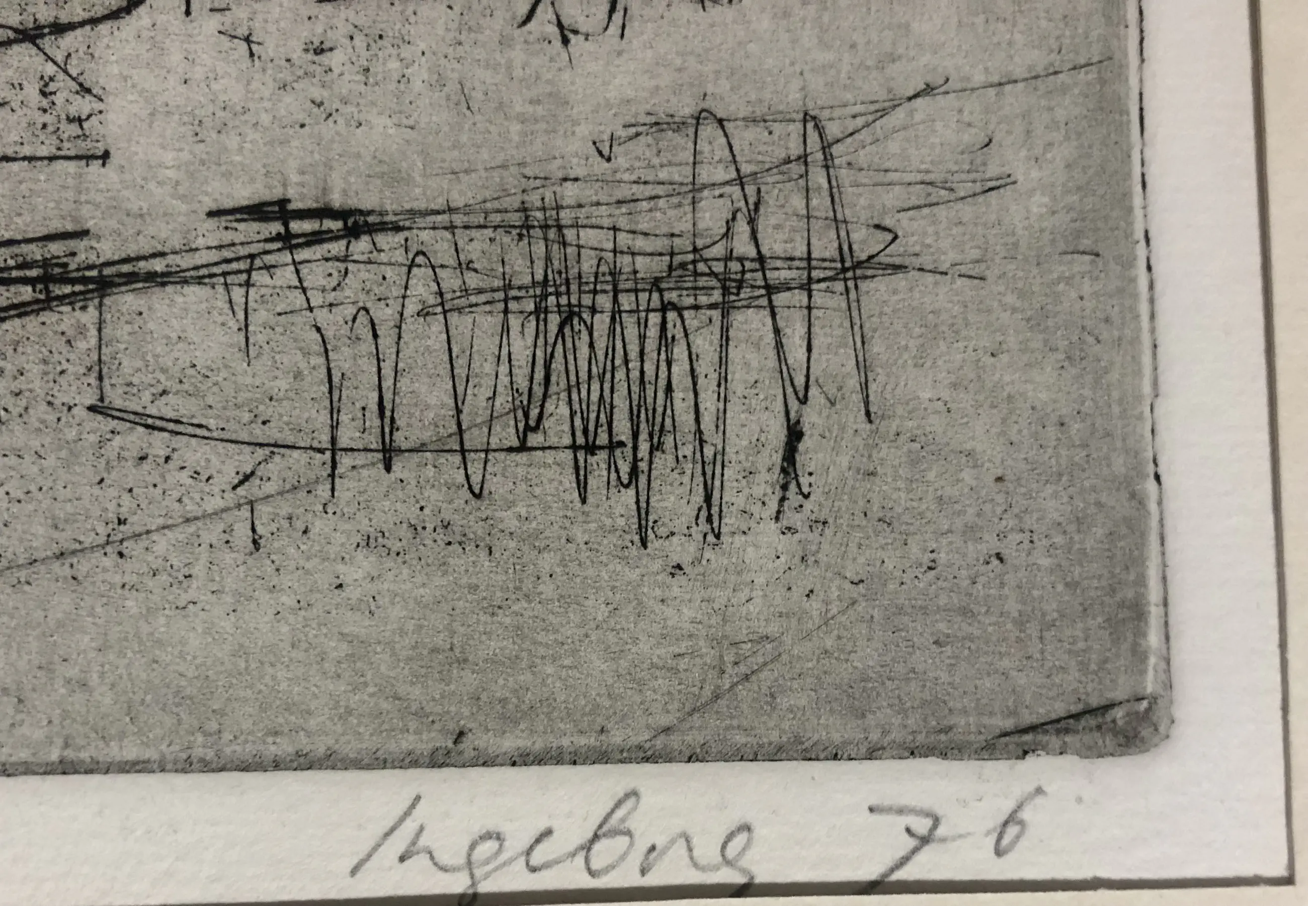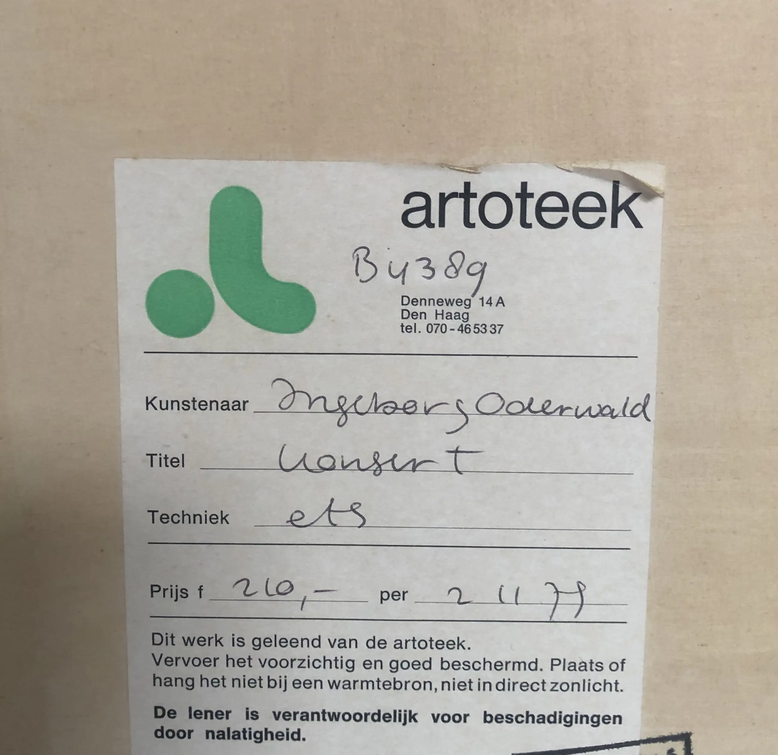 Prachtige ets voorstellende een orkest gevat in nette lijst en passe-partout. Ingeborg Hulda Oderwald (Ulrum, 19 juni 1932) is een Nederlands etser, tekenaar en kunstschilder. In 1977 won ze met haar roman Nellie de eerste prijs voor Literatuur bij een jubileumprijsvraag van de Vereniging van Vrouwen met een Academische Opleiding.