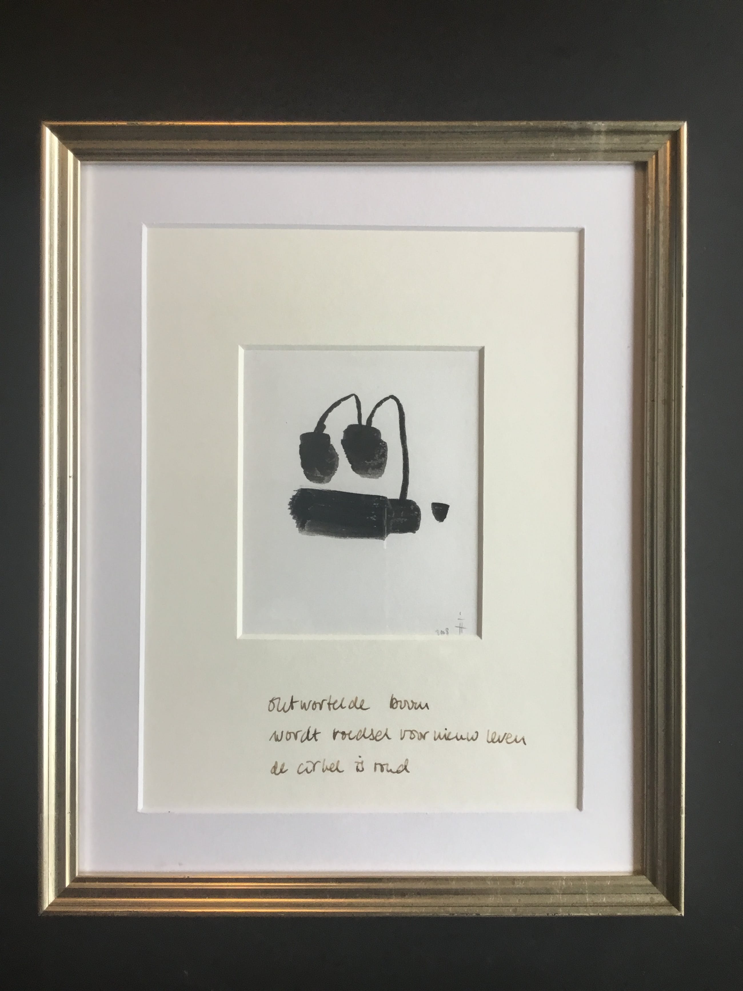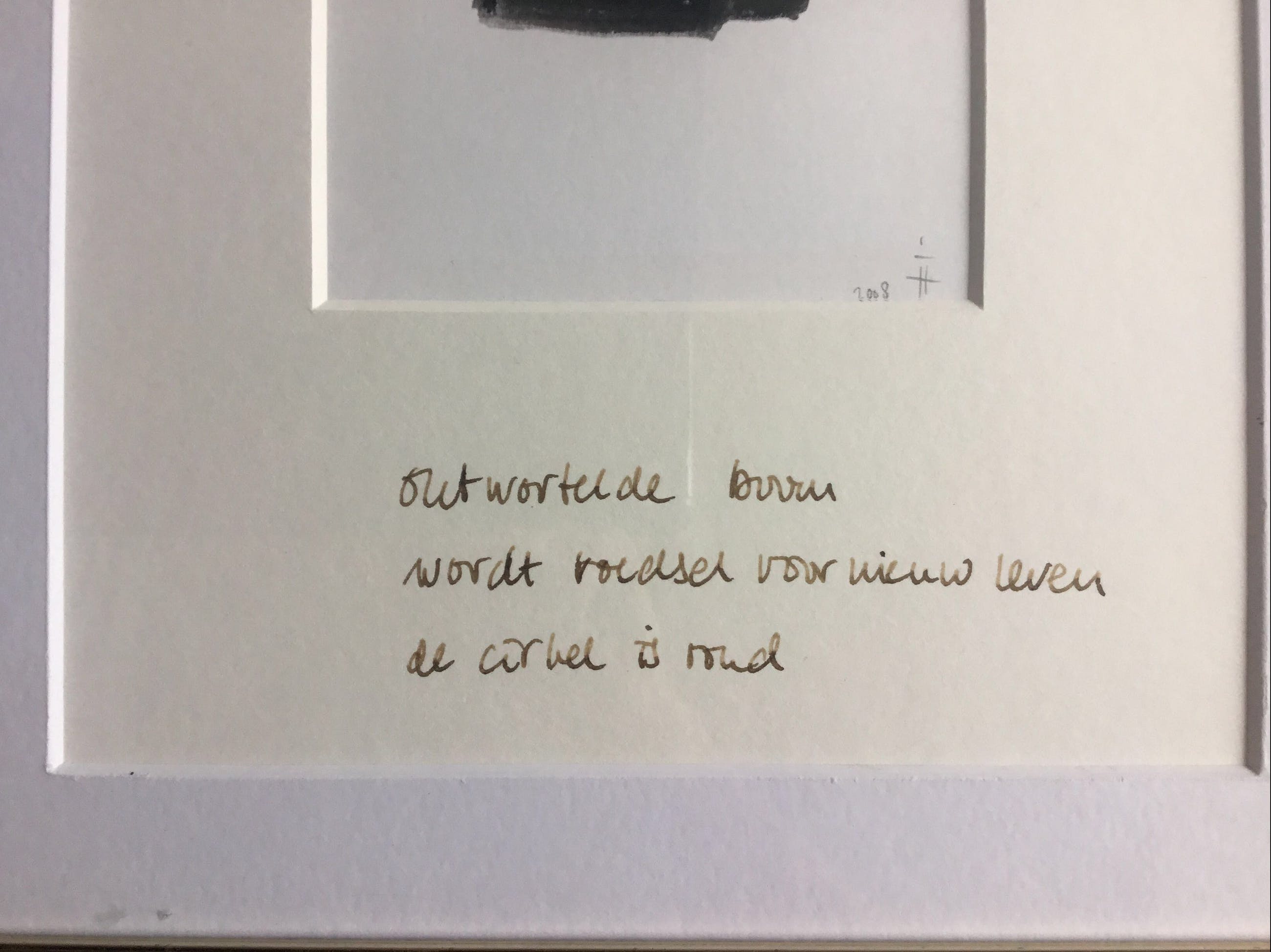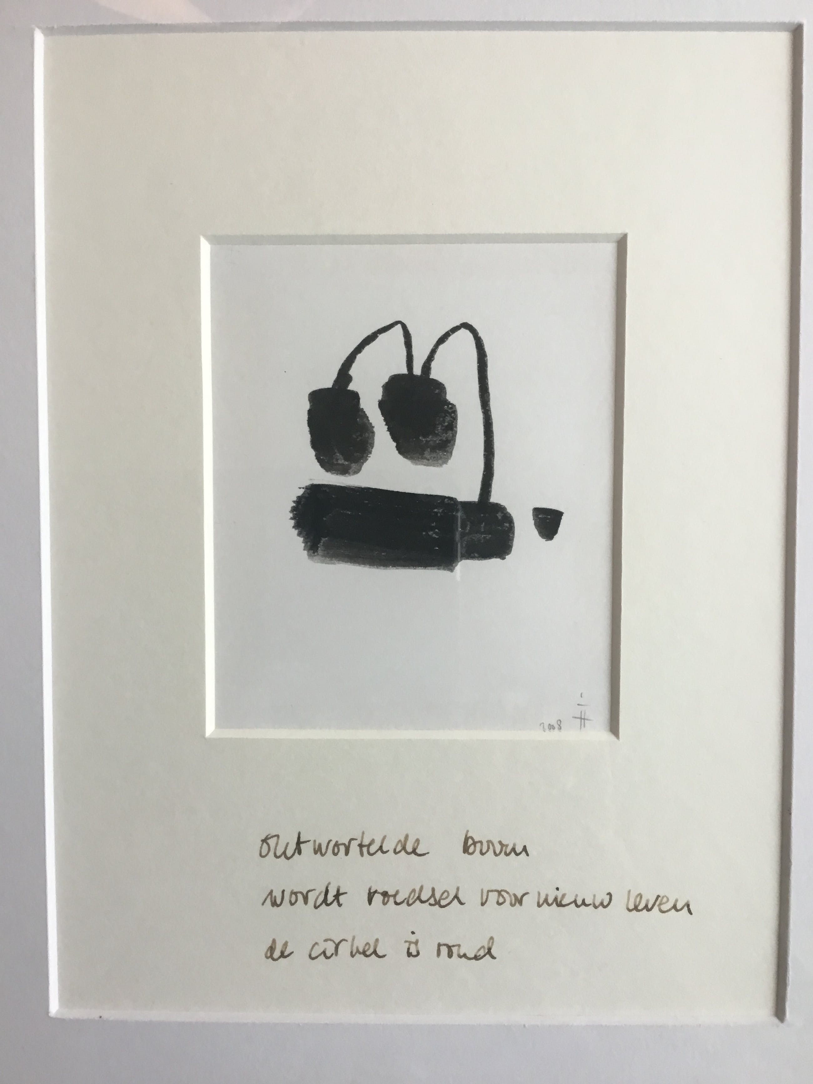 Minimalistische penseel tekening met Haiku. Het werk van Ingeborg ten Hoopen kenmerkt zich door religieuze filosofische kijk op de wereld.