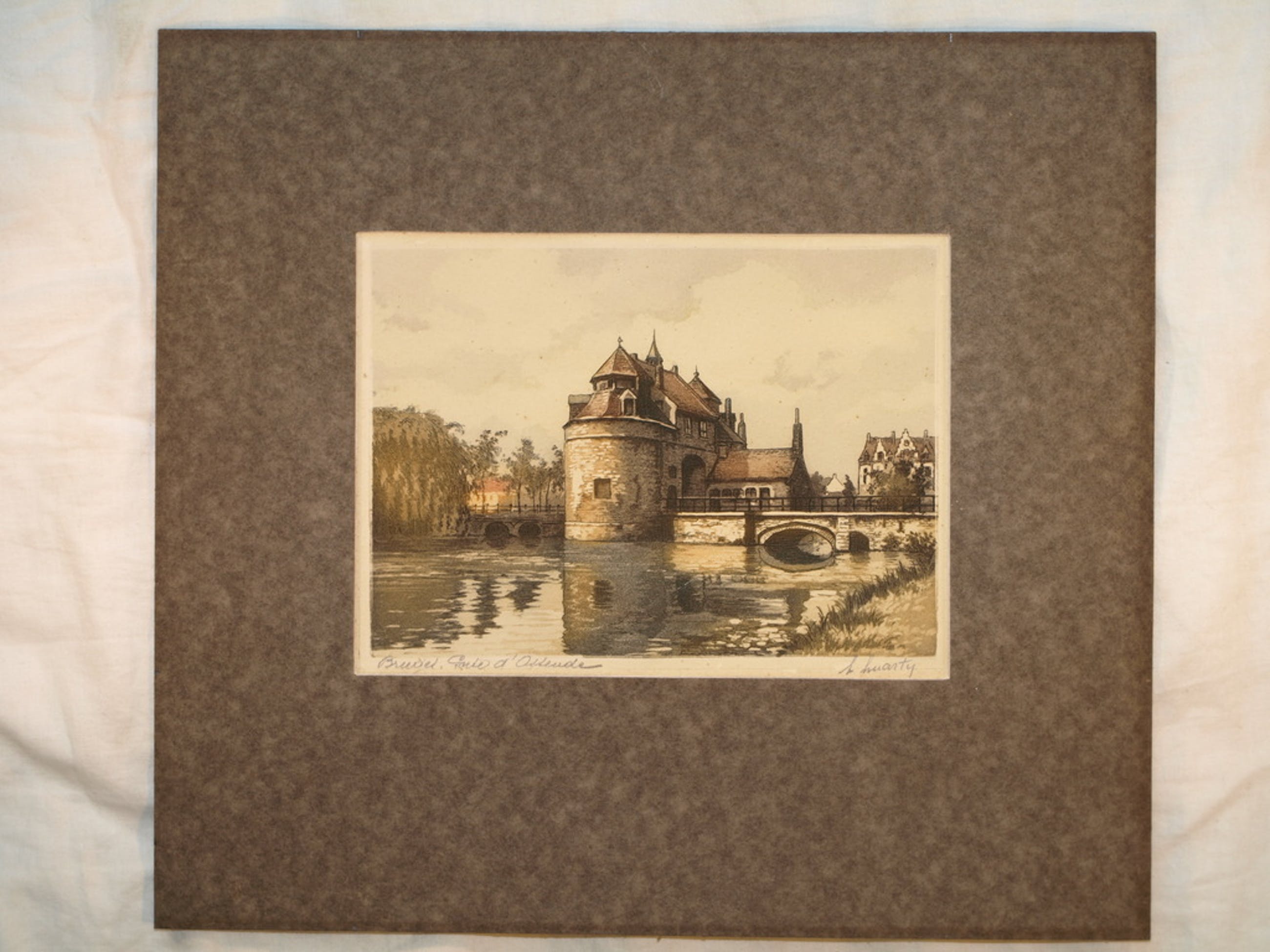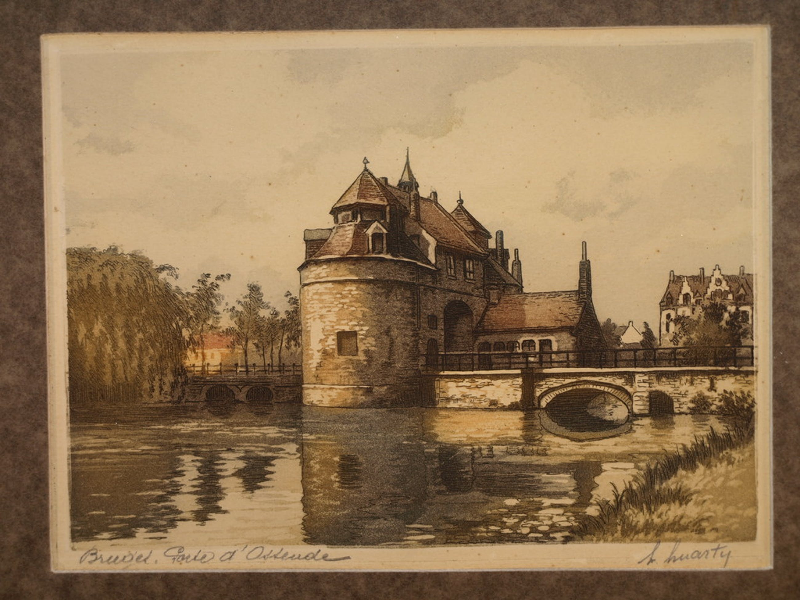 Een oude ets met een voorstelling van de ‘Ezelspoort’ of ‘Porte d’ Ostende’ , een stadspoort in het Belgische Brugge. De ets is met de hand ingekleurd en ook handgesigneerd met potlood. Helaas hebben wij de naam van de kunstenaar niet kunnen achterhalen.