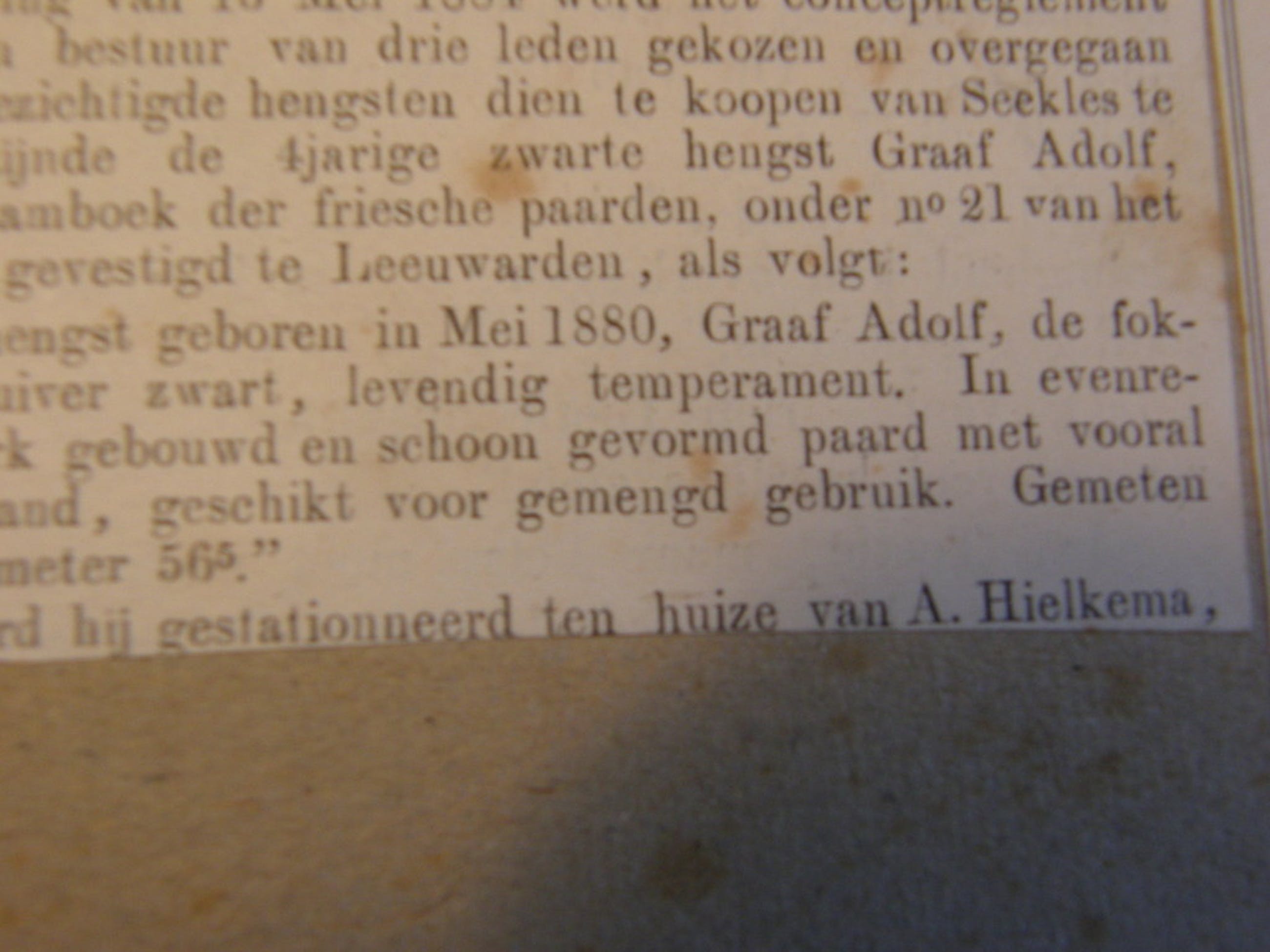 Aangeboden een ingekleurde houtgravure van de eerste goedgekeurde Friese hengst van het nu geheten Koninklijk Fries Paarden Stamboek 1884. De naam van de hengst was Graaf Adolf. Deze gravure is voorzien van een certificaat. Uniek exemplaar.