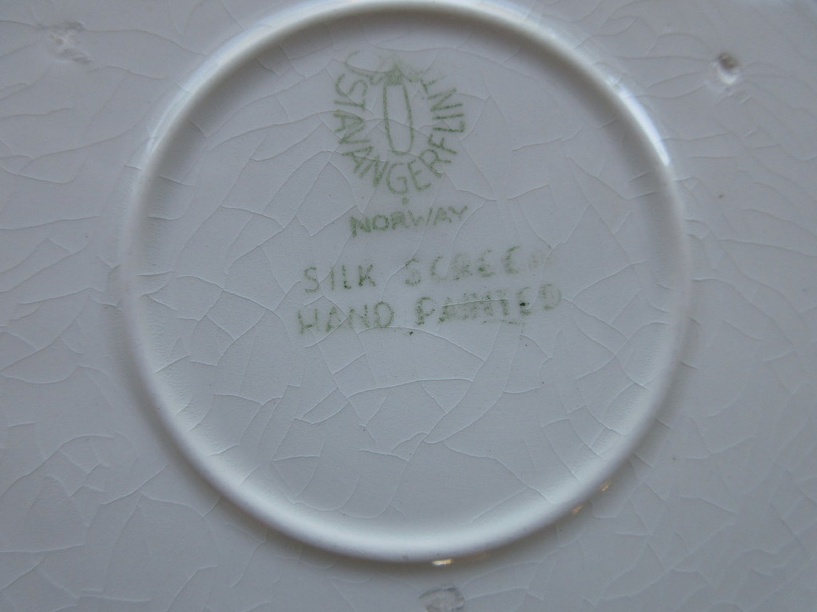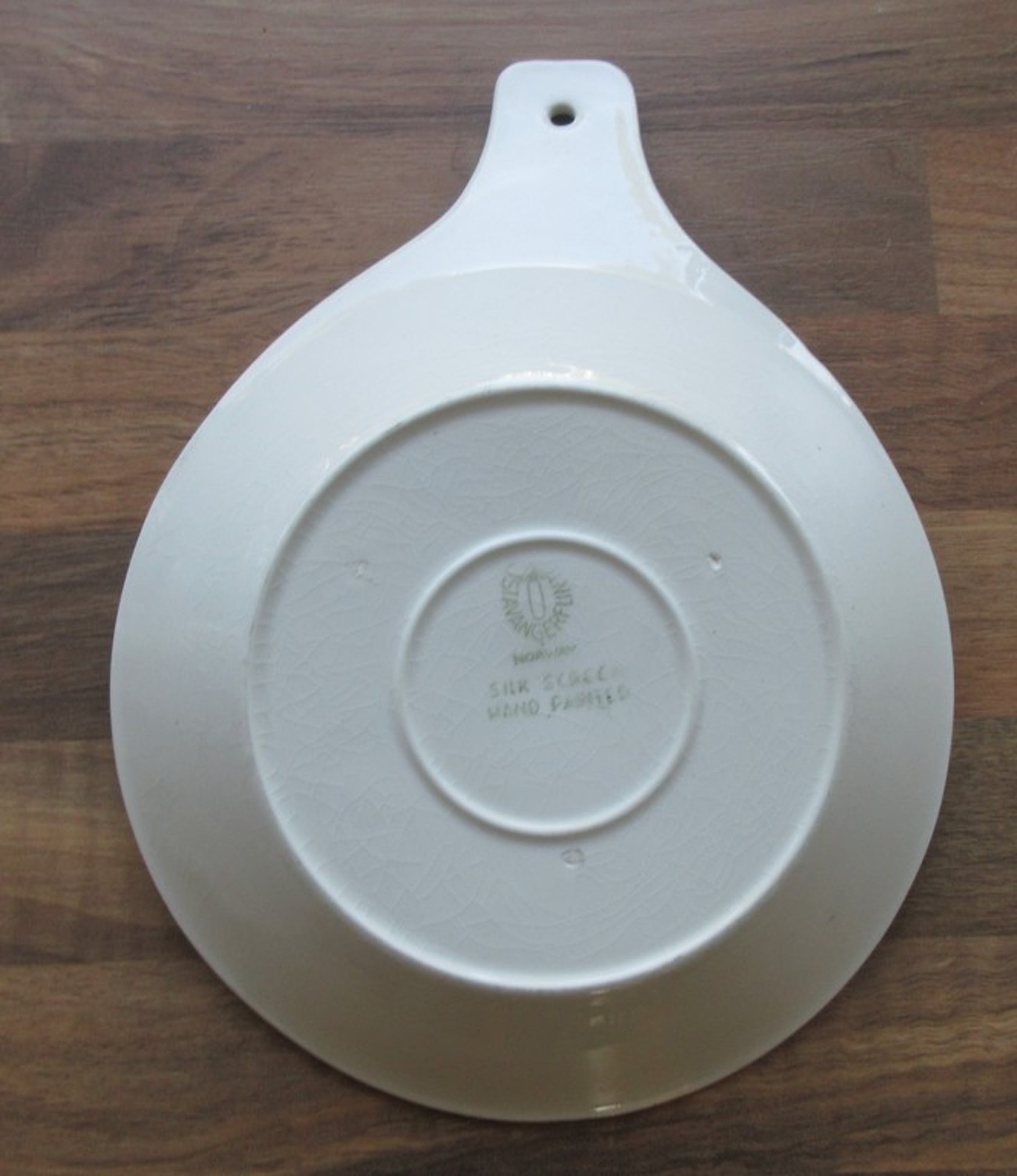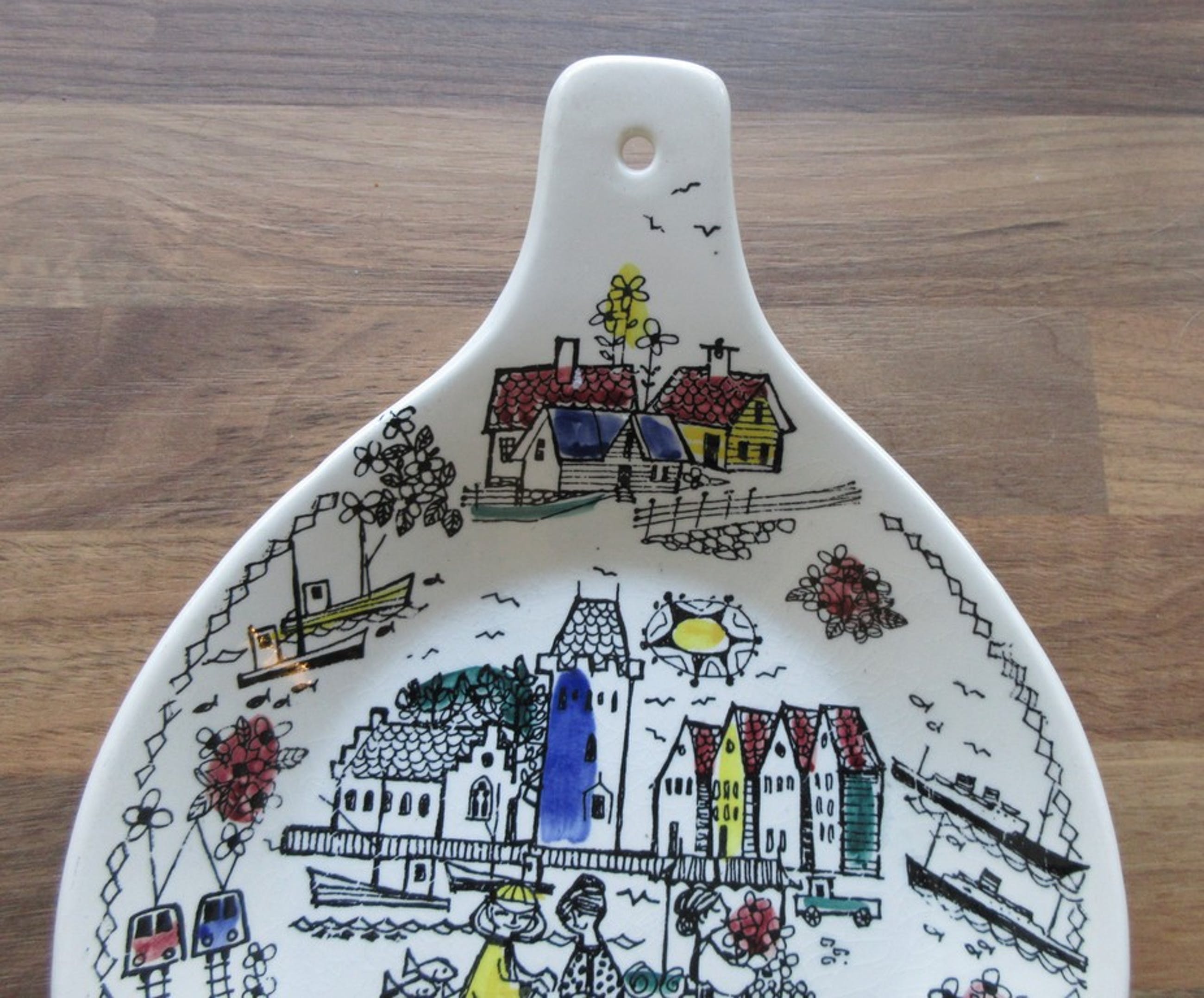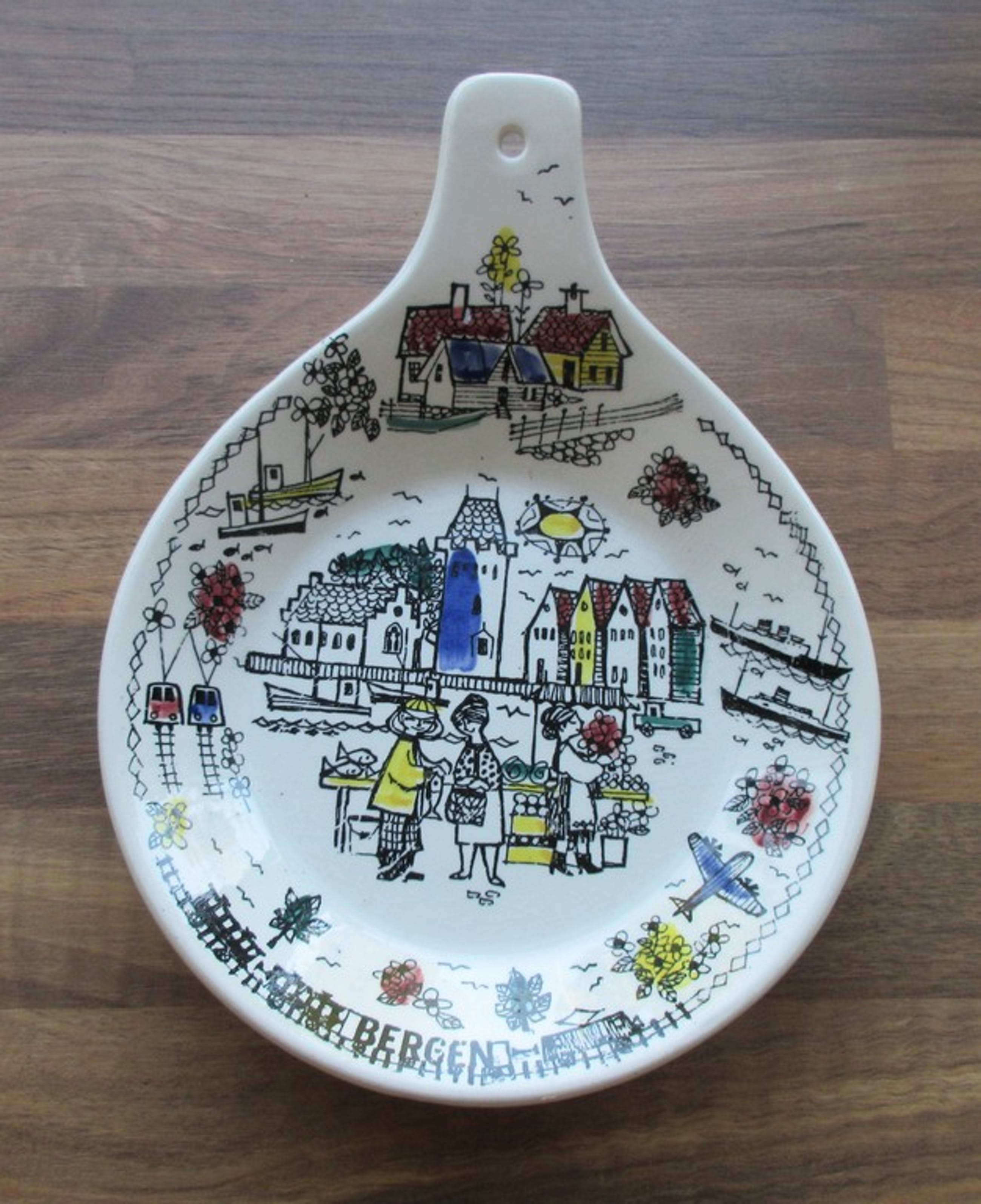 Mooi sixties hand beschilderd wandbord ontworpen door Inger Waage voor Stavanger Flint uit Noorwegen met afbeeldingen van de stad Bergen. In prima onbeschadigde conditie.