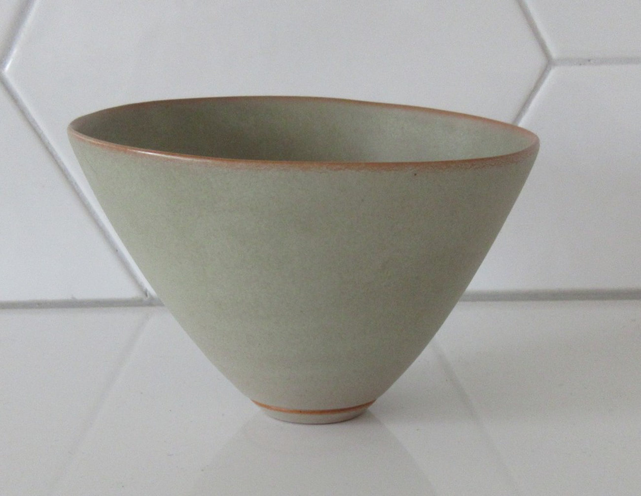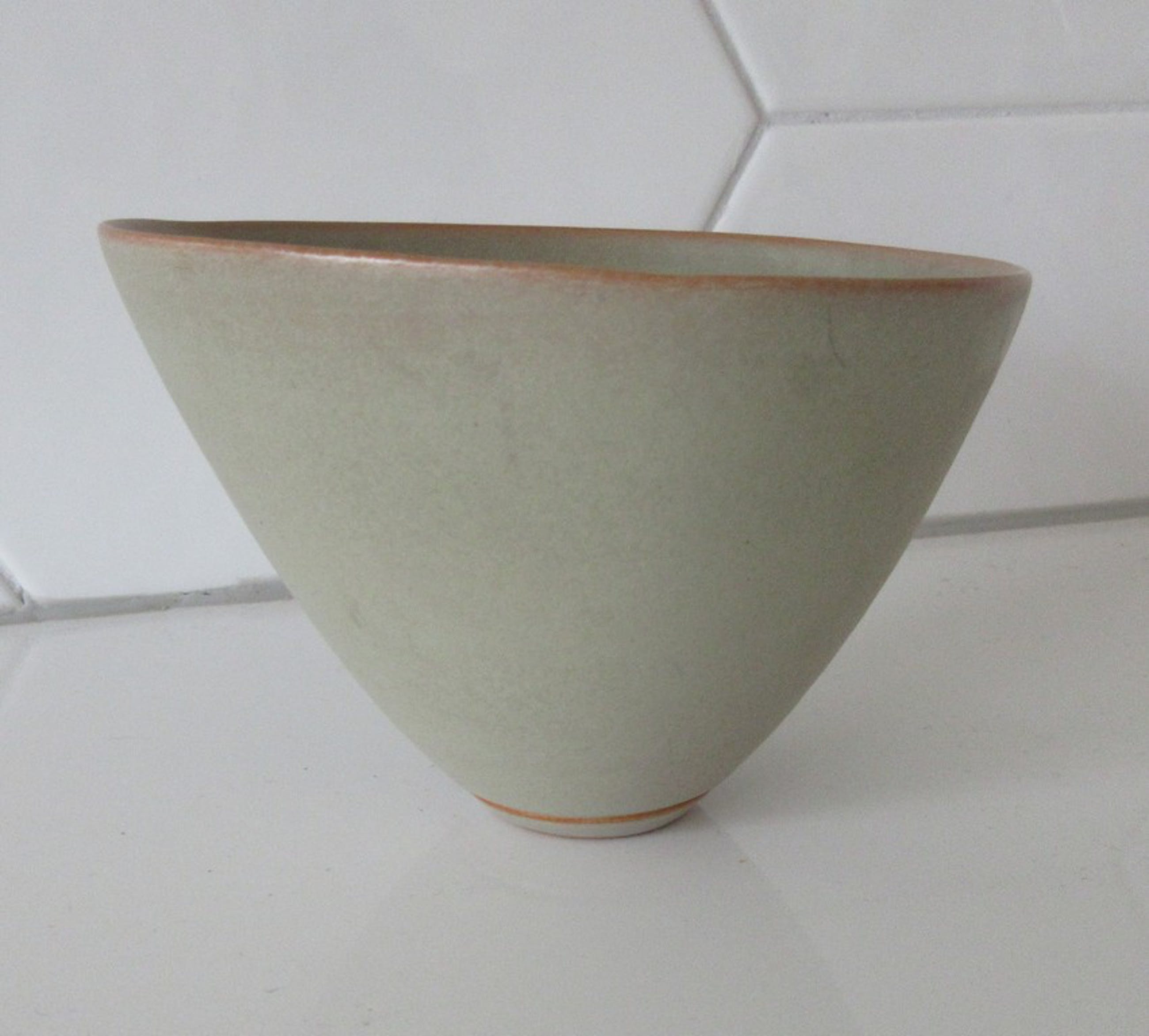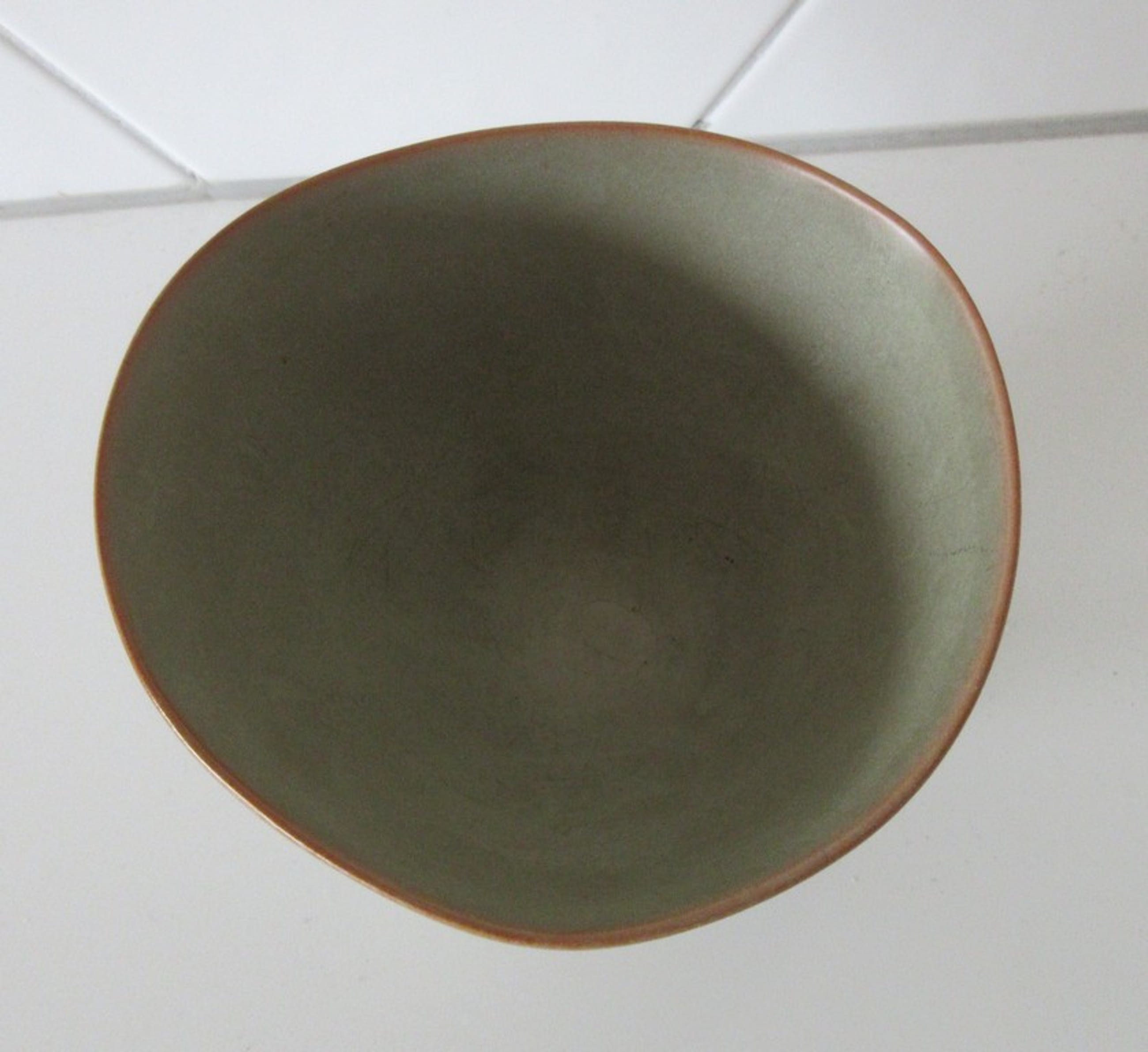 Mooi stukje vintage kunstkeramiek en scandinavisch design. De kom is vrijgevormd en heeft een mooie zachte matgroen glazuur op rood steengoed. In prima onbeschadigde conditie. Aan de onderzijde gemerkt en voorzien van signatuur.