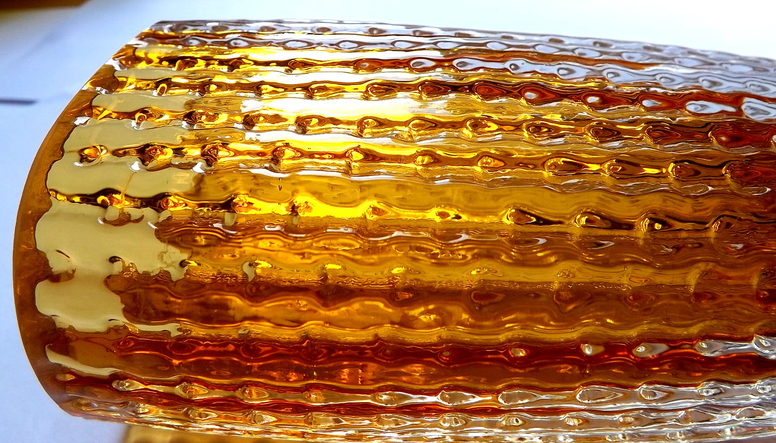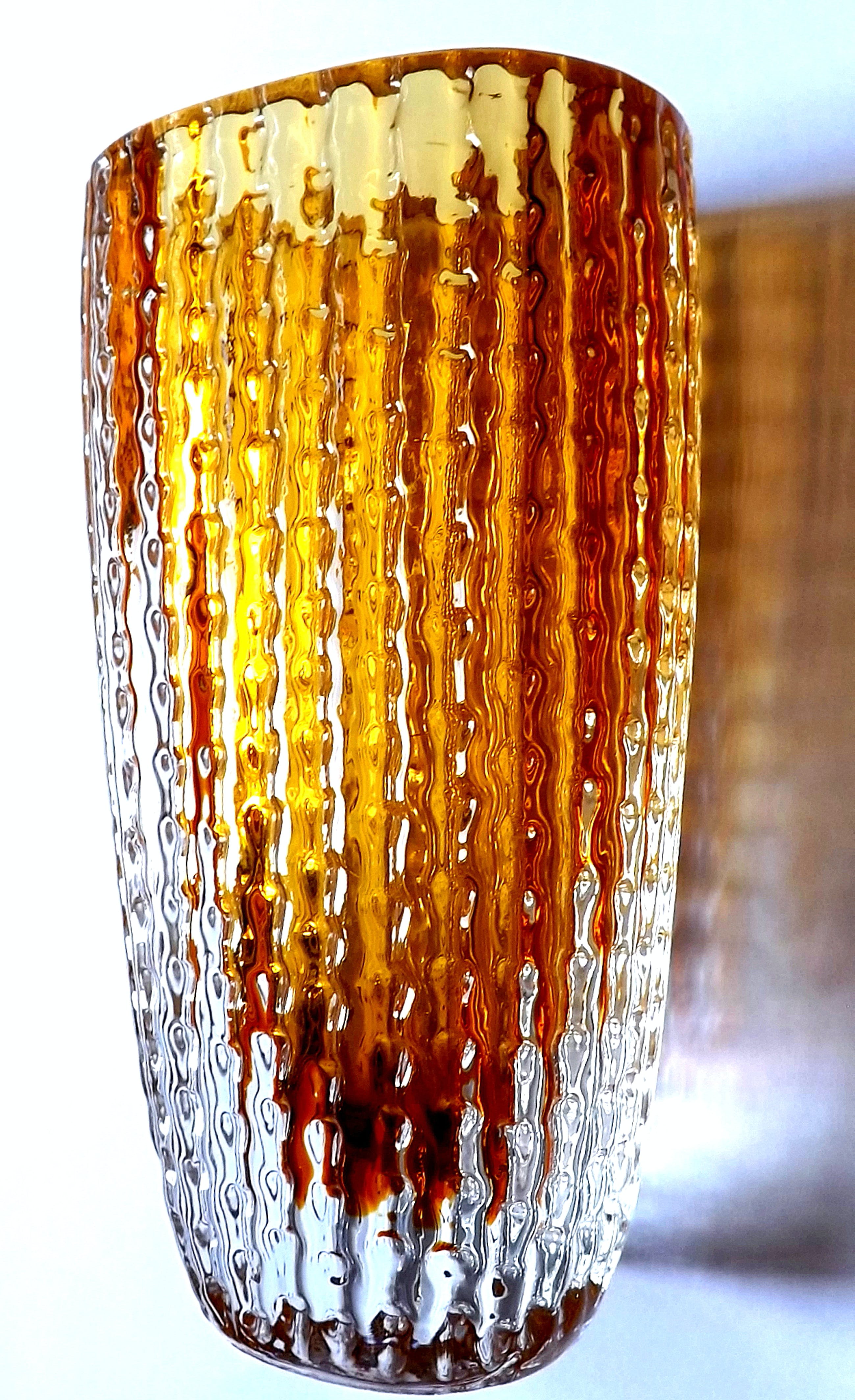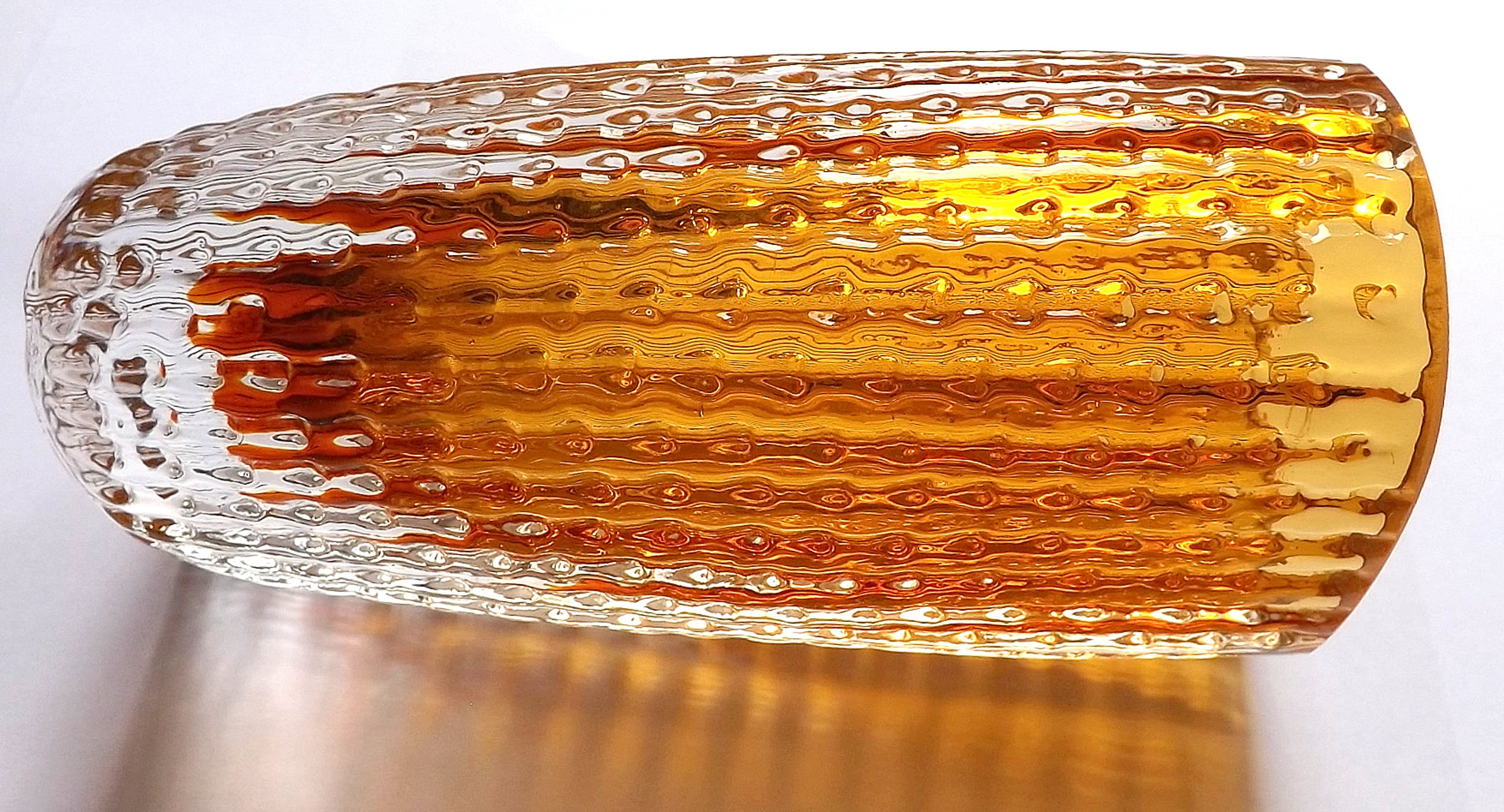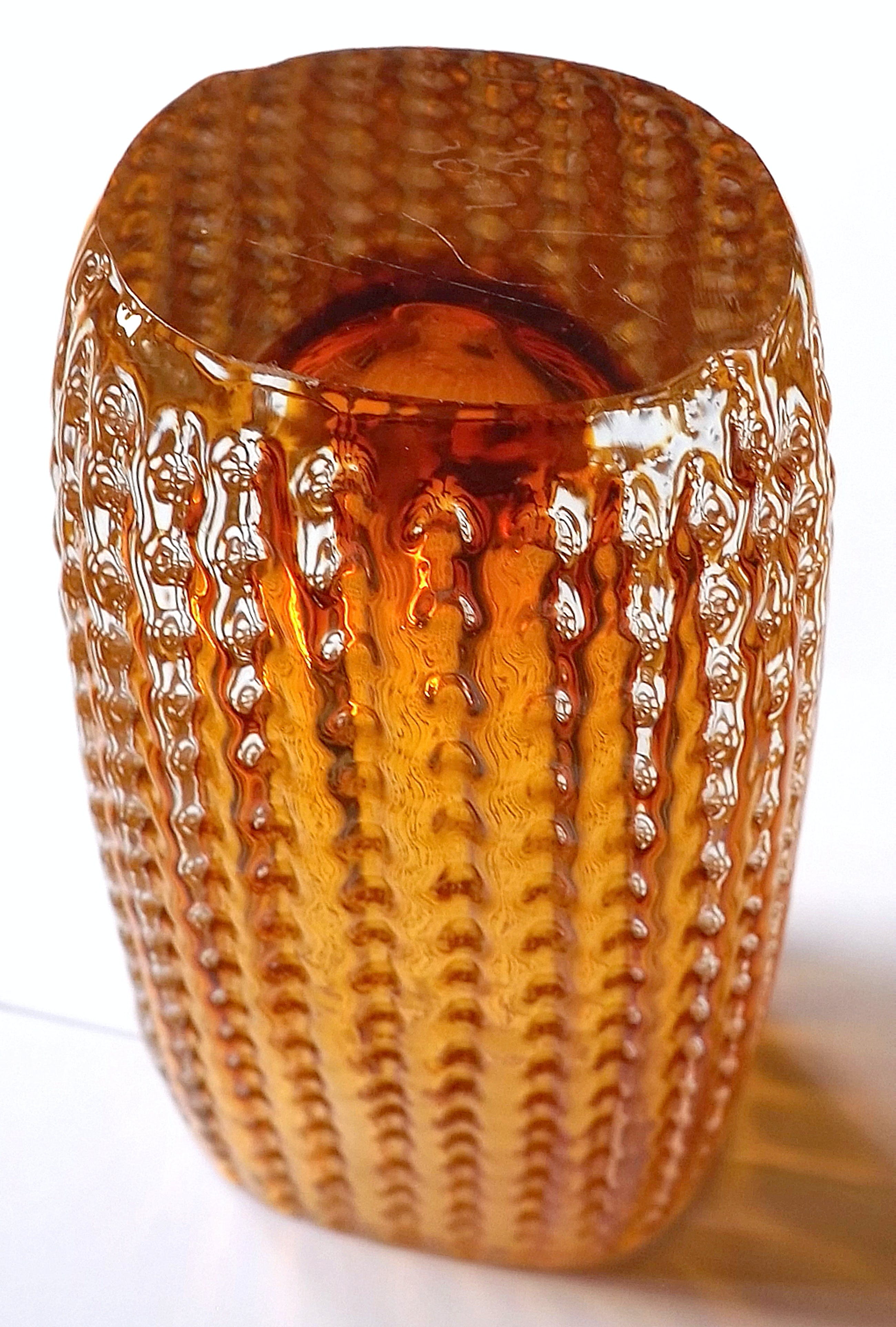 Dikwandige ovaal-vormige glazen vaas met lengte ribbels. Kleur: amber - goudkleurig.Herkomst: Ingrid Glashutte Afmetingen in cm: Hoog: 16 - boven 8.5 x 6.0 / 6.5 x 6.0 - onder 5.5 x 4.5. Gesigneerd op de bodem: IG Goede conditie. Foto's zijn een onderdeel van de beschrijving. Aangetekende verzending via POSTNL