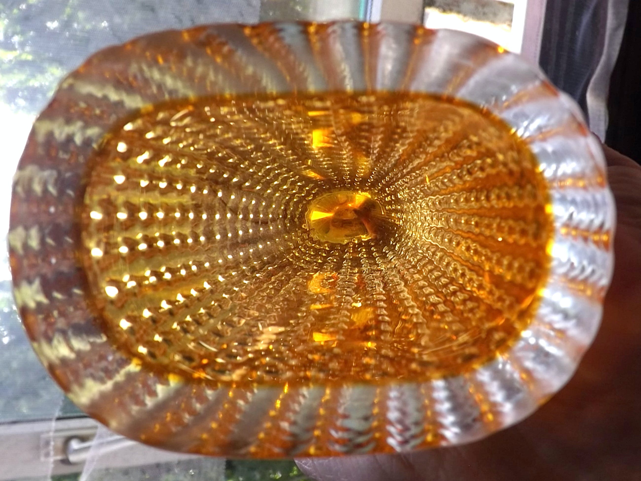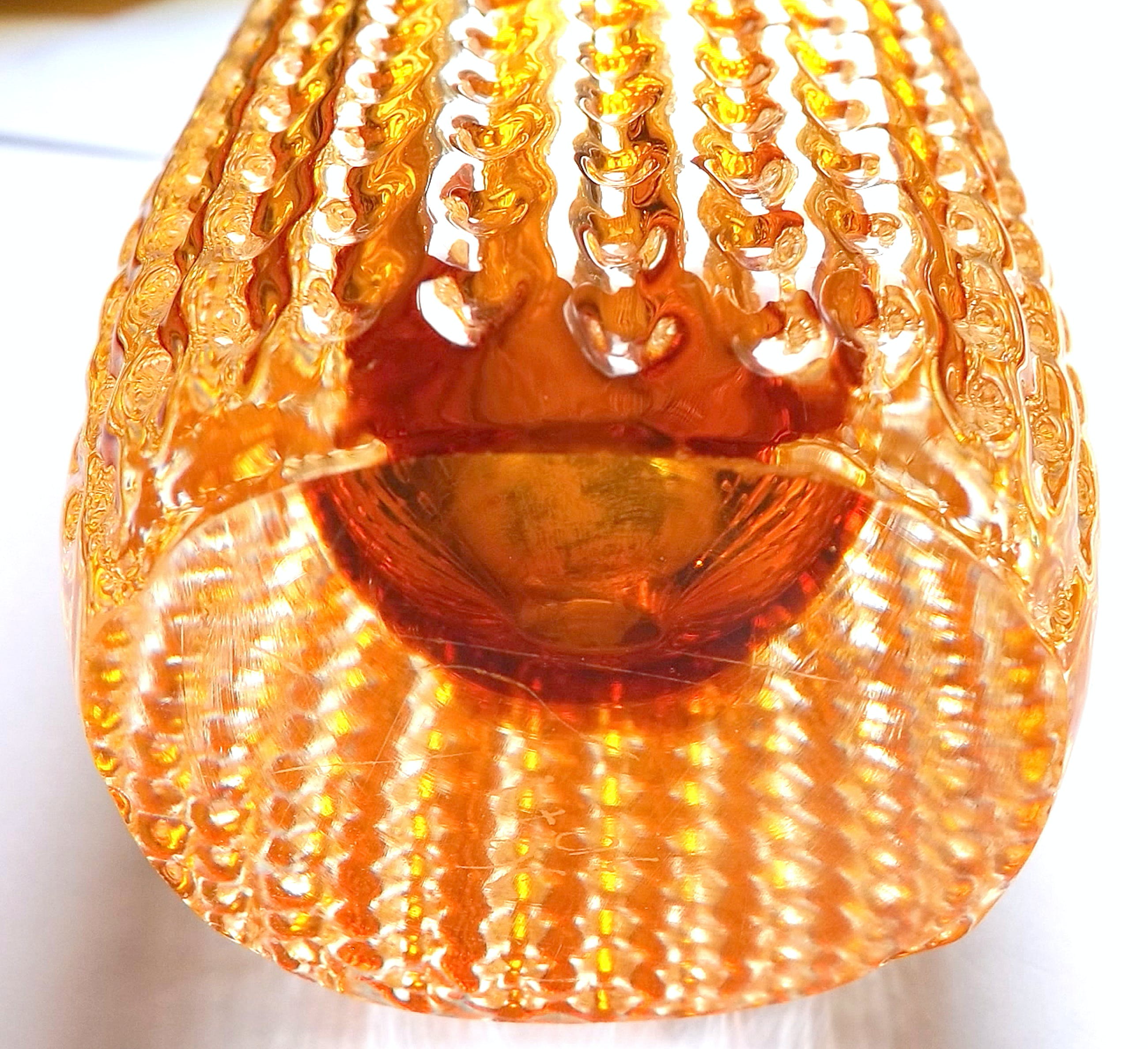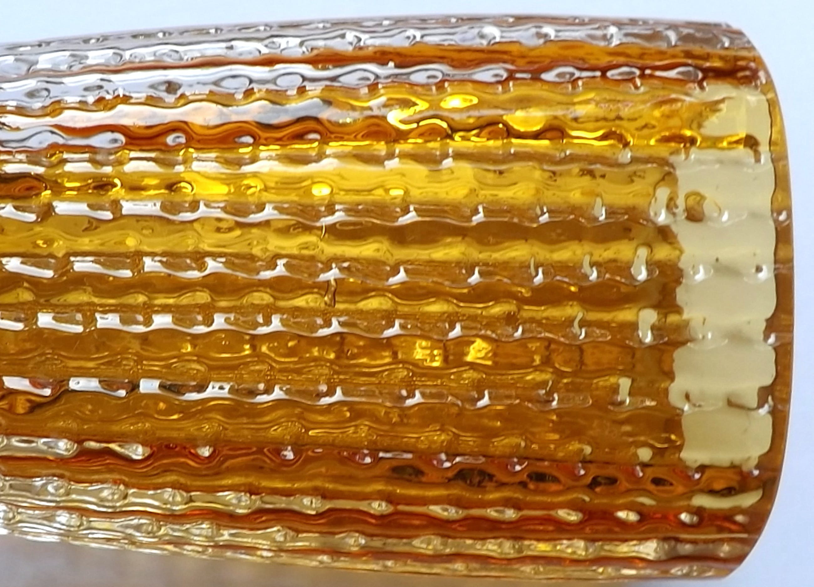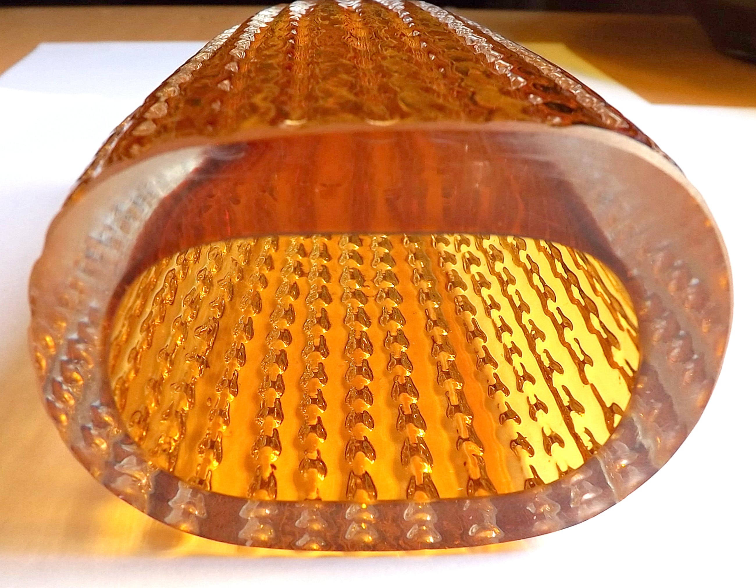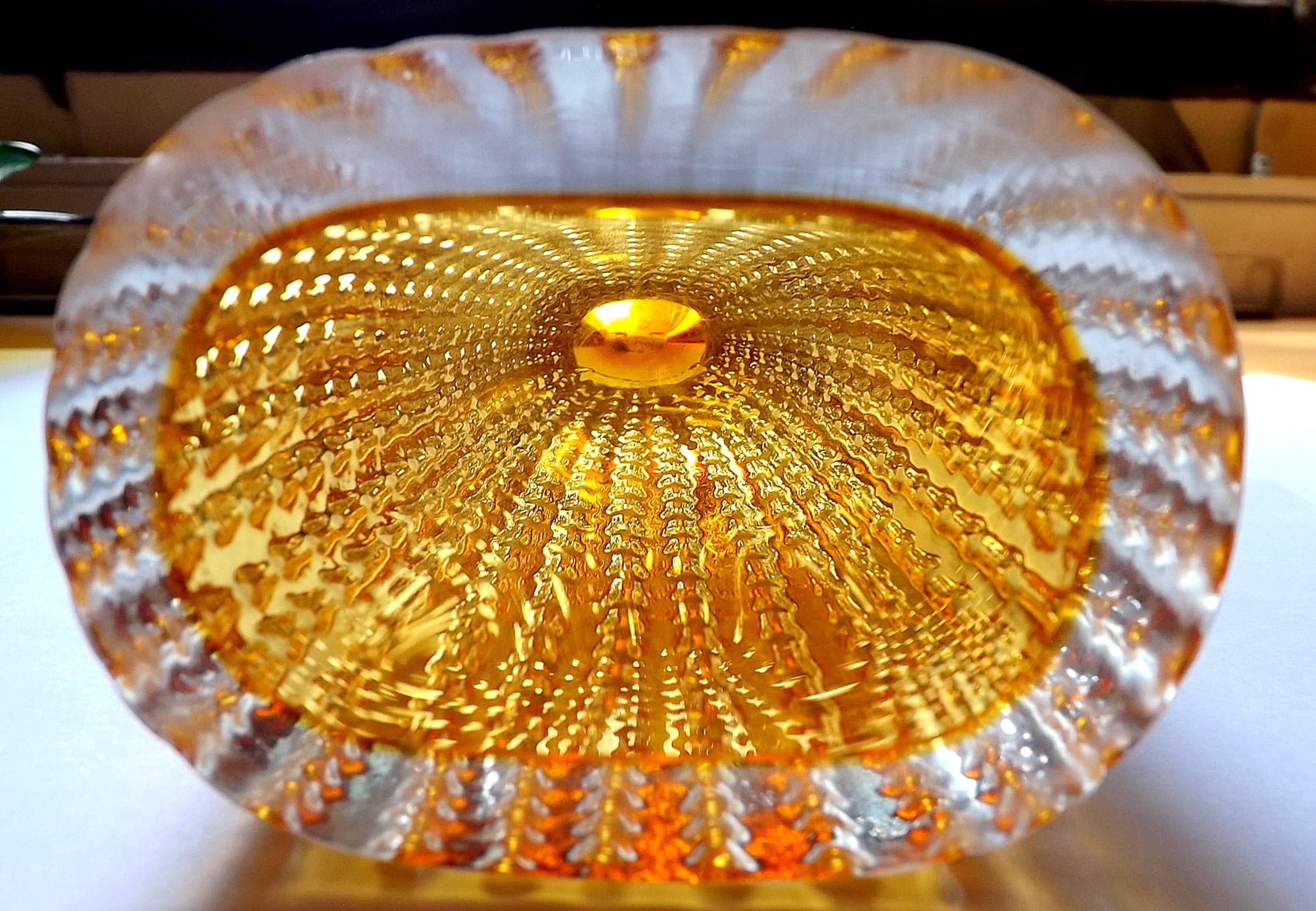 Dikwandige ovaal-vormige glazen vaas met lengte ribbels. Kleur: amber - goudkleurig.Herkomst: Ingrid Glashutte Afmetingen in cm: Hoog: 16 - boven 8.5 x 6.0 / 6.5 x 6.0 - onder 5.5 x 4.5. Gesigneerd op de bodem: IG Goede conditie. Foto's zijn een onderdeel van de beschrijving. Aangetekende verzending via POSTNL