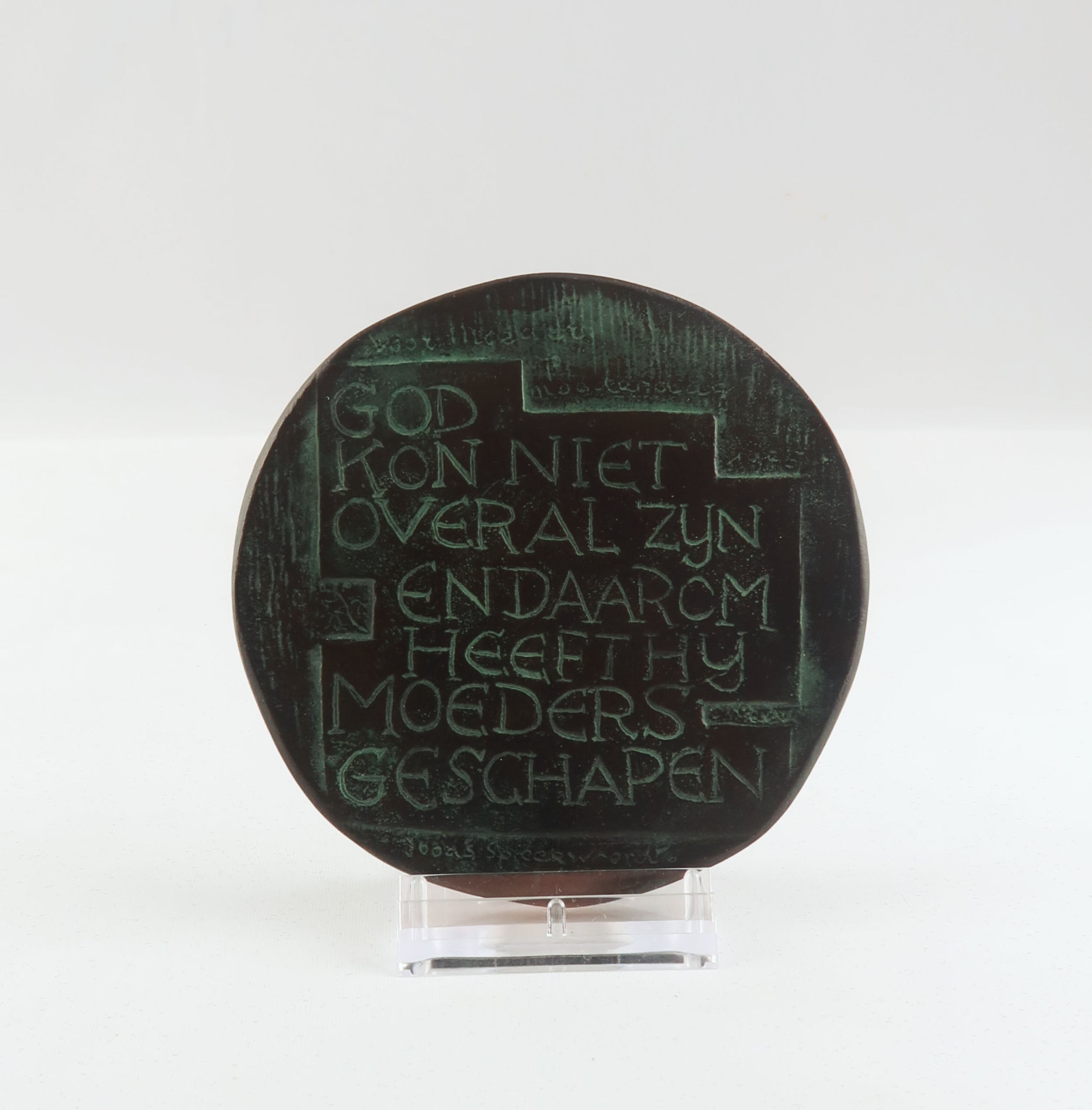 Moederdagpenning met de spreuk: God niet overal zijn en daarom heeft hij moeders geschapen.