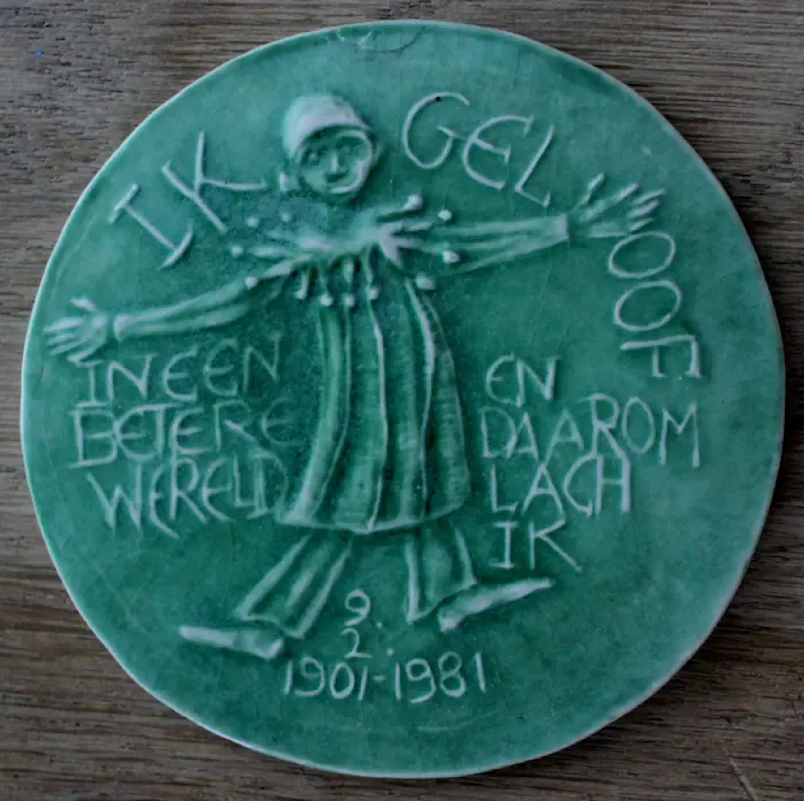 Inka Klinckhard - Keramische penning: Ik geloof in een betere wereld en daarom lach ik