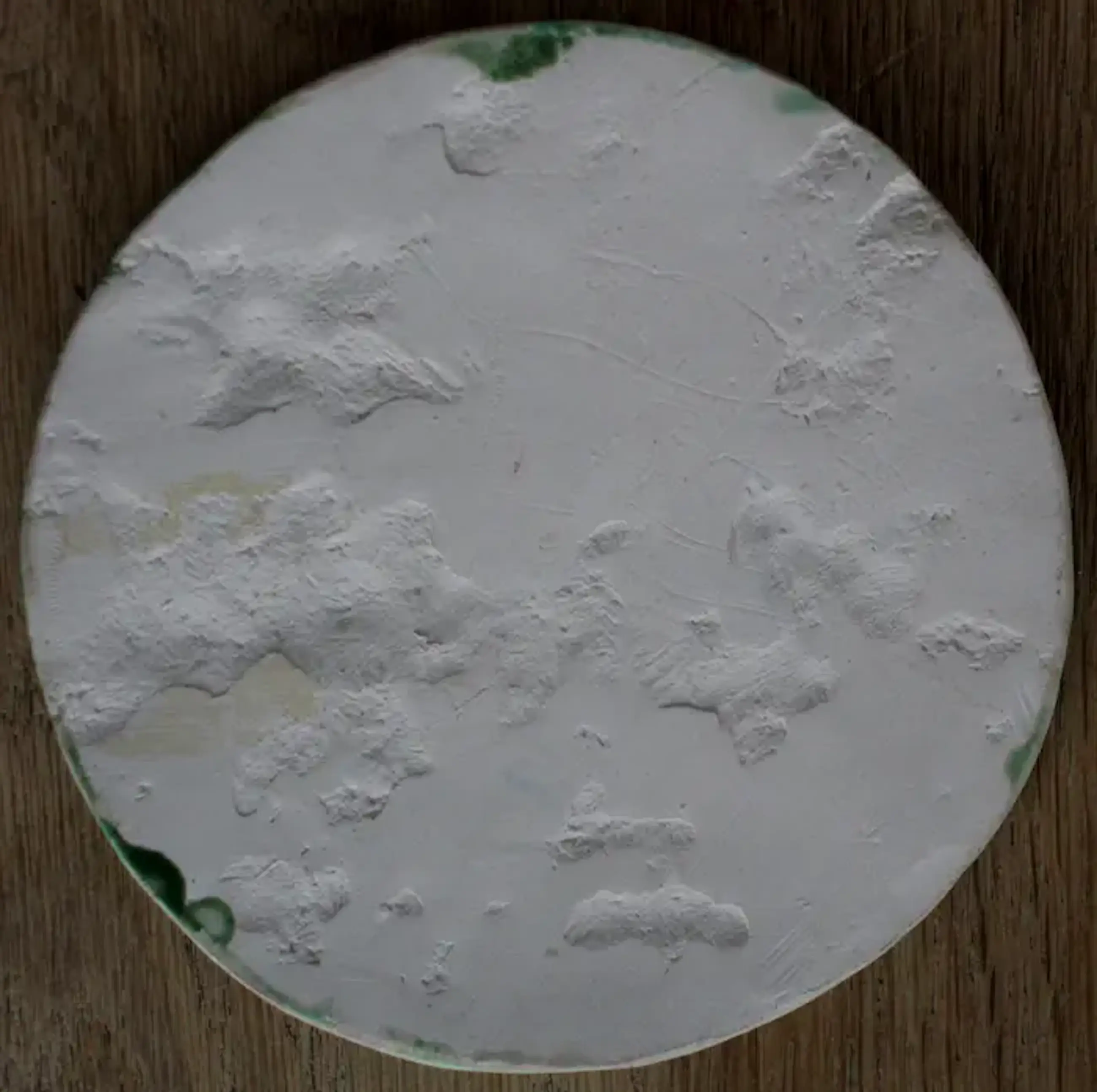 Keramische penning van Inka Klinckhard. Titel: Ik geloof in een betere wereld en daarom lach ik. Afmetingen: H10 x b10cm, hoogte is ca 0.2 cm. Het werk is niet gesigneerd door de kunstenares.