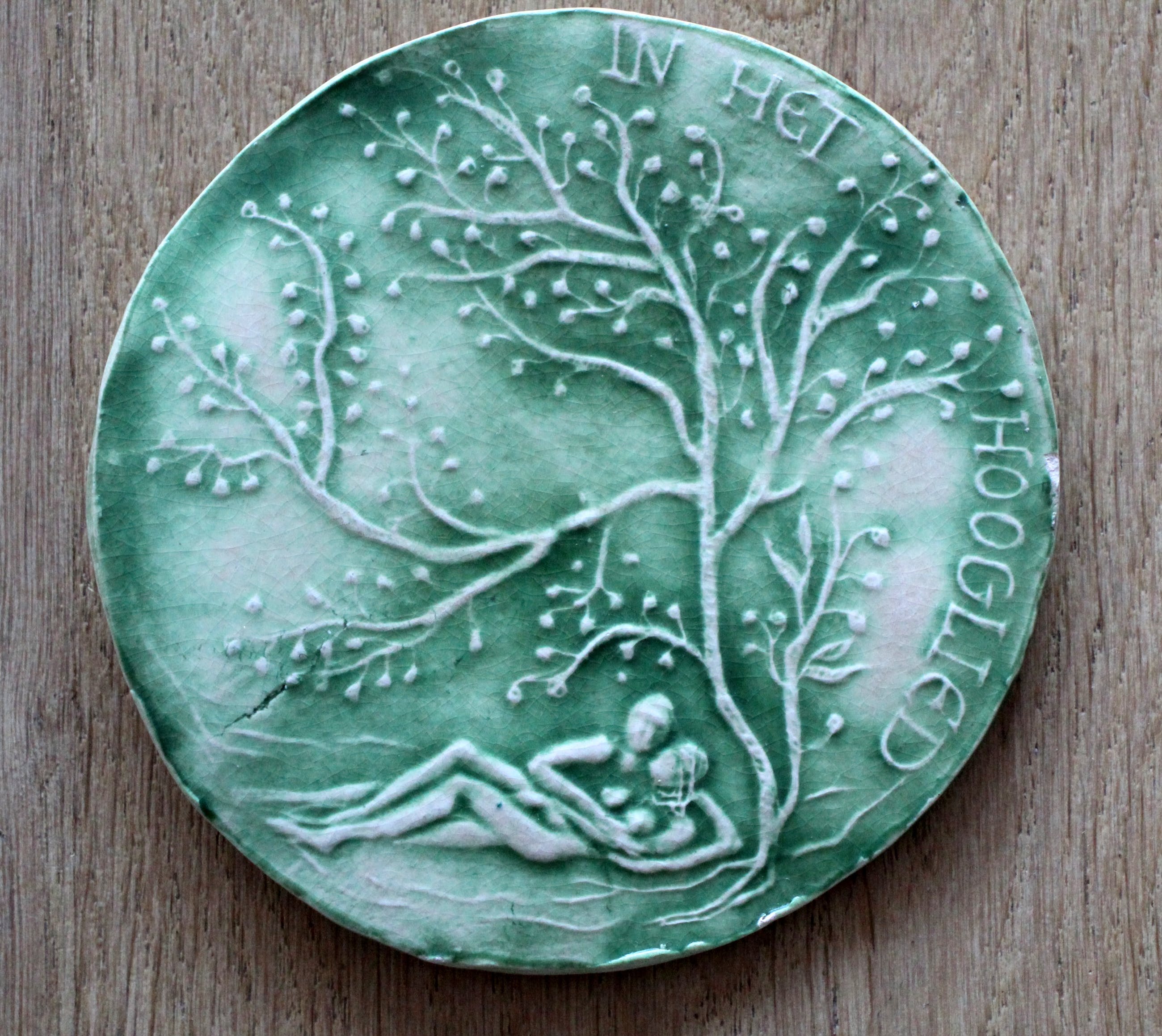 Keramische penning van Inka Klinckhard. Titel: In het Hooglied. In opdracht gemaakt. Afmetingen: H10 x b10cm, hoogte is ca 0.2 cm. Het werk is achterop gesigneerd door de kunstenares. De werkelijke kleuren zijn veel helderder en lichter groen. Dit is zeer lastig te fotograferen. De authenticiteit van het aangeboden werk wordt volledig gegarandeerd. Een certificaat van echtheid kan, op aanvraag, worden gemaild.