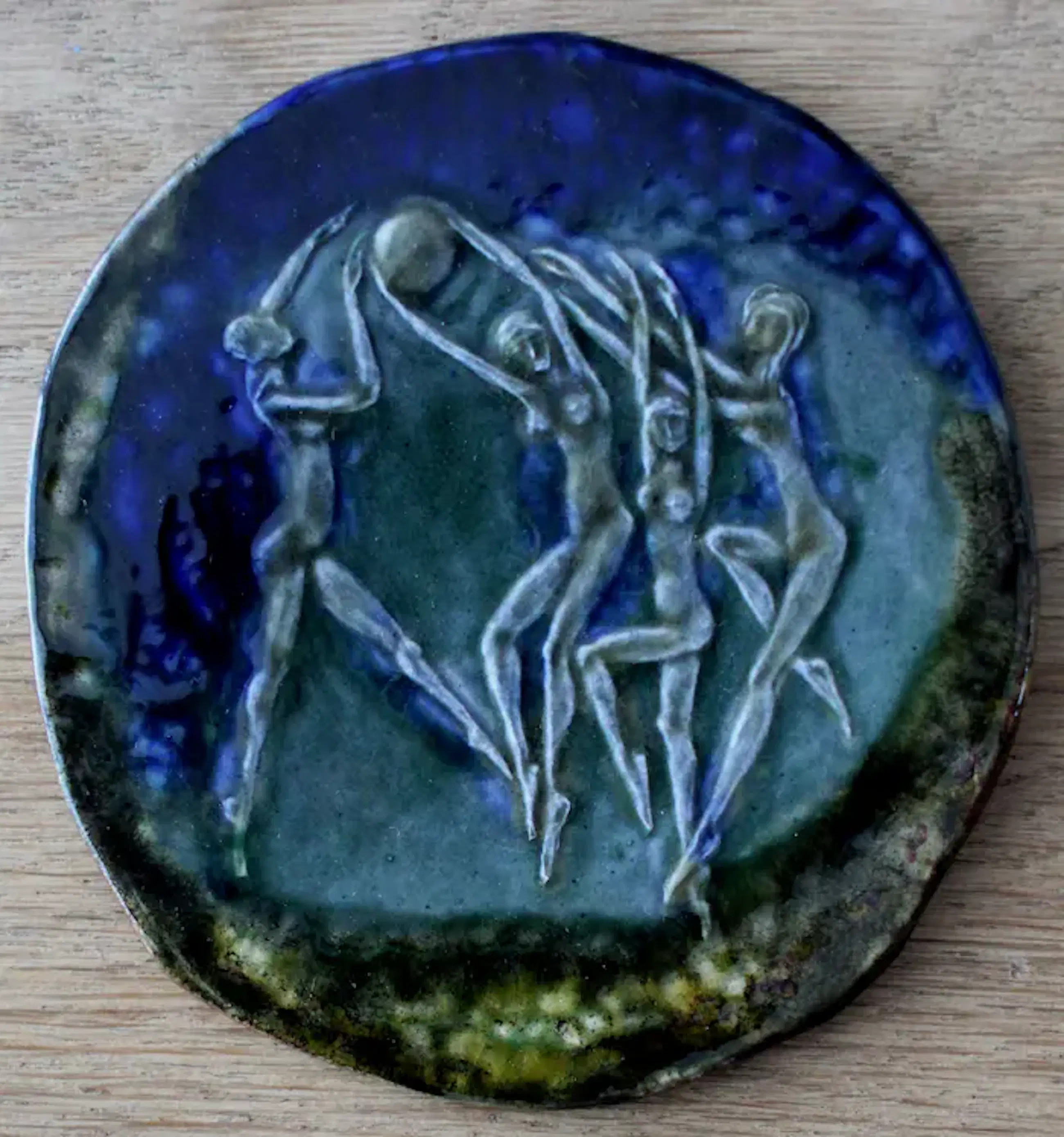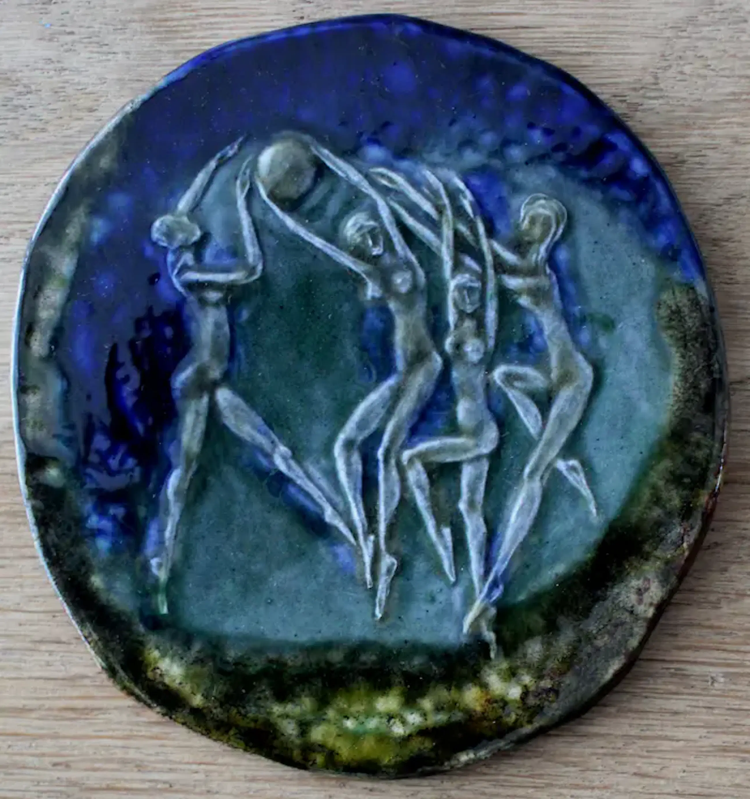 Keramische penning van Inka Klinckhard. Afmetingen: H12 x b11.5cm, hoogte is ca 0.2 cm. Het werk is niet gesigneerd door de kunstenares.