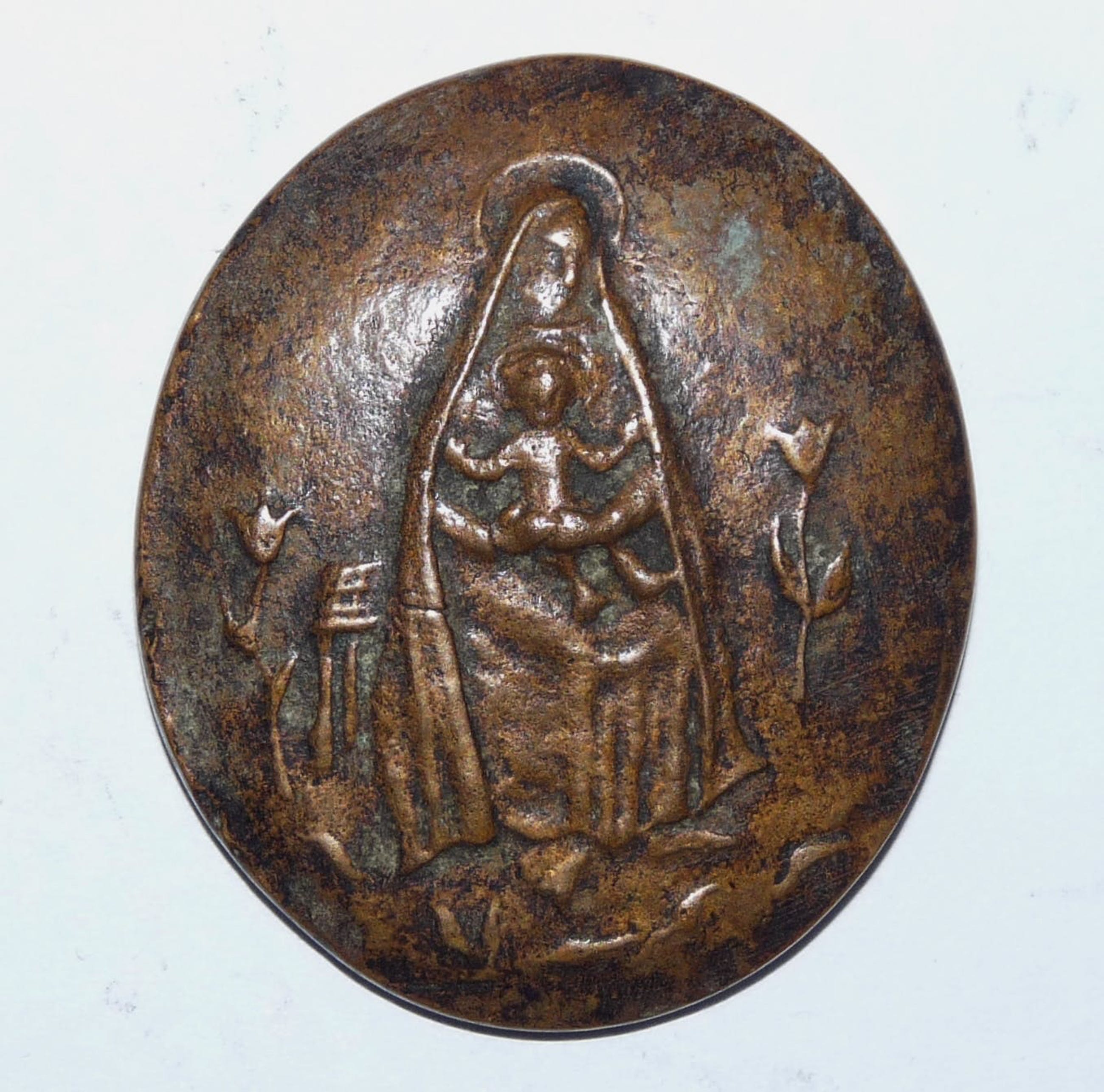 Fraaie kleine gietpenning met een religieuze voorstelling. Gemaakt door de kunstenares Inka Klinckhard. Komt uit haar nalatenschap. Achterzijde van de penning is onbewerkt, maar wel gesigneerd met haar initialen I.K.