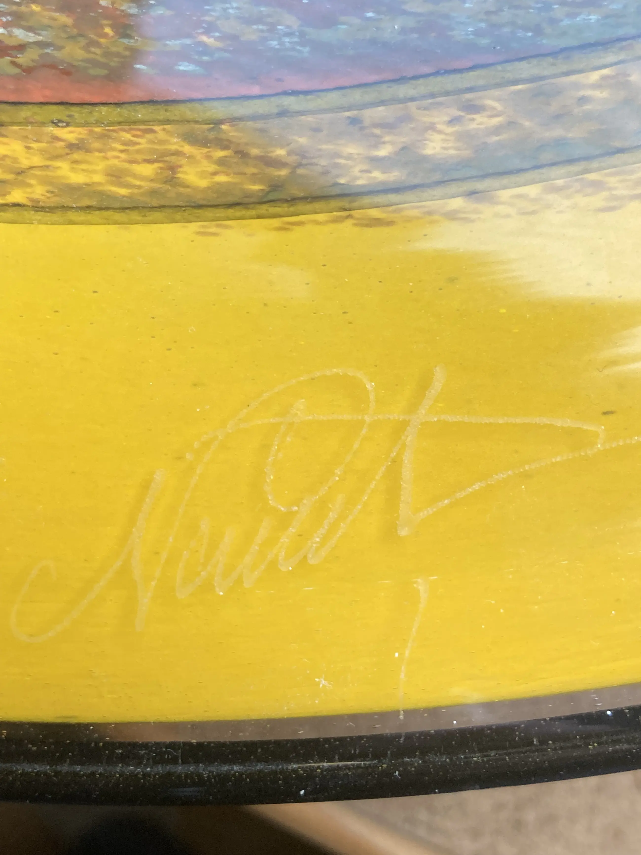 Glazen schaal In kleuren geel, zwart, oranje en blauw. Met aanschafbewijs