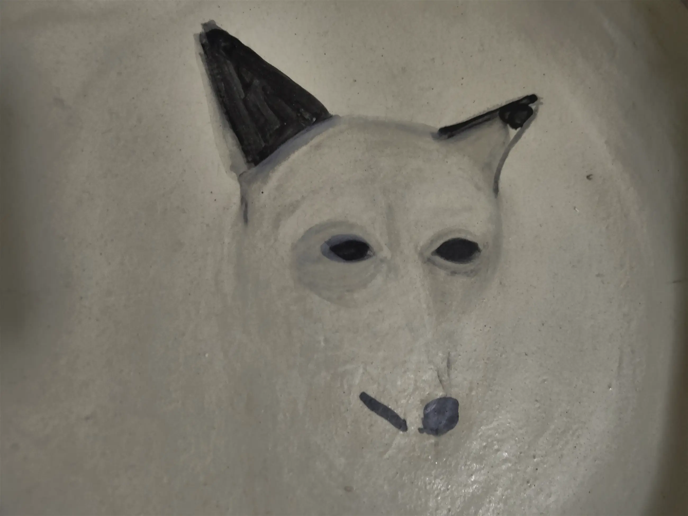 Een mooie keramieken schaal handgemaakt door Irene Grijzenhout met een afbeelding van een soort spitse vossenkop of hondenkop. Geglazuurd en duurzaam beschermd.
